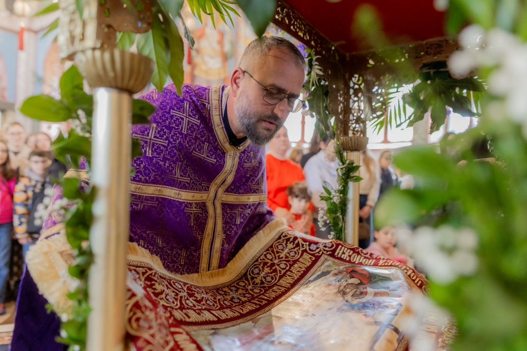 Потом је са почетком у 16 часова служено вечерње богослужење са изношењем Плаштанице. Мноштво Младеновчана је дошло и наш Храм да би се поклонило и целивало Плаштаницу. Јутрење – Статије је служено у 19 час.