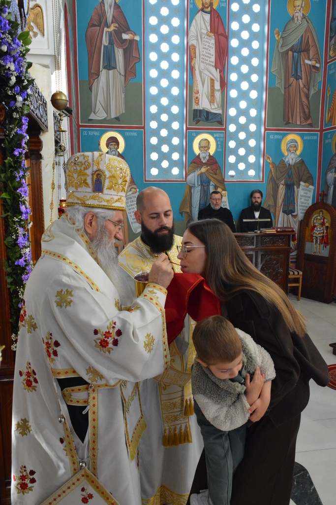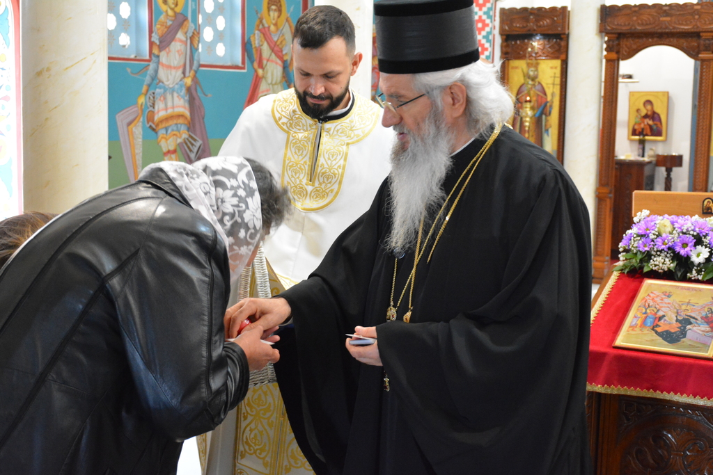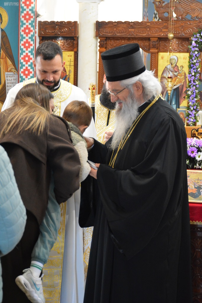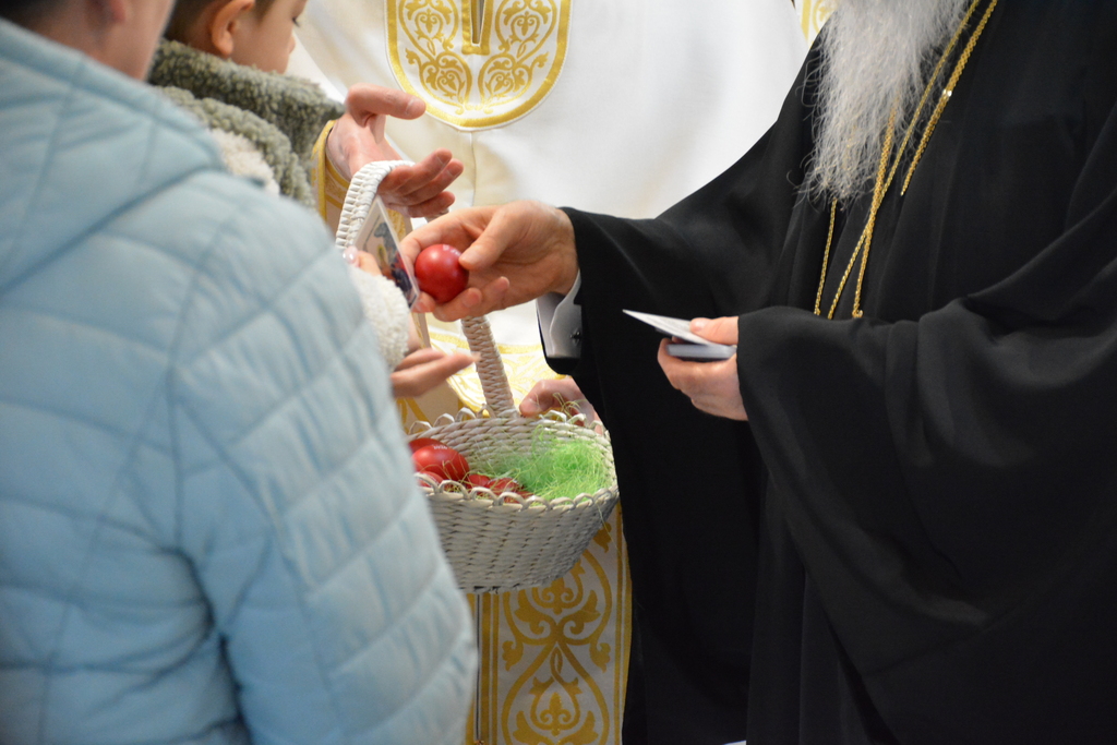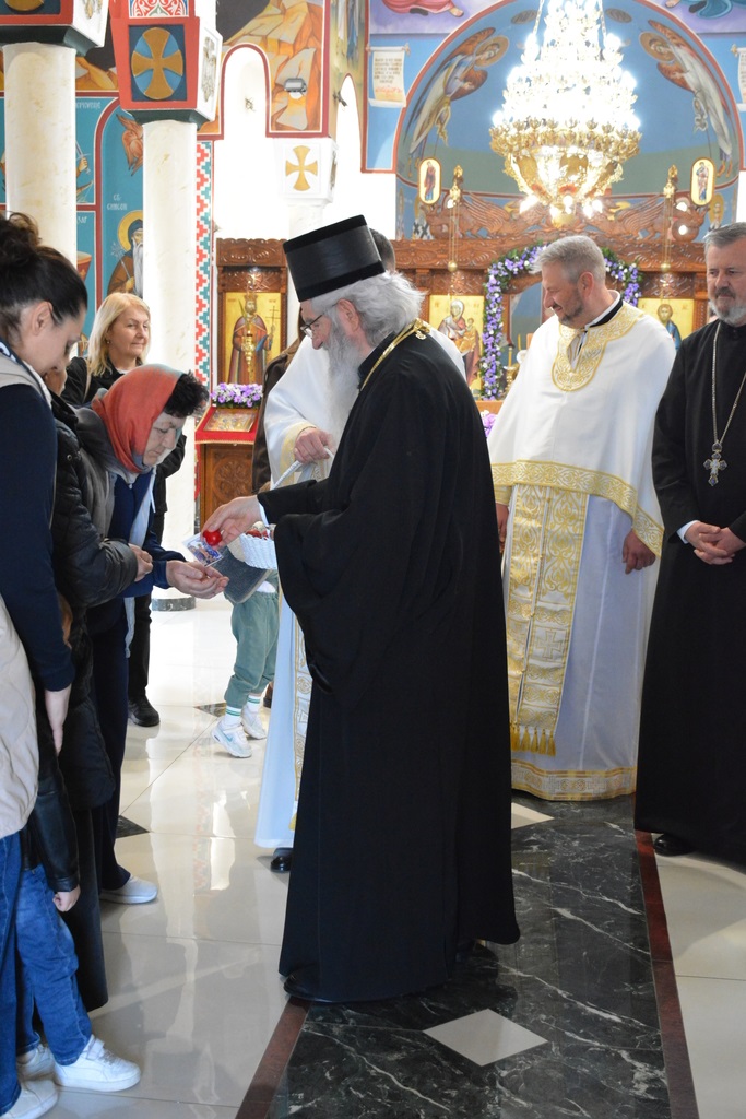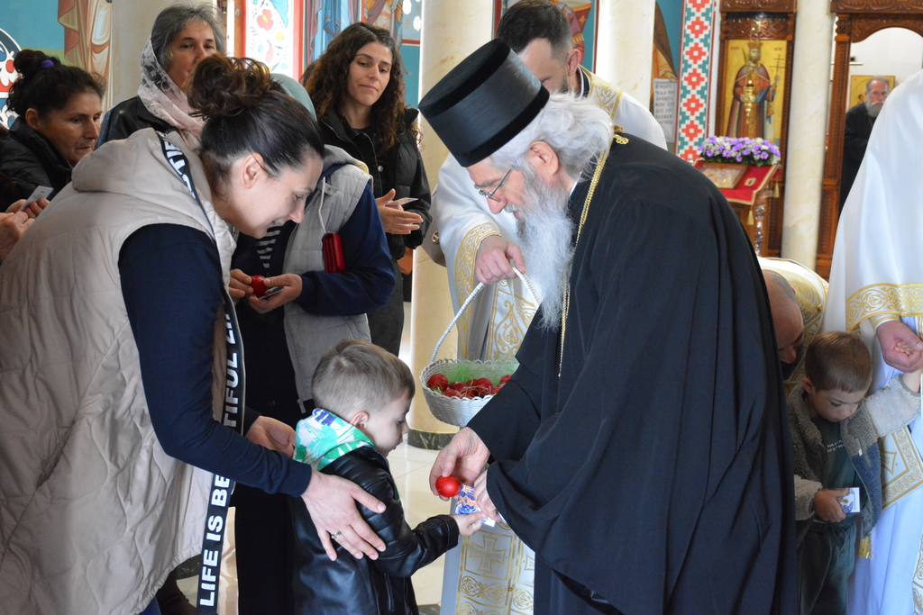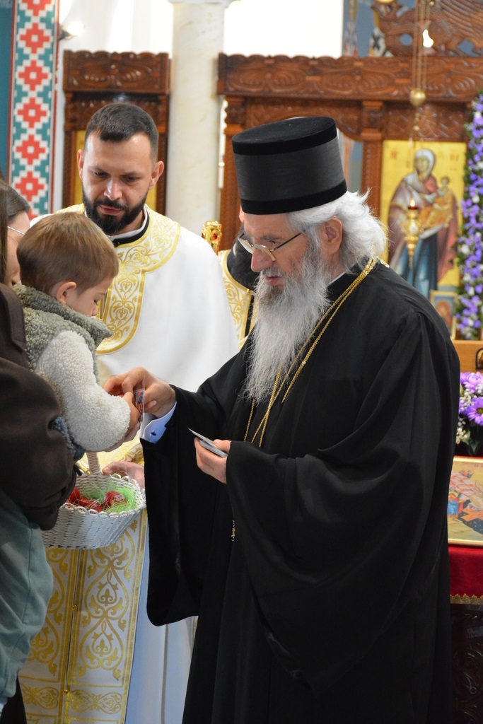 По завршетку Свете литургије, Високопреосвећени митрополит је благословио верни народ, поделивши им иконице и васкршња јаја.