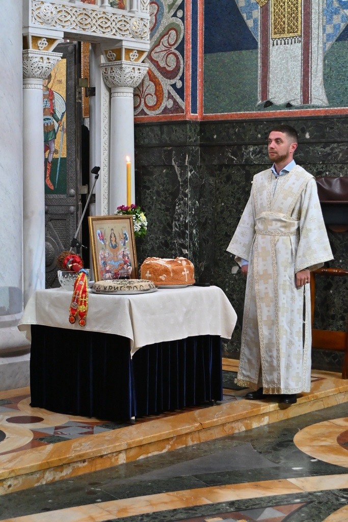 Сво свештенство и верни народ причестио се Светим Тајнама Христовим. На крају Свете Литургије владика је осветио славске дарове и пресекао славски колач. Сабрање је настављено Трпезом Љубави у ресторану „Језеро“ у Тополи.