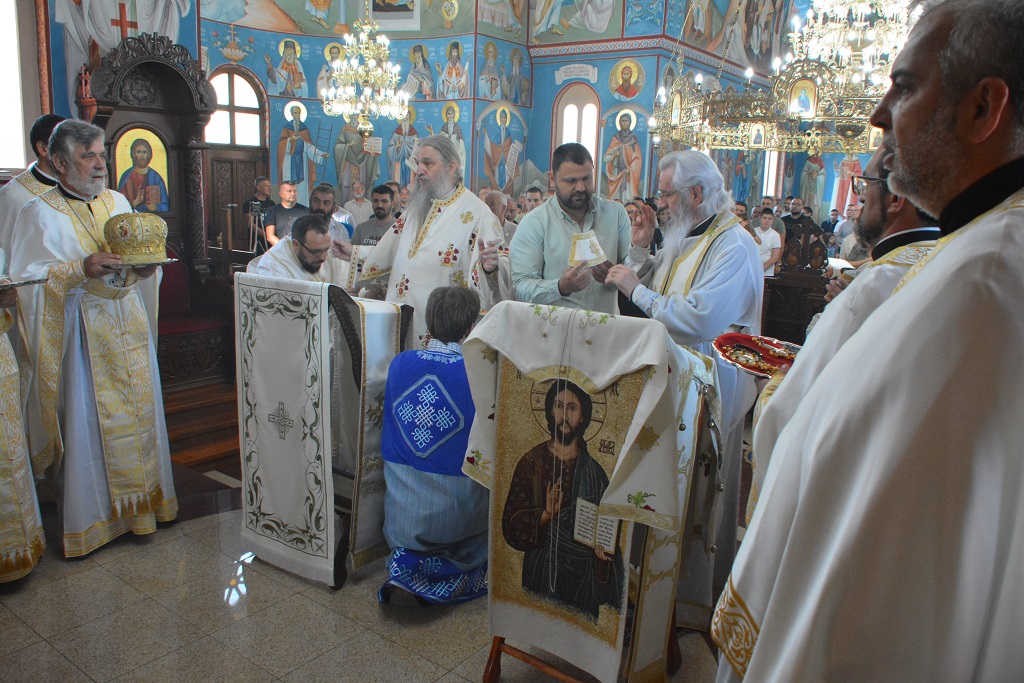 "Високопреосвећени Владико Јоване, уважено свештенство овога Светога храма, браћо и сестре, нека нам молитве које смо упутили Господу Богу буду свима на здравље и спасење како нама овде у Светом Божјем храму, тако и свим нашим милим и драгим. На данашњи велики дан, ово се поклапа са историјом овога краја, и ми смо, кад пролазимо кроз Орашац и видимо Тополу и Опленац и видимо овај историјски крај, ми смо узбуђени мислећи на нашу историју, колико је она богата и сложена и које је она нама до дана данашњег донела велике поуке. Тако исто историју Светог Апостола Петра и Апостола Павла и свих Светих Апостола добро размортрити јер говори о почецима хришћанске ере, оснивању цркве и постављања пастира. Сваки Апостол је имао благодат Духа Светога. Зар није Свети Илија имао Духа Светога? Имао је али је наменио свој живот благодаћу Светога Духа, пророштву и поучавању. Зар Свети Јован Крститељ није имао Духа Светога? Имао је, али и њему је та благодат била намењена да он крштава, да поучи, да окупља, да прима исповест. Имао је пуно Духа Светога Свети Јован Крститељ али није био Апостол. Међутим, Апостоли су прво били дванаесторица које је Господ Христос одмах после свог крштења окупио око себе и назвао их Дванаесторицом. Поучио је Свете Апостоле и рекао Ви ћете добити посебну мисију и посебну благодат, имате посебну намену. Питали су: „А која је наша намена?“ Да посматрате добро мој пример служења народу и Богу, моју смиреност и моју спремност на жртву, а у исто време и моју велику веру у промисао мога Оца, а то је да се све оно што је лоше на крају заврши у слави Божјој према Његовој промисли. Тако су Свети Апостоли прво били збуњени када су видели како су Господа Исуса Христа ухапсили и шибали и вређали и понижавали и на крају одвели на Голготу и разапели. И Апостоли су се уплашили, међутим они су се много обрадовали када су видели Васкрслог Христа и тада су разумели све Његове речи и тада је Господ њих још једанпут четрдесет дана на Земљи поучио и рекао: „Овај свет треба преображај, треба обнову“, то видимо данас ми у вама драга браћо и сестре, вашим доласком овде у храм Божји, сви ми вапијемо за преображај, за обновом. И Господ Христос је рекао како ћемо да преобразимо овај свет? Морамо да поставимо пастире. Мора народ кроз своје пастире да зна где не сме да иде, а где треба да иде. То видимо данас у дивљем свету, тамо где су резервати, можемо још колико да будемо збуњени када видимо лавове, тигрове, хијене и јагуаре како нападају оне мале животиње, зебру, импалу, биволе, јелене, али нико није зебри рекао ма није ти овде место, немој овде да будеш, овде долази лав, он ће да те напада и њих тројица, четворица ће и у хајци да долазе, да праве чопор. Тако је то било раније у апостолско време, без реда, дивље и Господ Христос је поставио Апостоле у ту сврху, да би народу показали овде је замка, овде не смеш да дођеш. Ништа трагичније и тужније није него кад видимо како се зебра онако лепа са очима шета и храни, а од позади долази крвожедни тигорови, лавови, а најгоре су хијене. Њих препознајете по крвавим носевима, кад они једном цапе са својим зубима тешко зебри, а уопште и другим животињама да се извуку. Много паралела можемо да извучемо, много можемо да повучемо лекција и поука шта значи живот кад не постоји цркви, шта значи живот кад не постоје пастири, а црква је место саборо