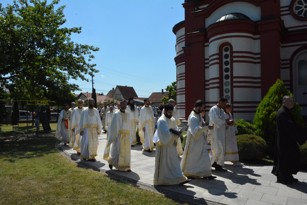 "Браћо свештеници, браћо и сестре, срећан данашњи празних Светих Апостола Петра и Павла, срећна слава овог предивног храма, срећна слава братству, срећна слава свима вама који сте се данас овде сабрали да се данас Богу молимо и у исто време да замолимо Свете Апостоле Петра и Павла да се они данас за нас моле. Нема већега дара, браћо и сестре, који је Бог могао дати човеку него да служи Свету Литургију, него да учествује у Светој Литургији, зато за сваког хришћанина треба да буде живот од Литургије до Литургије. То је велика радост, а ми данас имамо још једну радост а то је што је Његово Преосвештенство епископ швајцарски данас овде са нама, што се данас са нама овде Богу моли, што нам доноси благослове своје епархије, па у име свих вас и своје лично име замолио бих драгог ми брата у Христу владику Андреја да нас он из своје богате ризнице беседништва али првенствено из богате ризнице живота по Христу и у Христу да нам каже неку поучну реч, да нам још више својим речима дочара лепоту Литургијску. И зато браћо и сестре, понављам, бити у цркви, а не бити на Литургији онда то није право хришћанство. Хришћанство је литругијски и црквени живот. Па ето, драги владико добродошао, благослови нас и поучи нас".