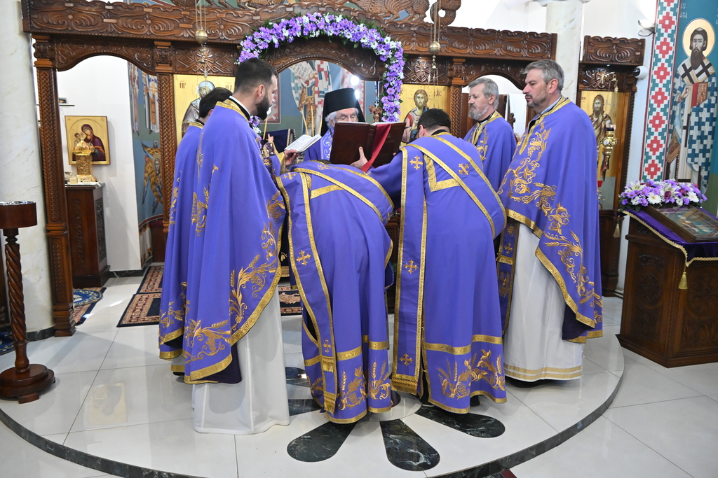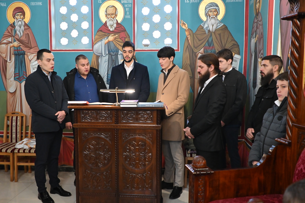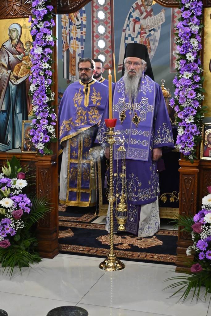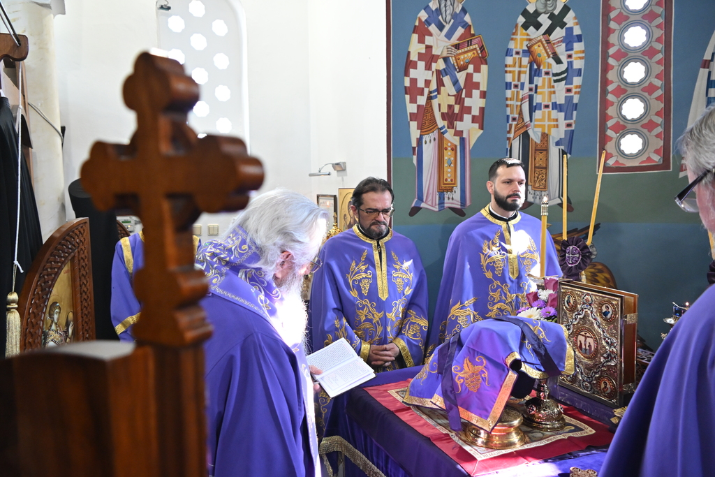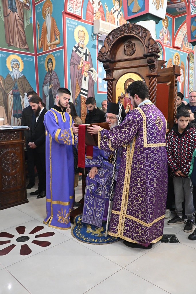 Високопреосвећеном митрополиту саслуживао је архијерејски намесник лепенички, протојереј Срећко Зечевић, протођакон Иван Гашић, као и братство овог светог храма.