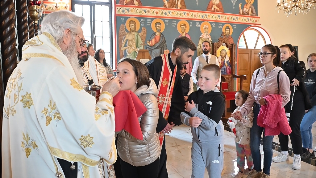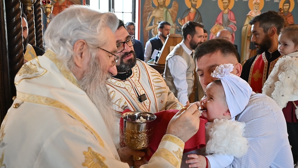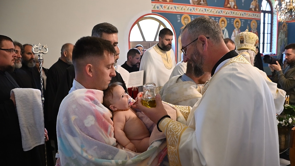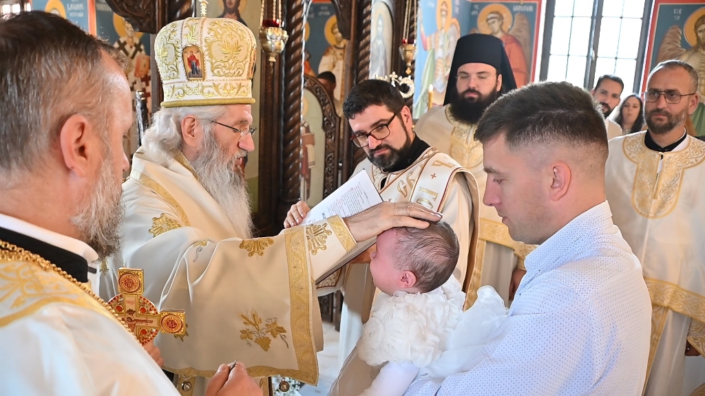 И ето ми данас овде, браће и сестре, поред те велике радости у овоме храму, у којем служимо Свету Литургију, а Литургија је радосна, радост и истина, ми данас такође имамо једну велику и заиста могу казати свету радост, зато што смо данас крстили малу Марту. И она је данас крштењем постала члан Цркве. Ово је њено духовно рођење. Данас, кроз Свету Тајну крштења, наша Марта примила је управо тај небески дар. Духа Светога. Запечаћена је. Печат дара Духа Светог. Помазана је Светим миром, које треба да симболише оно што каже апостол Павле, да су хришћани мирис Божији. И зато помазујемо новорођенче да мирише душа новорођенога. Јер дете, шта је дете? Свети Јустин Ћелијски каже, дете је парче неба на земљи. Оно мирише. Није огреховљено. Није искварено. Нема гордости. Нема сујете. Него је над дететом дах Духа Светог. И зато, браћо и сестре, да се помолимо Богу, да Бог учврсти нашу Марту у веру и православљу. Да је, браћо и сестре, одржи, да је онај анђео које је данас примила, да је он води и руководи. Данас преузимају дужност не само родитељи на првом месту, родитељи наше Марте, него и кум. Али није само кум, и родитељи. Сви ми данас смо предузели на себе одговорност за њено спасење. Јер смо сви одговорни једни за друге, браћо и сестре. И немојмо, то често говорим кад крштавам, немојмо да се заваравамо па да кажемо ма ово је дете мало, шта оно зна, шта ћу ја пред њим да радим, шта ћу да говорим, како ћу да се понашам. Немојте тако, браћо и сестре. Немојмо тако боље рећи. То дете, како каже Свети Јован Златоусти, његова је душа као сунђер. А шта ради сунђер кад га убацимо у воду? Купи воду. Па после цеди, што бисмо рекли. Зато смо одговорни, али зато да се молимо Богу да њен улазак данас у Цркву буде на њено спасење и спасење оних који су око ње. Да јој Свето причешће којим ће се она данас причестити, браћо и сестре, буде на спасење.