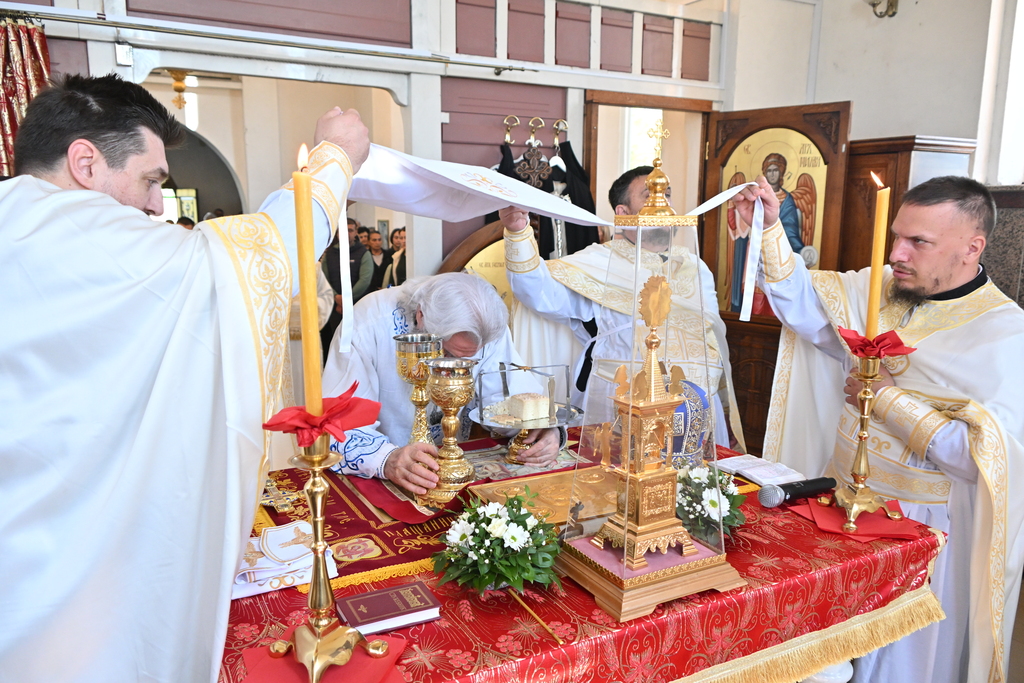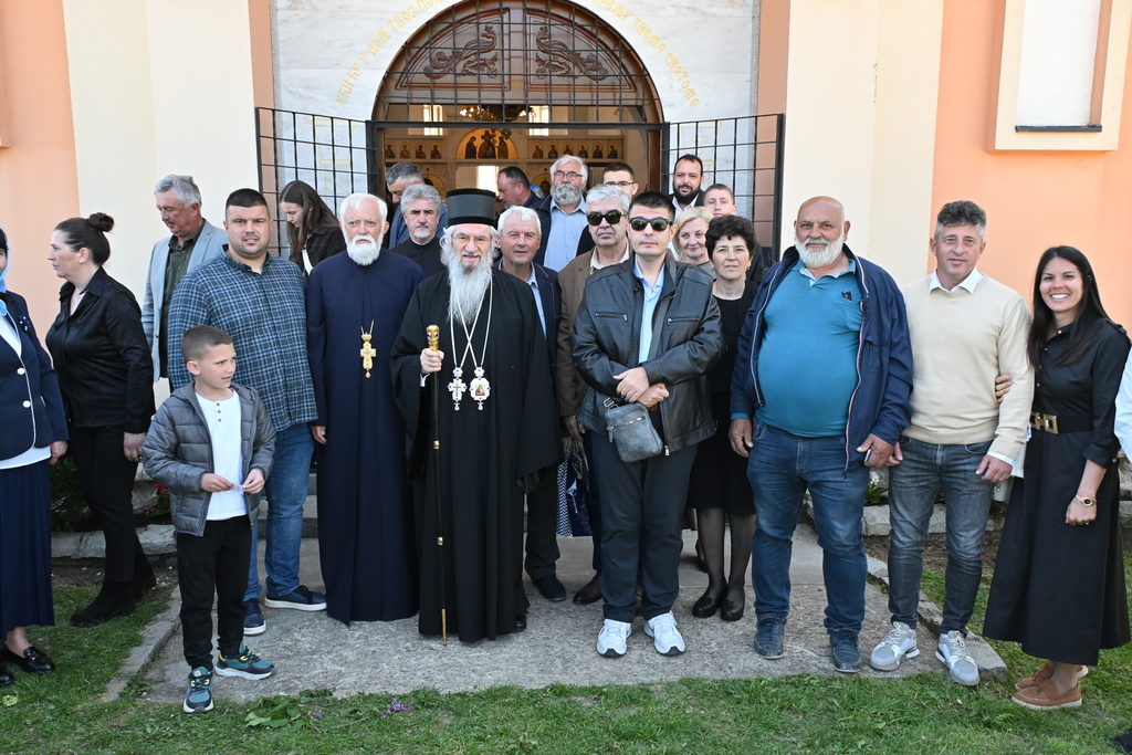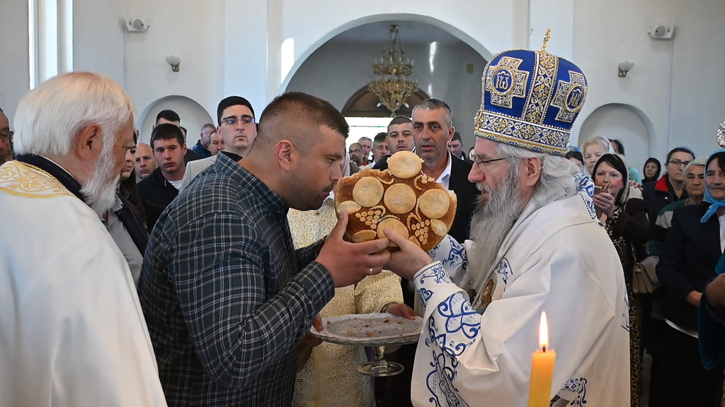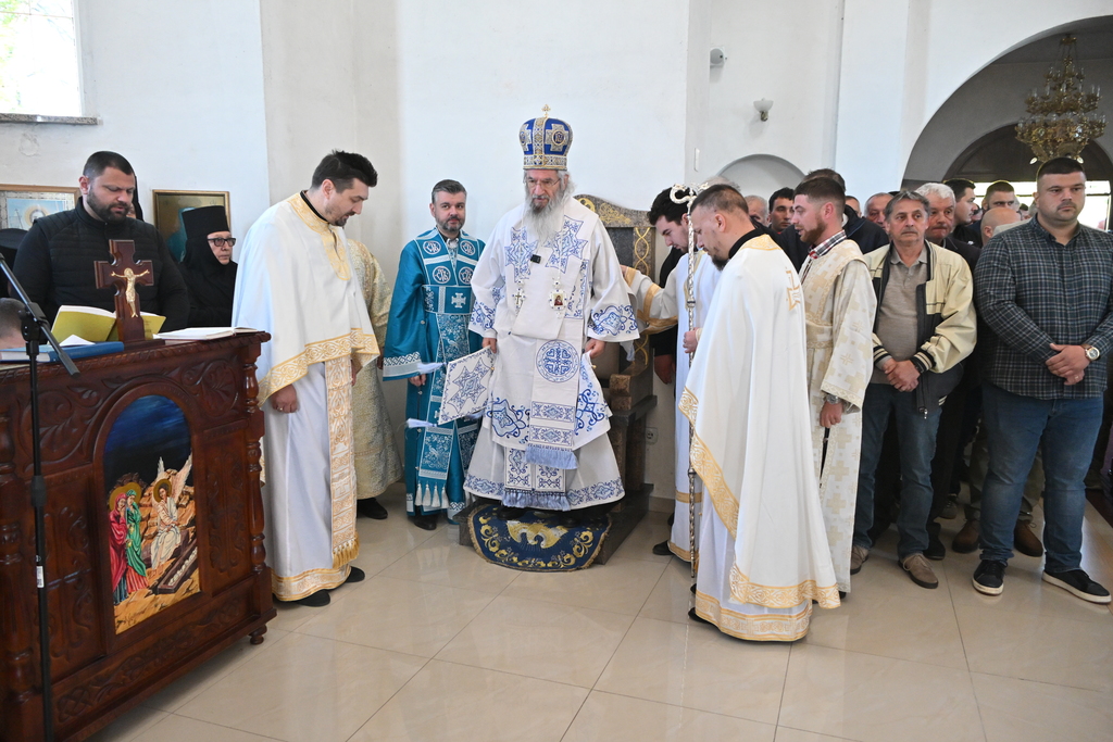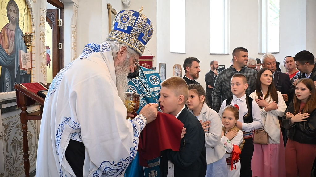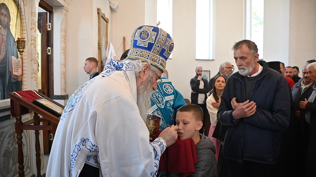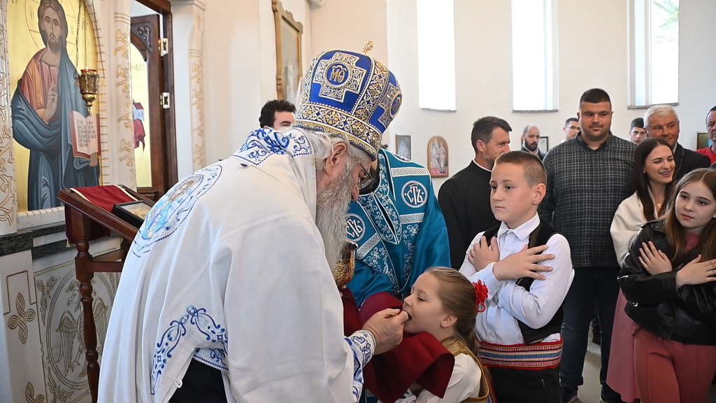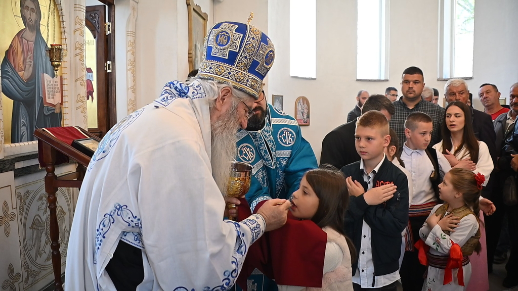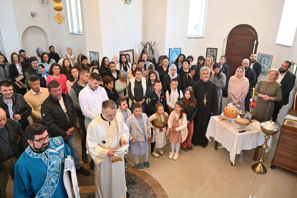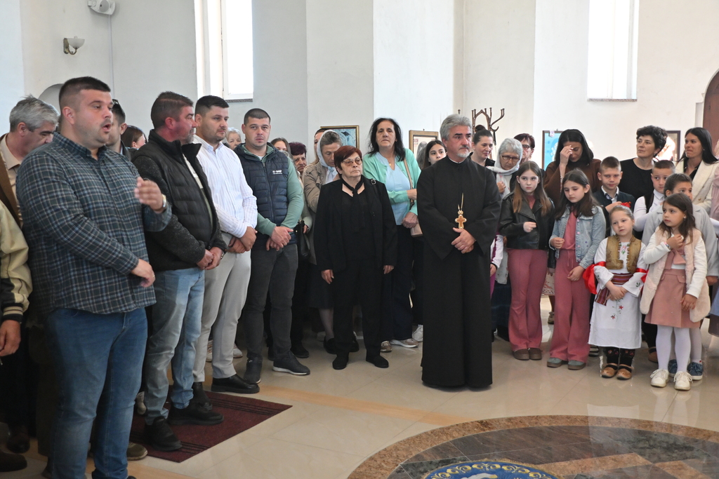 Сабрани народ овог дивног шумадијског села причестио се Светим Тајнама Христовим. На самом крају Свете Литургије, владика је осветио славске дарове и пресекао славски колач, пожелевши свим парохијанима овога места срећну храмовну славу.