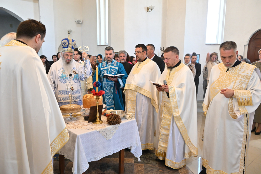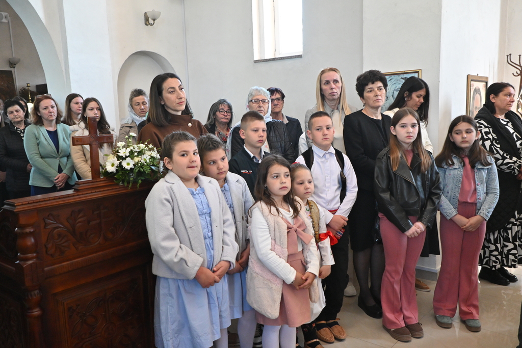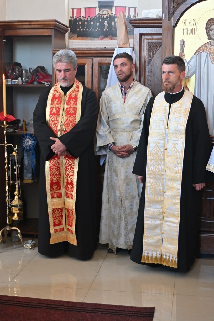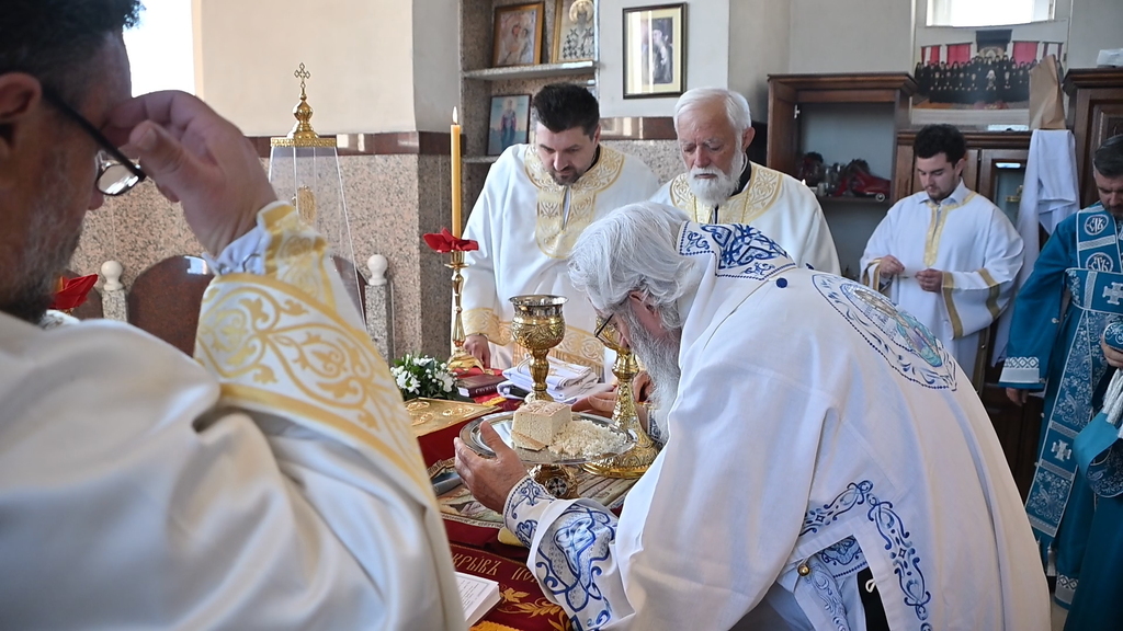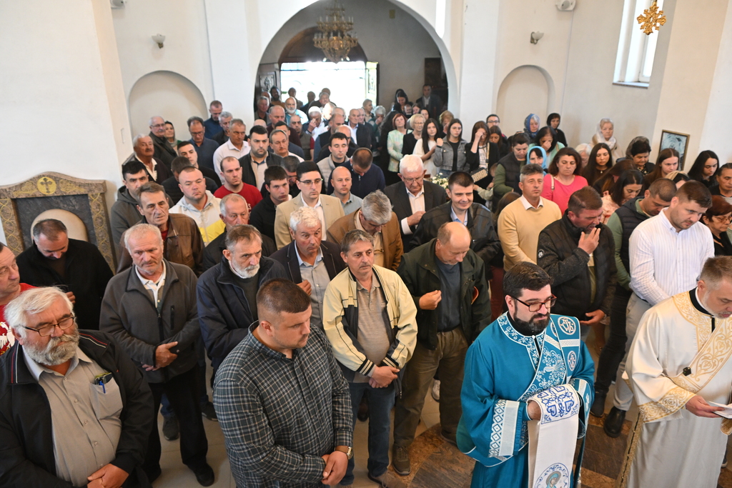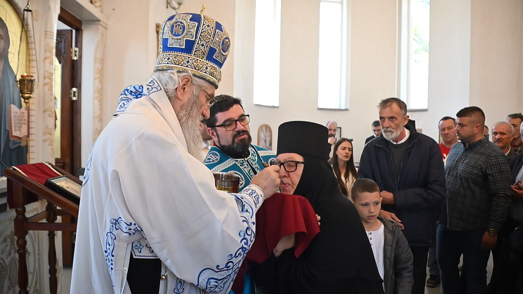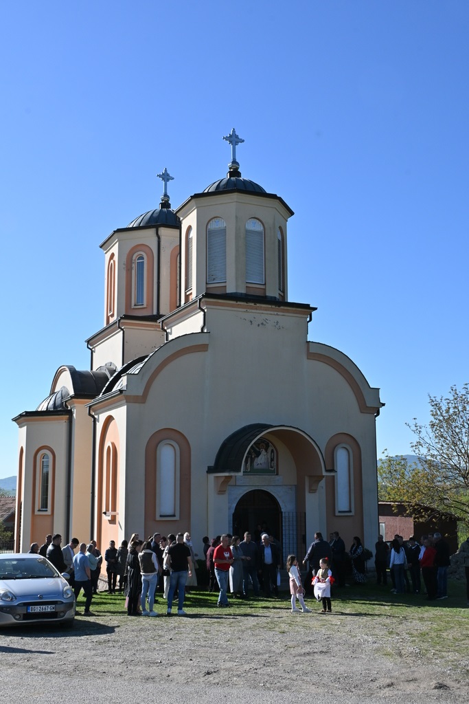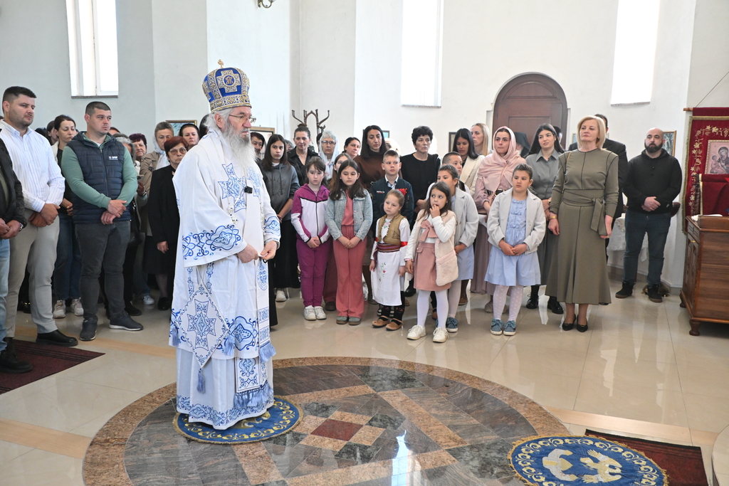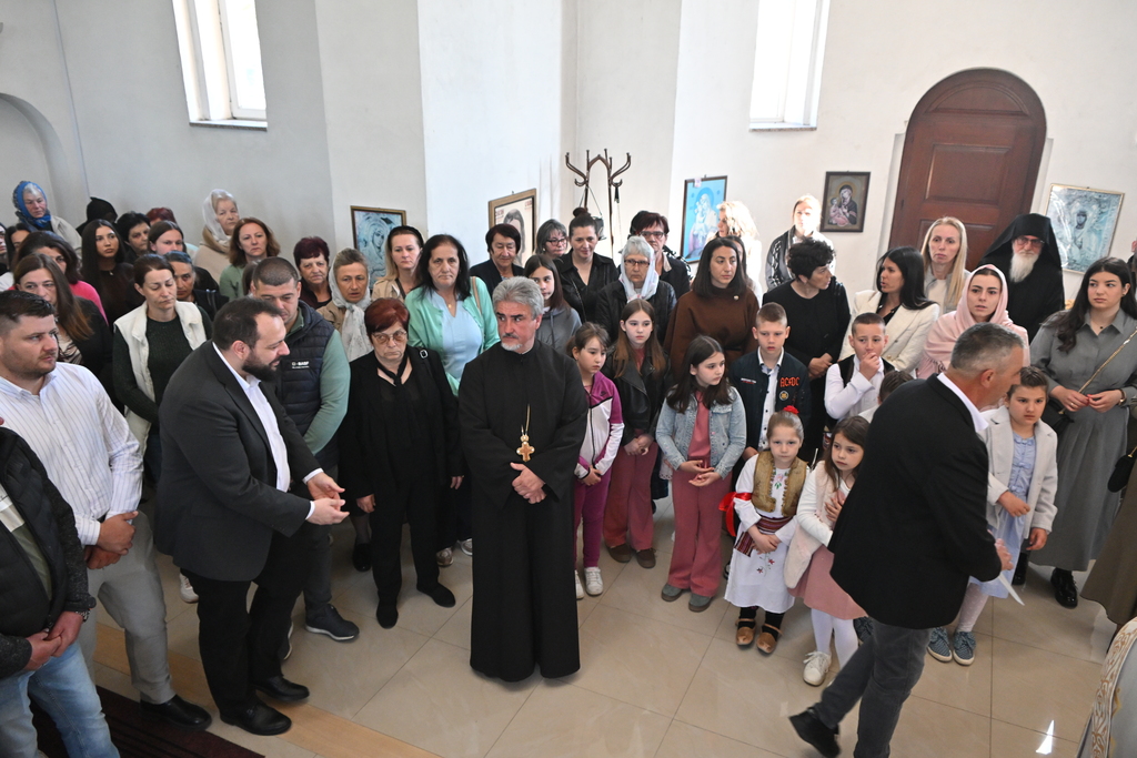 Сабрани народ овог дивног шумадијског села причестио се Светим Тајнама Христовим. На самом крају Свете Литургије, владика је осветио славске дарове и пресекао славски колач, пожелевши свим парохијанима овога места срећну храмовну славу.