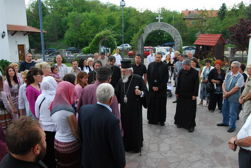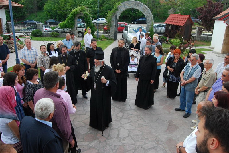 У 14 часова окупио се велики број верника да дочекају свог Архијереја, Његово Преосвештенство Eпископа шумадијског Господина Јована који је пререзао славски колач на општу радост свих окупљених у храму. Владика је после славског обреда одржао беседу у којој је на почетку истакао да се налазимо у данима када се поздрављамо са Христос Воскресе што потврђује веру у вечни живот. То је вера и у Цркву у коју нас је увео Свети Сава. Христос је непрестано у Цркви и потврдио је то апостолима пред своје Вазнесење. Зато смо позвани да уселимо Христа у себе, да би се уселио мир Божији у нас. Бог не усељава у човека обичан мир већ вечни мир. Ко нема мира у себи нема ни Христа у себи. Прави мир је само Христов мир. Христос је кроз Васкрсење победио сваку препреку миру и вери у Њега. Такав мир је стекао и Свети Сава, а ми да би се назвали светосавци морамо стећи мир Божији. Ако нас Свети Сава буде чувао и ако се ми будемо угледали на њега сигурно ћемо ићи путем наше вере и Цркве у Царство Божије.