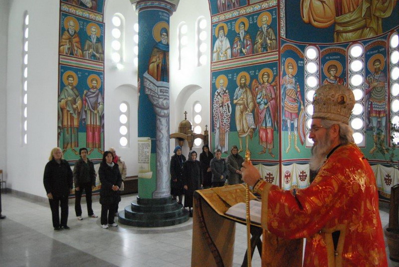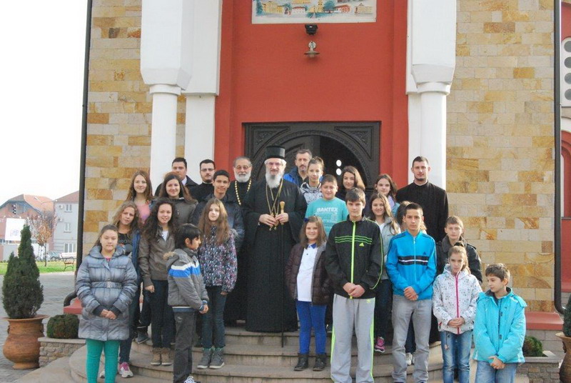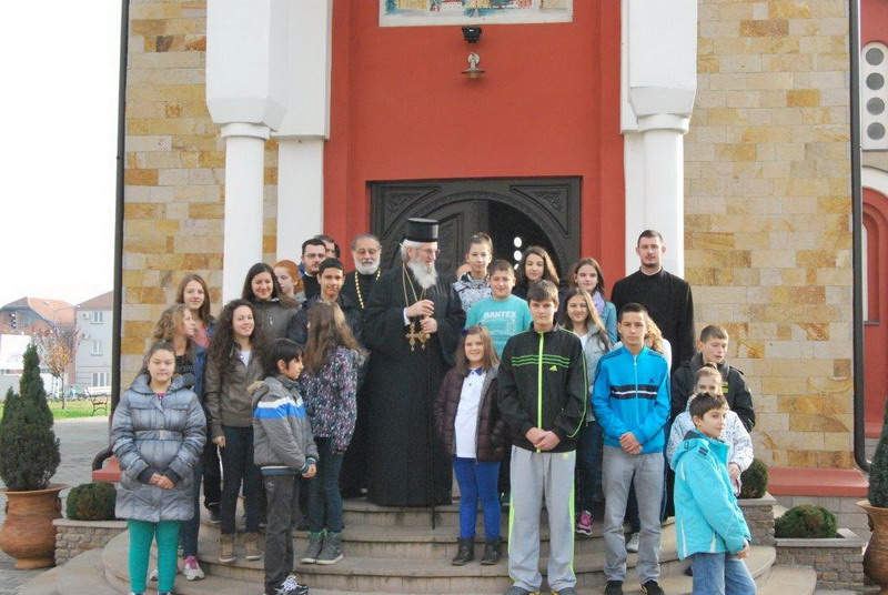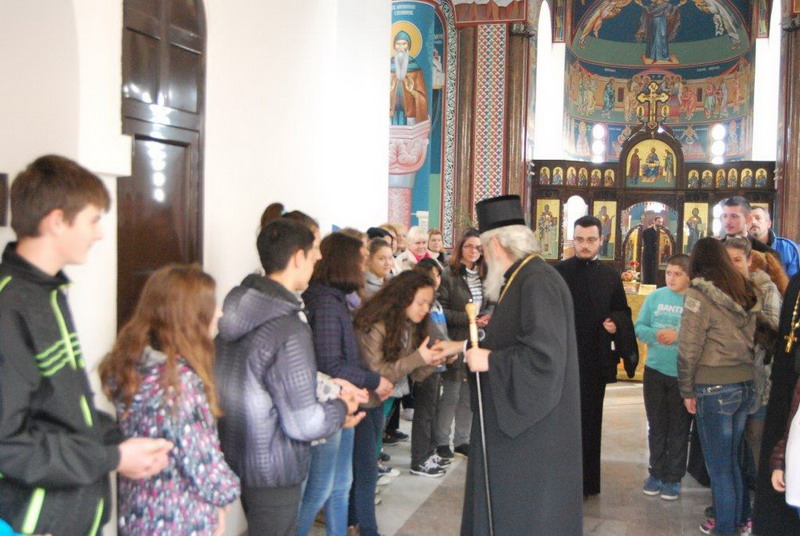 Након Свете Литургије приређено је окрепљење за све школарце који су присуствовали Светој Литургији и који су имали прилике да се боље упознају са нашим епископом.