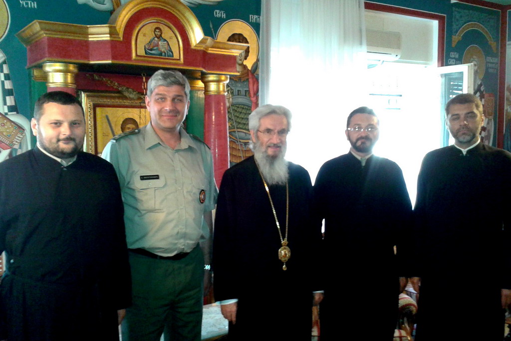 Епископ шумадијски и војни господин Јован примио је начелника Одељења за веру пуковника Сашу Милутиновићa као и војне свештенике капетана Ђорђа Стојисављевића, поручника Предрага Докића и поручника Стевана Стојисављевића, 3. јула 2015. године у Крагујевцу.
