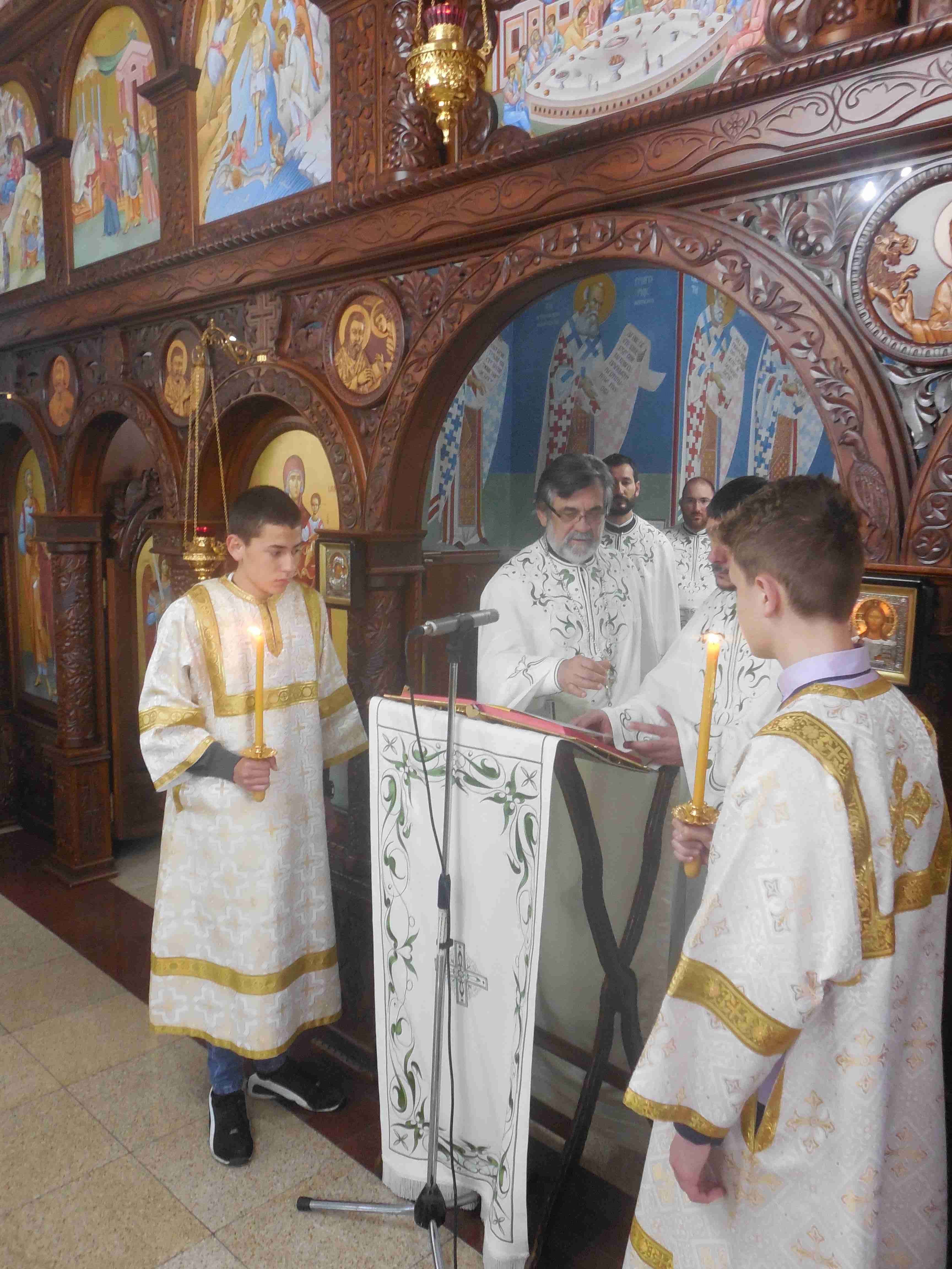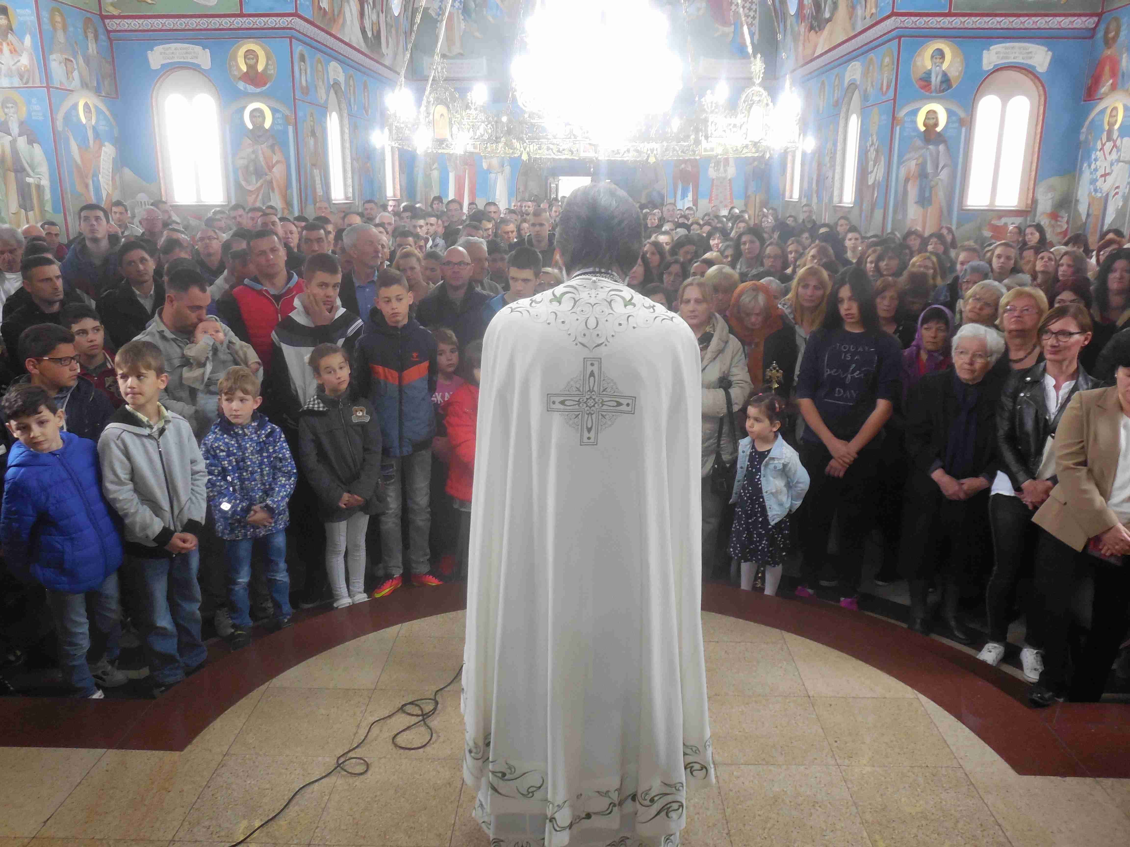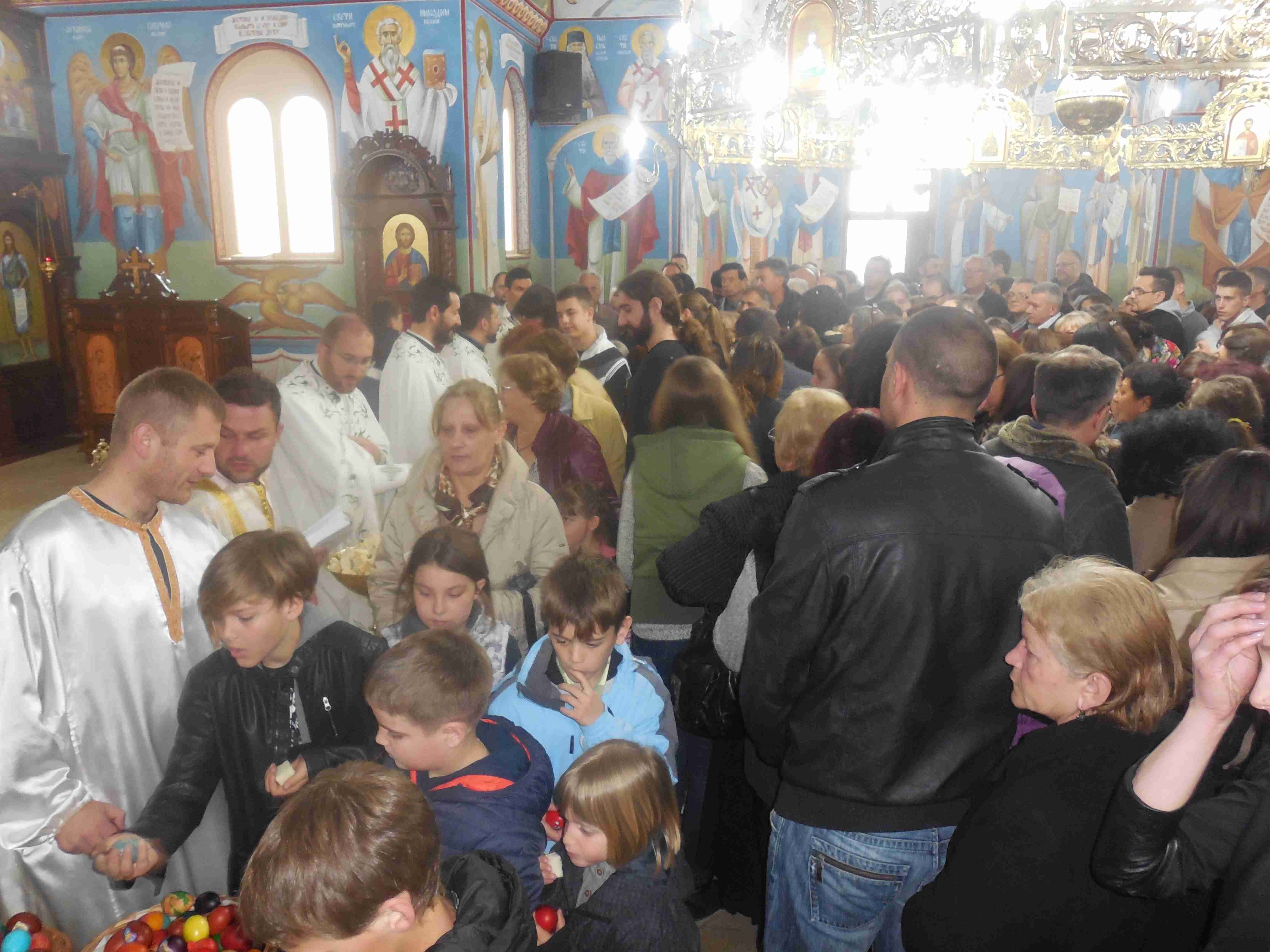Послава празника Васкрсења Господњем започета је Васкршњим јутрењем у поноћ у храму Светих Апостола Петра и Павла. На дан Васкрсења Христовог у храму се окупио незапамћен број верника. Свету Литургију је служио протојереј-ставрофор Мићо Ћирковић, намесник орашачки и старешина храма Св. Апостола Петра и Павла уз саслуживање протонамесника Слободана Раковића и Александра Миловановића, јереја Милоша Мијатовића и ђакона Немање Искића. Сви верујући, међу којима је нарочито био велики број наших најмлађих суграђана, са својим најмилијим су дошли да у заједничкој молитви прославимо овај празник над празницима. За време Свете Литургије, старешина храма протојереј-ставрофор Мићо Ћирковић је прочитао посланицу Патријарха српског Иринеја у којој нам се наш Патријарх честита празник и поучава нас хришћанском начину животу и хришћанској љубави. Потом су верници приступили Светој Чаши и причестили се Телом и Крвљу Господа и Спаса Нашег Исуса Христа. Препуним храмом је одјекивало предивно појање хора „Света Анастасија Српска“ из Аранђеловца.