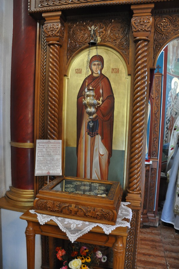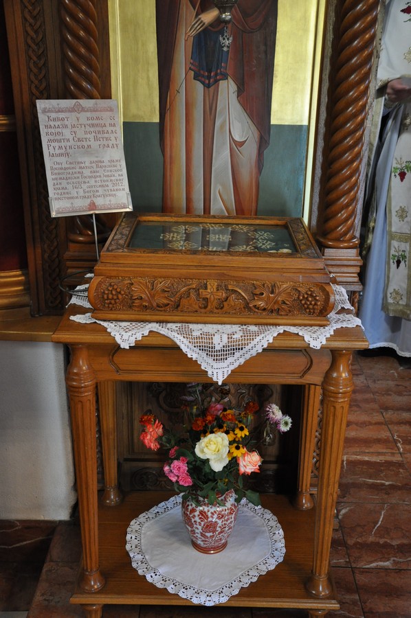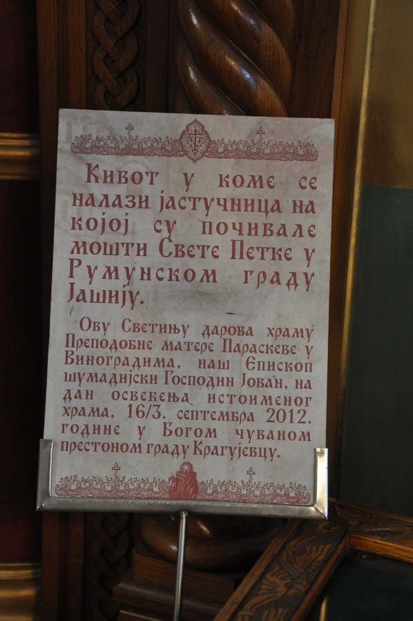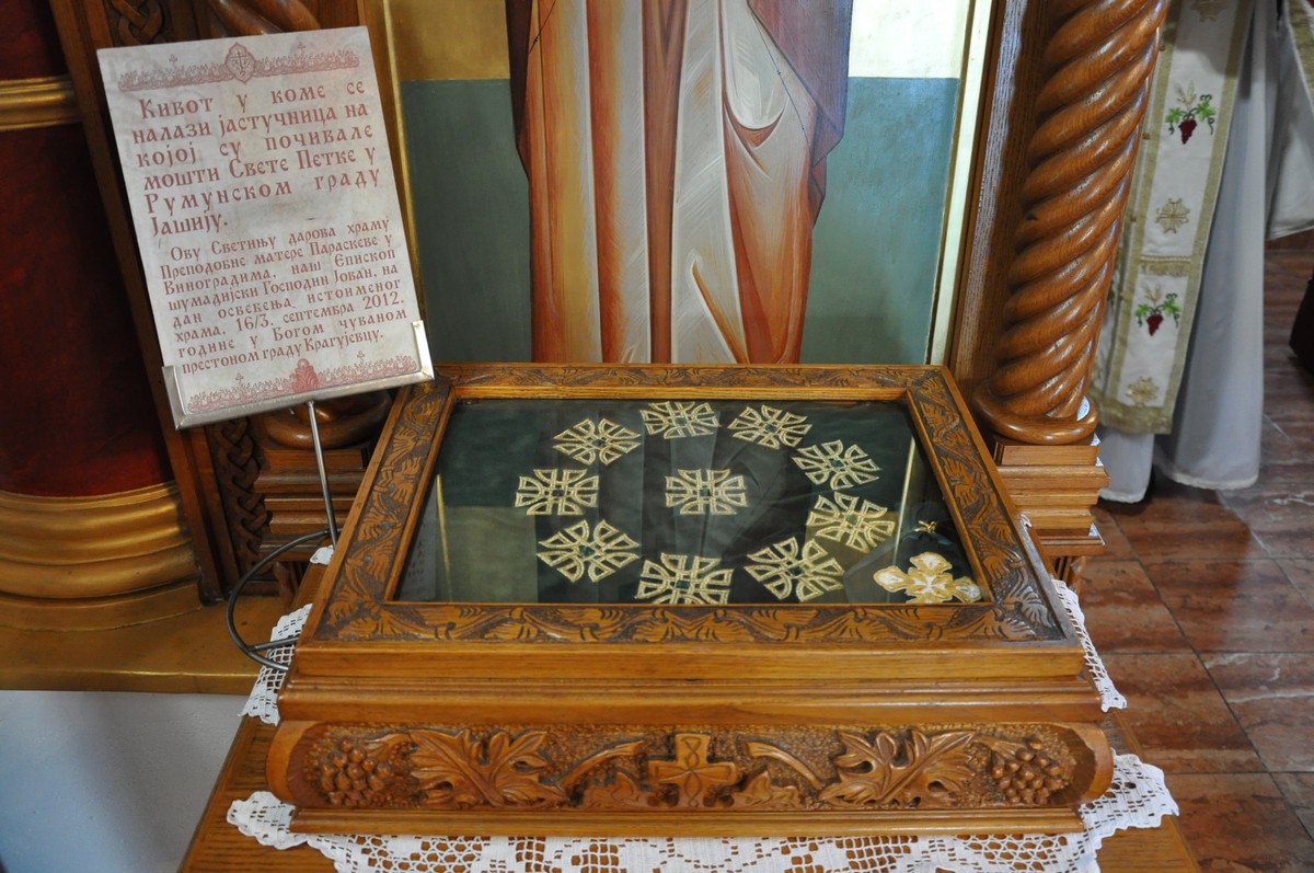 Иначе, храм Свете Петке у крагујевачком насељу Виногради обогаћен је још 2012. године, на дан освећења 16/3. септембра великом Светињом коју је даровао наш Епископ Јован – кивотом у коме се налази јастучница на којој су почивале мошти свете Петке у румунском граду Јашију. Крај овог кивота верници свакодневно узносе своје молитве нашој молитвеној заступници пред Господом - светој Петки.