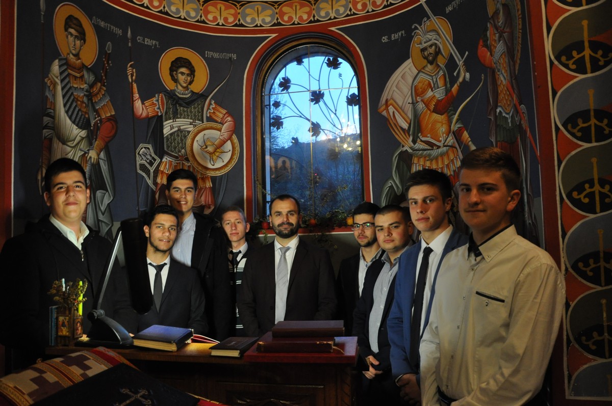 Празнично бденије и литургијске химне појали су ђаци крагујевачке Богословије “Свети Јован Златоусти”, а њихово појање представља плодове вишегодишњег рада професора Немање Старовлаха.