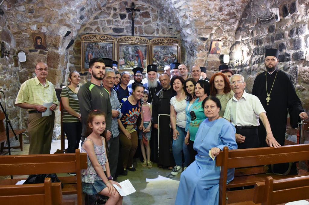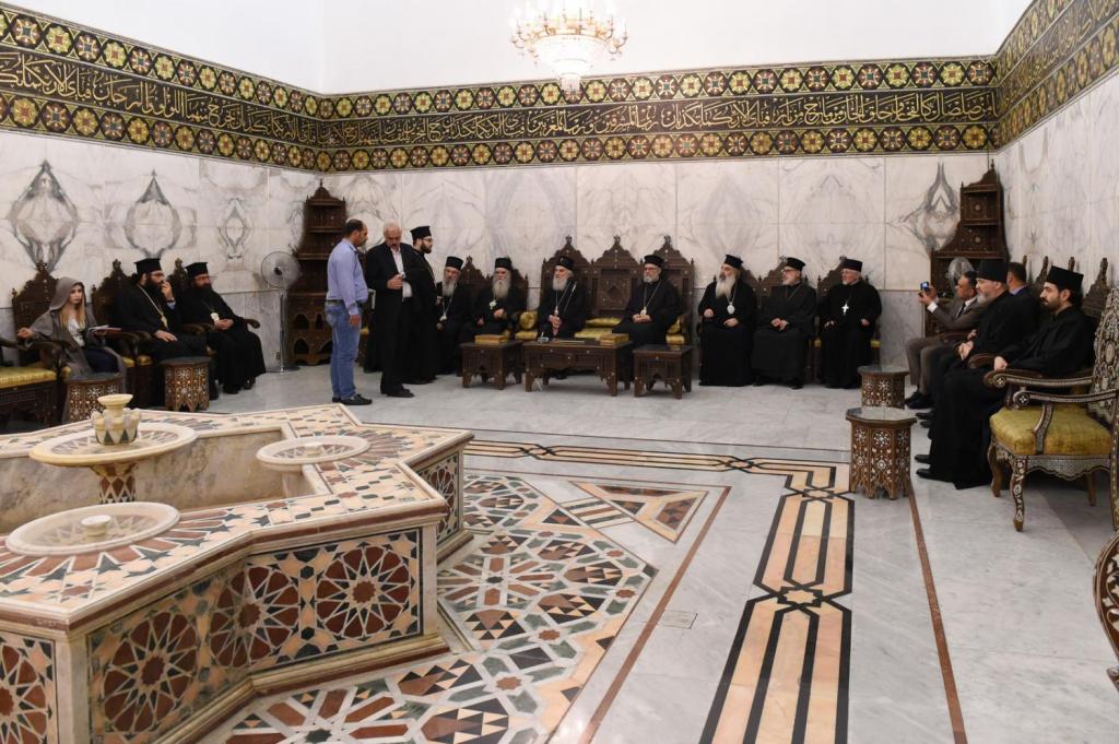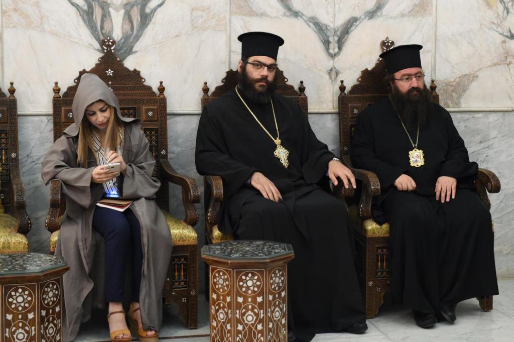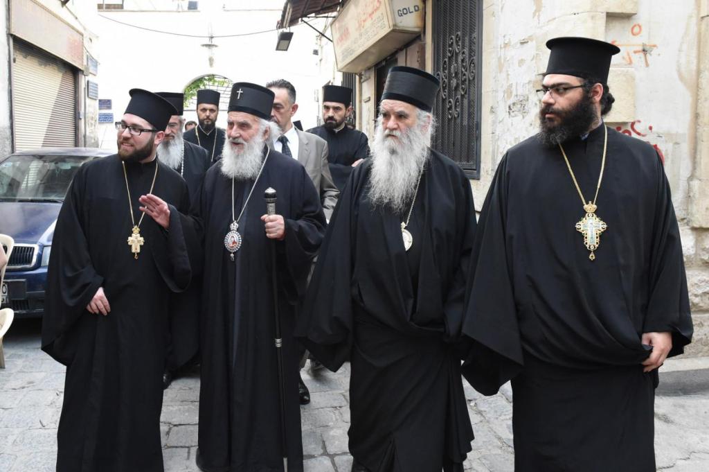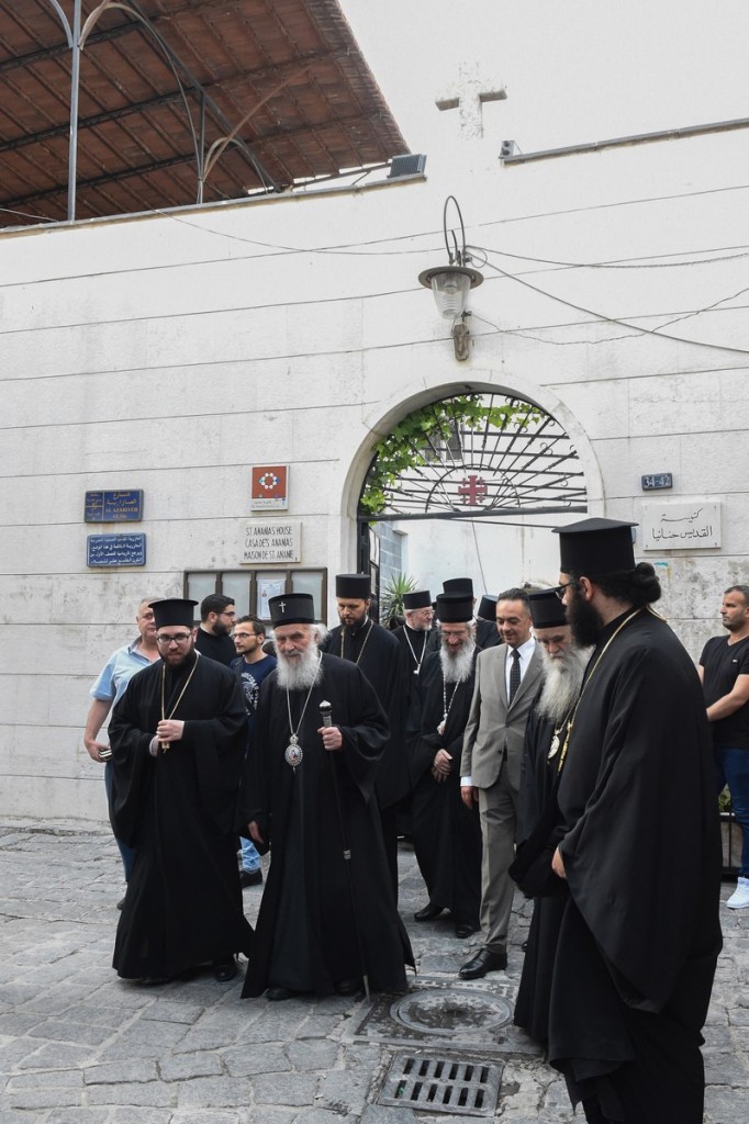 По доласку у Дамаск и кратког одмора, већ око дванаест часова делегација Српске Православне Цркве на челу са патријархом Иринејом уз пратњу упутила се у Саборни храм Пресвете Богородице у Дамаску, познатији као Мајкрамија. Несвакидашњи дочек приређен је Српском патријарху. Поред великог броја верника, православних хришћана - проценитељи кажу више од четири хиљаде - на платоу испред храма патријарха Иринеја дочекао је велики број деце која су носила у рукама заставе и цвеће. Њихове мајке и жене, првенствено, узвикивале су нама непознате речи добродошлице. Касније смо сазнали и њихово значење. Благосиљале су онога који долази у име Господње.