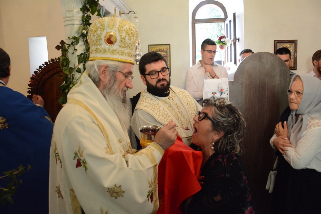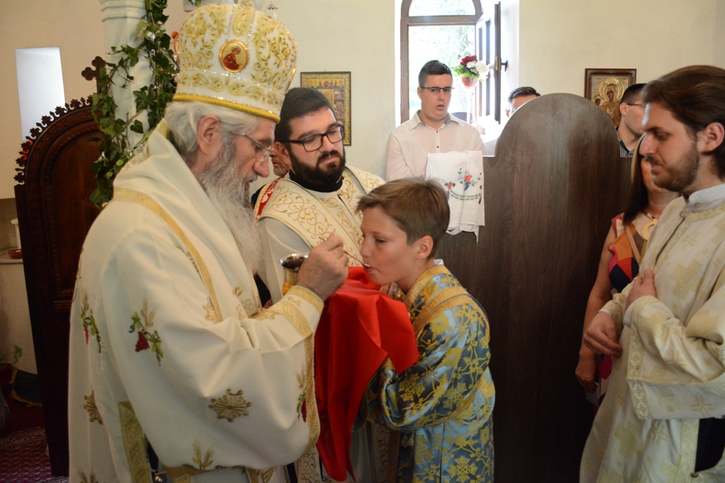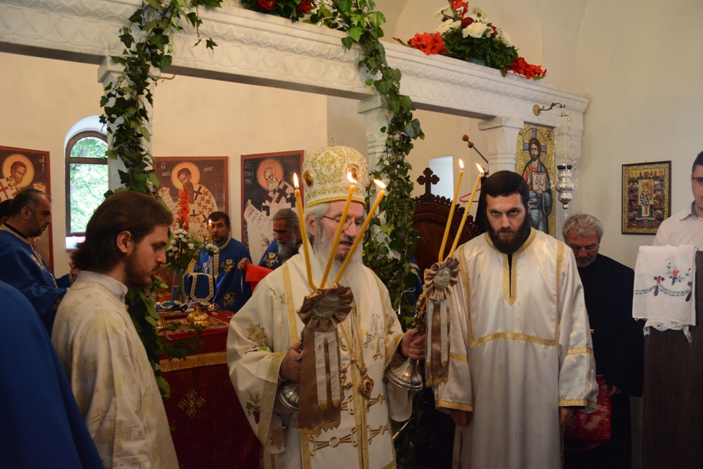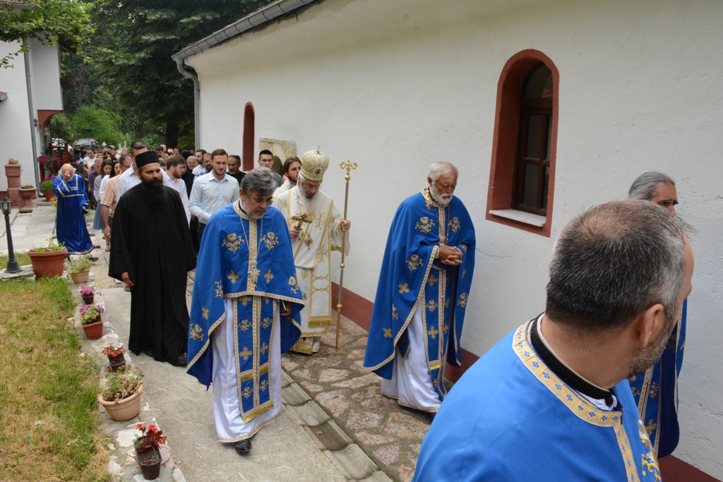Након освећења капеле Епископ је у храму “Светог архангела Гаврила” у склопу манастира служио Свету Архијереску Литургију уз саслуживање Архијерејског намесника орашачког, протојереја-ставрофора Миће Ћирковића, Архијерејског намесника опленачког, протојереја-ставрофора Миладина Михаиловића, протојереја-ставрофора Зорана Алексића, протојереја Љубише Ђураша и Слободана Раковића, протонамесника Ивана Теодосића, протођакона Ивана Гашића и ђакона Александра Бабића. По одлсуженој Светој Литургији Епископ Јован је пререзао Славске колаче братству манастира и особљу Здравственог центра у Аранђеловцу и доделио грамате прознања командиру ватрогасне јединице града Аранђеловца Г-дину Ненаду Миливојевићу и монаху Јоаникију. Епископ шумадијски Господин Јован се затим обратио вернима својом беседом о Светој Тројици. Он је навео да је Дух Свети тај који свакодневно обитава над нама и који нас укрепљује. Епископ је напоменуо да не заборавимо да смо на Светом Крштењу примили Светога Духа и да смо се тада крстили у име Свете Тројице, а и то да све шта се догађа у овом свету се дешава у име Свете Тројице, од Оца, кроз Сина у Духу Светоме. “Благо крштеном човеку који чува Светога Духа у себи” говори Владика јер само тако смо прави хришћани. Дарови које приносимо на Светој Евхаристији су најбољи пример љубави бога према човеку и деловања Светога Духа јер Он тај хлеб и то вино претвара у Тело и Крв Христову. Морамо обратити пажњу на наш живот јер човек који напусти Духа Светога допушта да га преузме дух овога пропадљивога света. Епископ је потом навео да је Свети Јоаникије кога прослављамо кратко био на епископском трону, али да је за тај кратак период показао како треба бити Епископ и како се треба залагати за свој народ и веру хришћанску. Он је био пун Духа Светога. Упркос његовим мукама показао је да свако ко жели да се упусти у рат против Цркве Христове, унапред је пред Богом тај рат изгубио. Владика нас је замолио да се молимо Светом Јоаникију да нас чува и да нам буде водич ка путу Господњем.