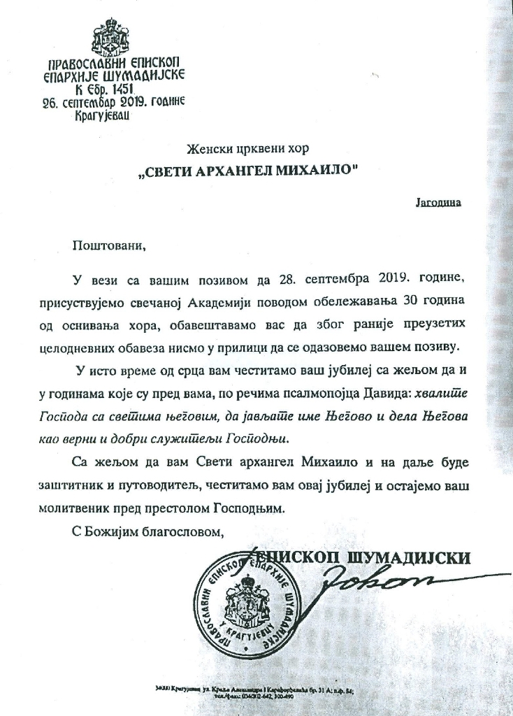 У вези са вашим позивом да 28. септембра 2019. године, присуствујемо свечаној Академији поводом обележавања 30 година од оснивања хора, обавештавамо вас да због раније преузетих целодневних обавеза нисмо у прилици да се одазовемо вашем позиву.