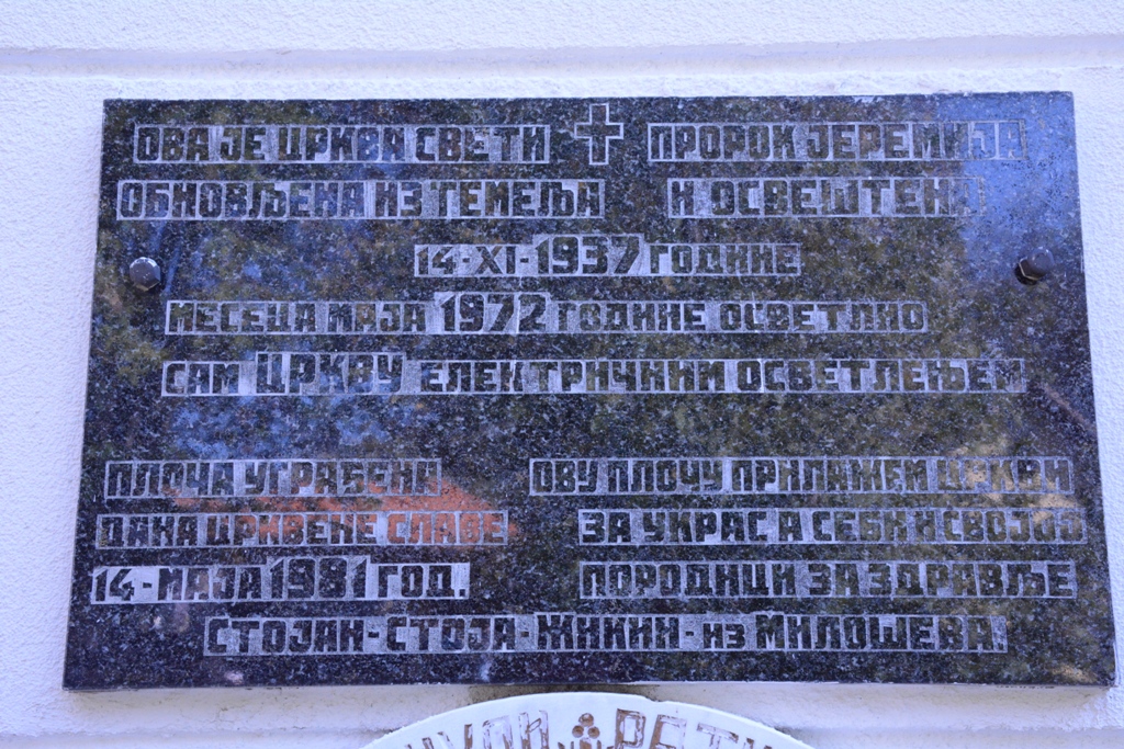 Црква, посвећена Светом пророку Јеремији, потиче из 19. века, из 1863. године, а обновљена је из темеља и освештана 14. новембра 1937. године, јер је прва црква била сазидана од дрвених греда, блата, сламе и трске. То уједно показује жељу Милошеваца да имају светињу за углед, како и данас изгледа, заслугом њиховог пароха, протојереја Светислава Радосављевића и његове попадије Биљане.