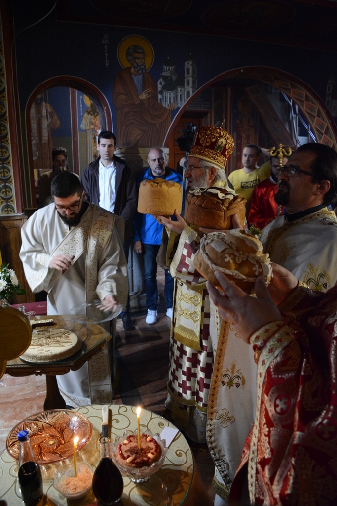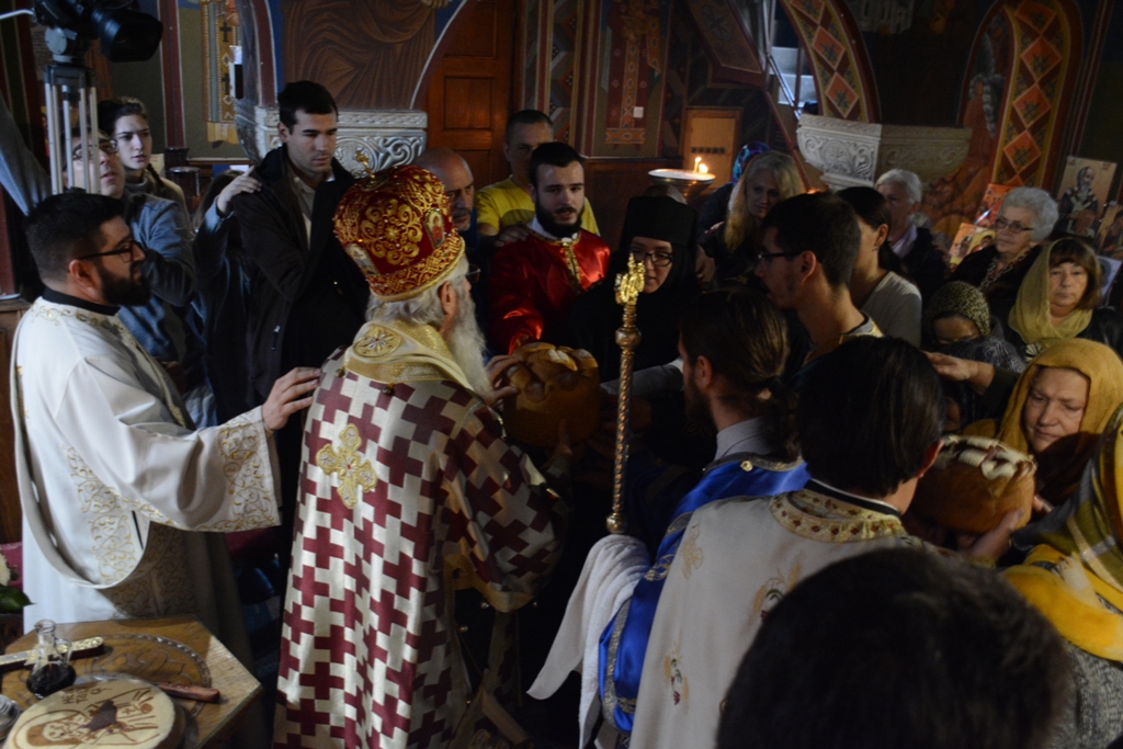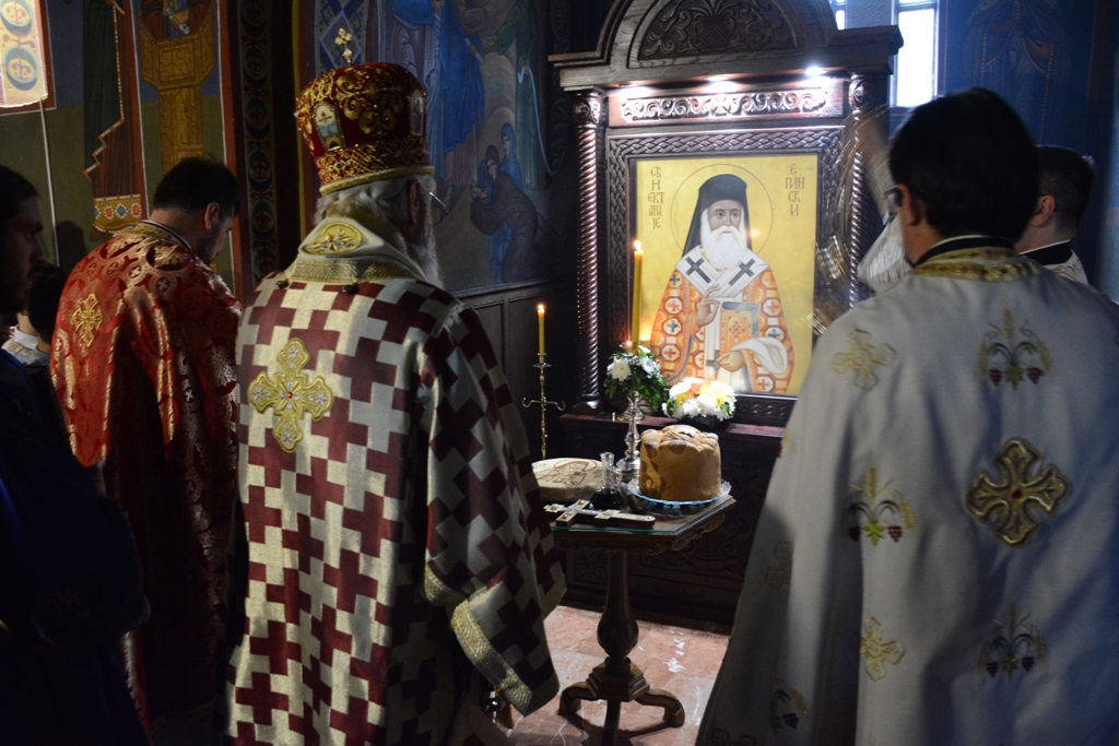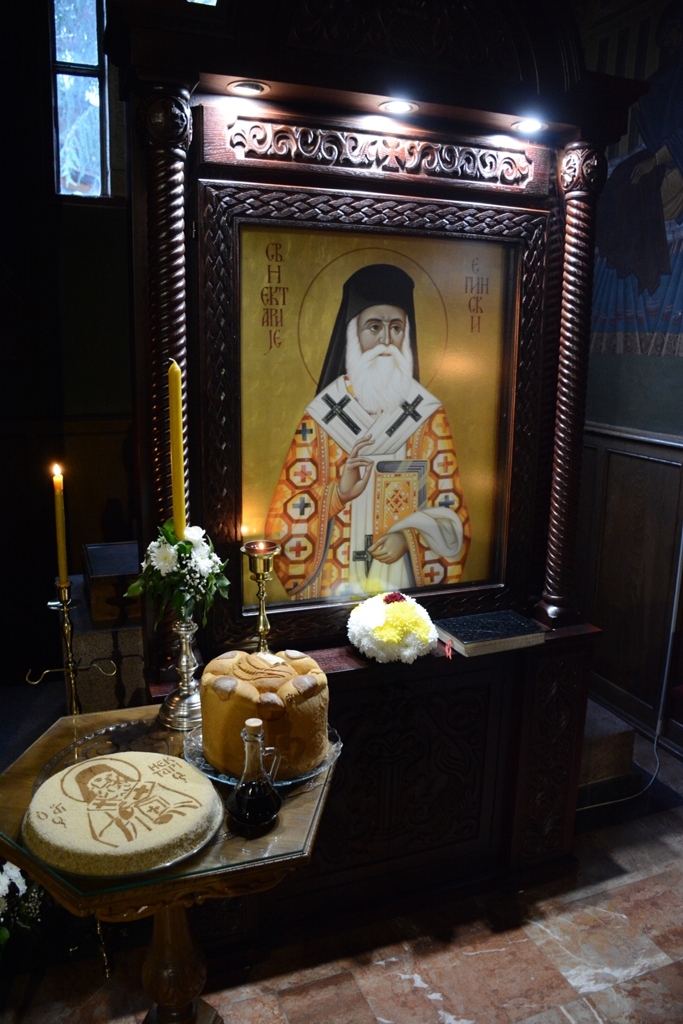 У току Свете Литургије Преосвећени Владика је пререзао славски колач у част св. Нектарија, а по завршетку је свима поделио благослов и иконице овог светитеља.