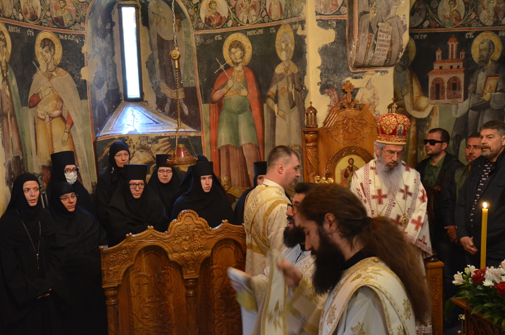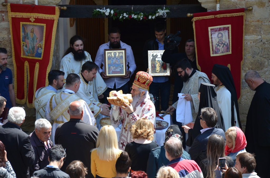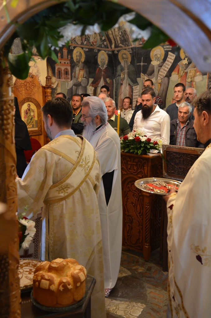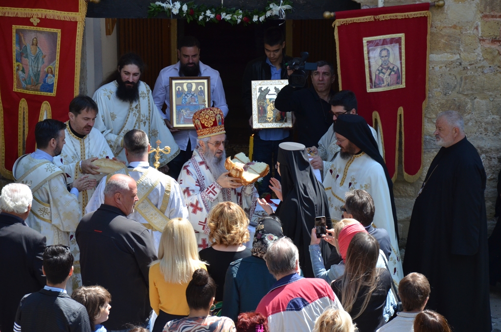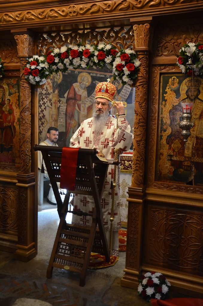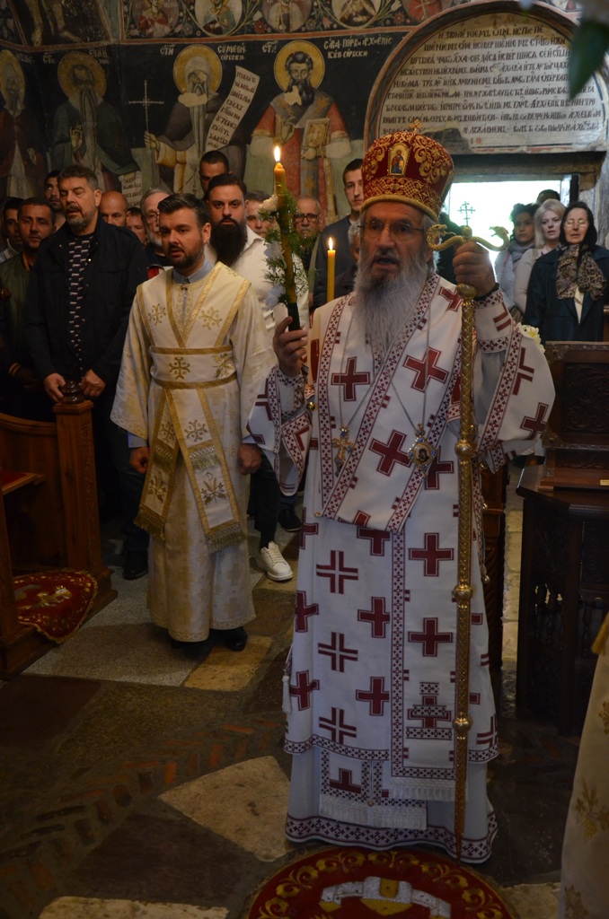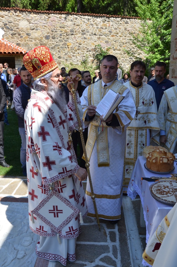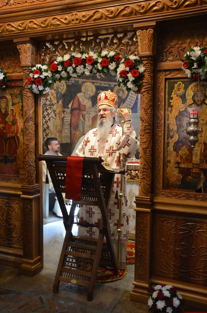 После прочитаног Јевађелског зачала, Владика се обратио надахнутом беседом сабраним верницима подсећајући их да се и даље налазимо у попразнинству Васкрсења Господњег, који је највећи и најрадоснији празник, а потврда томе је што је и после празновања Васкрса, свака недеља је посвећена Васкрсу, то јест сваке недеље празнујемо малу Пасху. Још је указао на превелику љубав Божију према људском роду, која се потврђује кроз Његово оваплоћење, трпљење, страдање и васкрсење. А светитељ кога слави ова света обитељ у којој смо сабрани управо слави сведока Васкрсења Христовога. Те сваки хришћанин који верује у Васкрсење Христово, и у своје васкрсење, који верује у живот Будећег века и живи распетим и Васкрслим Христом јесте и он сведок Ваксрсења Христовог.
