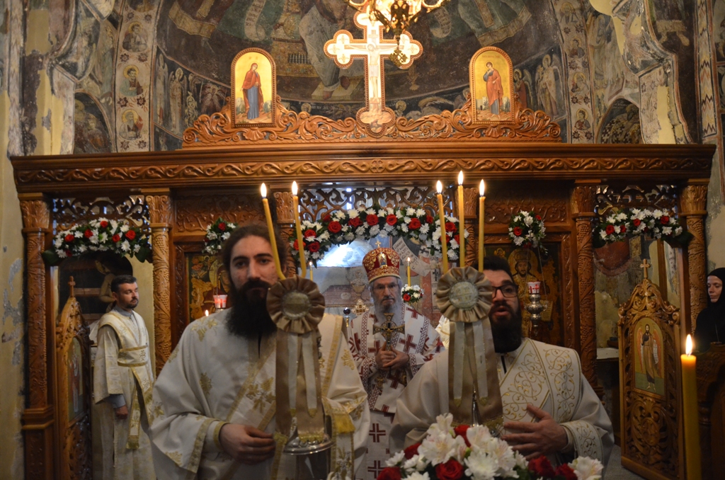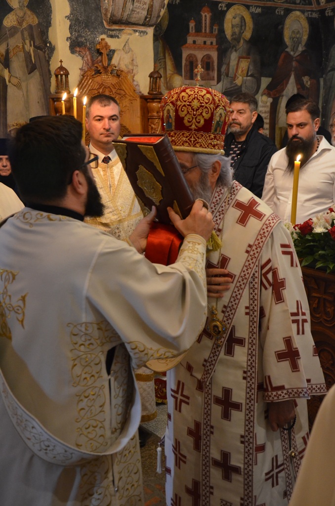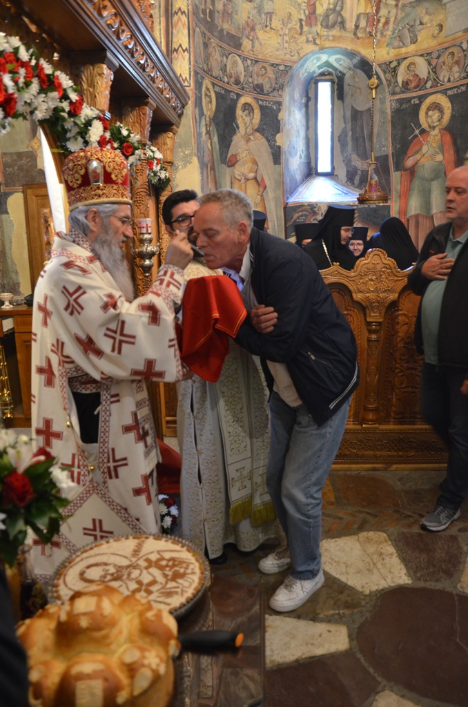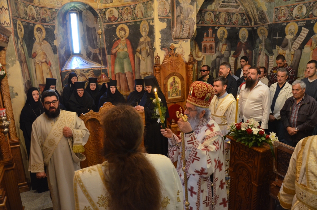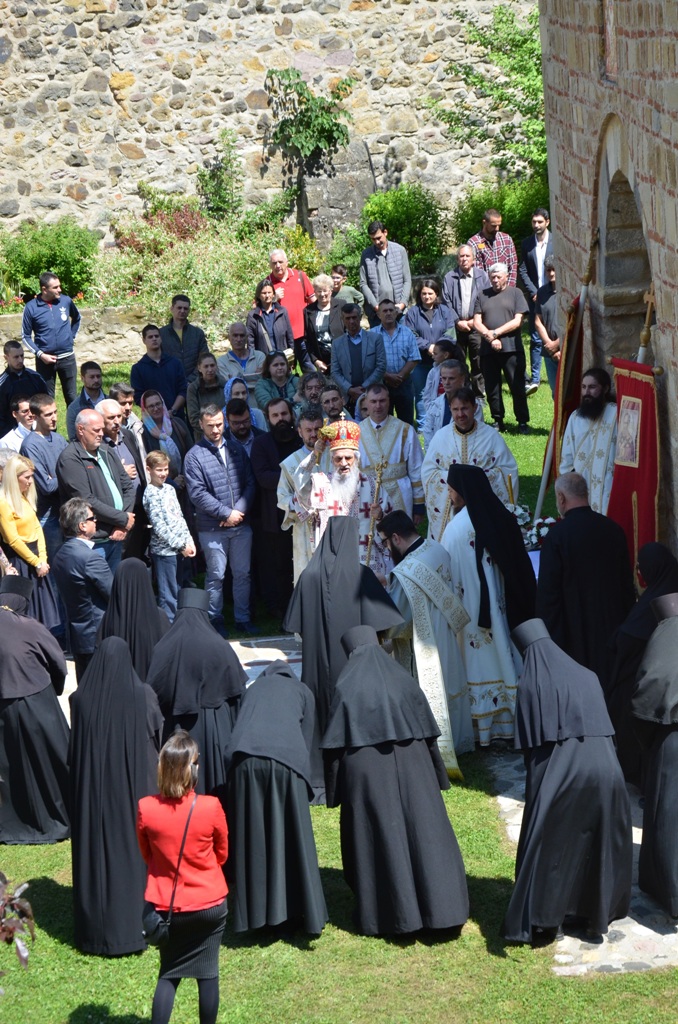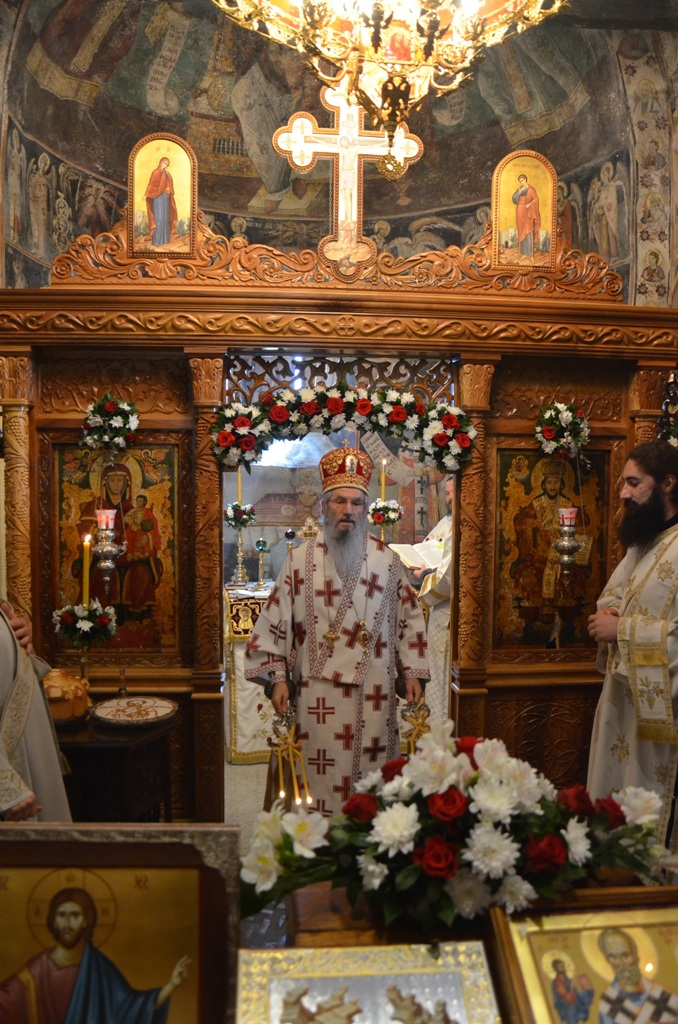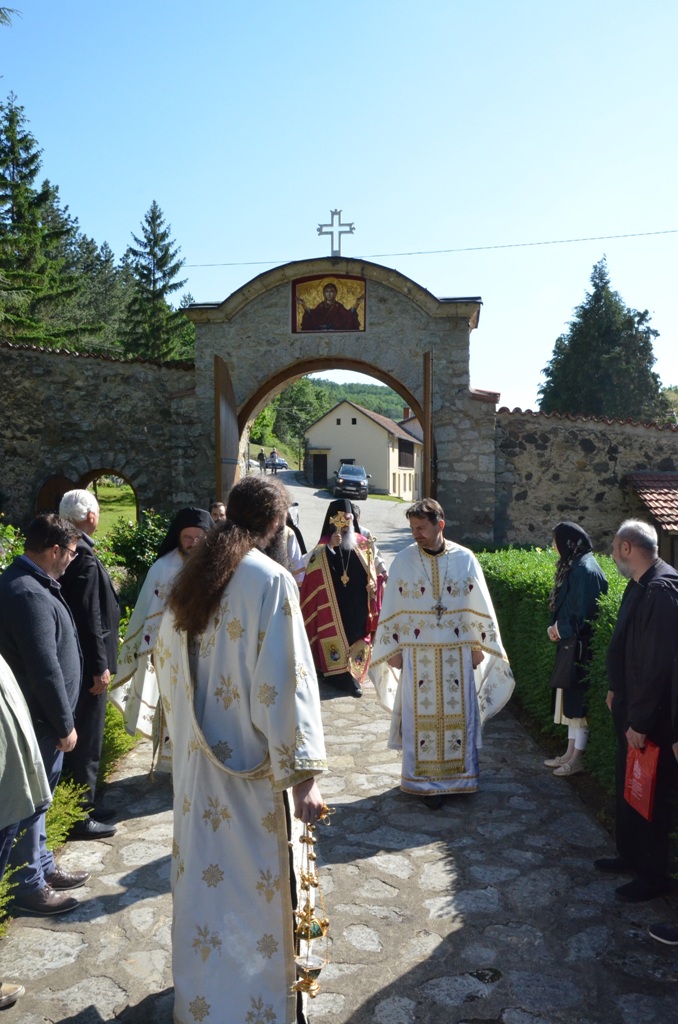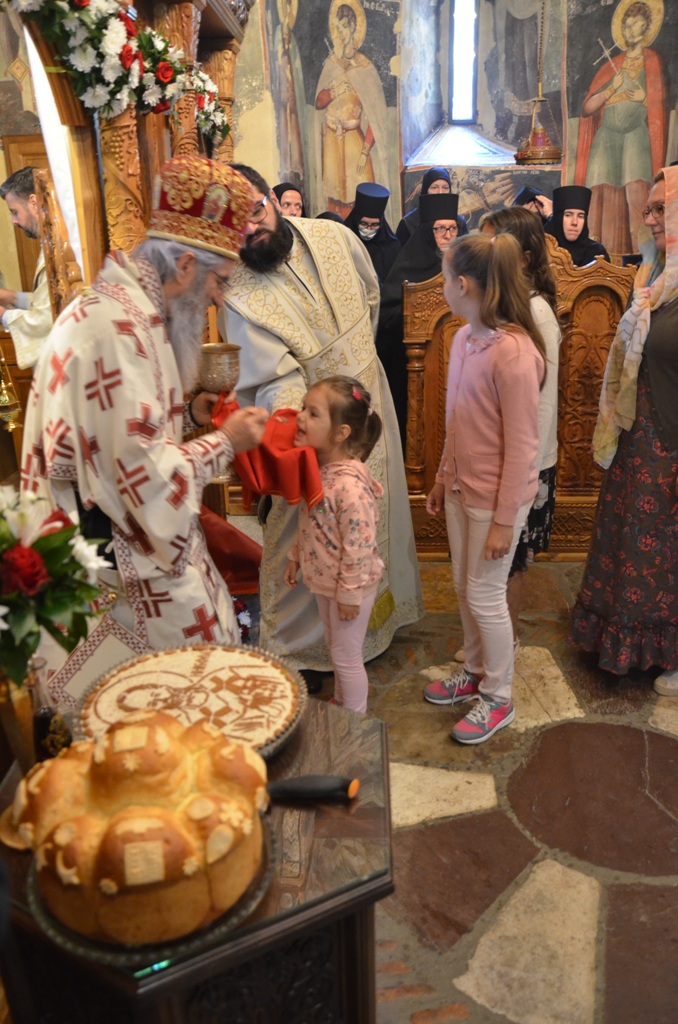 После прочитаног Јевађелског зачала, Владика се обратио надахнутом беседом сабраним верницима подсећајући их да се и даље налазимо у попразнинству Васкрсења Господњег, који је највећи и најрадоснији празник, а потврда томе је што је и после празновања Васкрса, свака недеља је посвећена Васкрсу, то јест сваке недеље празнујемо малу Пасху. Још је указао на превелику љубав Божију према људском роду, која се потврђује кроз Његово оваплоћење, трпљење, страдање и васкрсење. А светитељ кога слави ова света обитељ у којој смо сабрани управо слави сведока Васкрсења Христовога. Те сваки хришћанин који верује у Васкрсење Христово, и у своје васкрсење, који верује у живот Будећег века и живи распетим и Васкрслим Христом јесте и он сведок Ваксрсења Христовог.