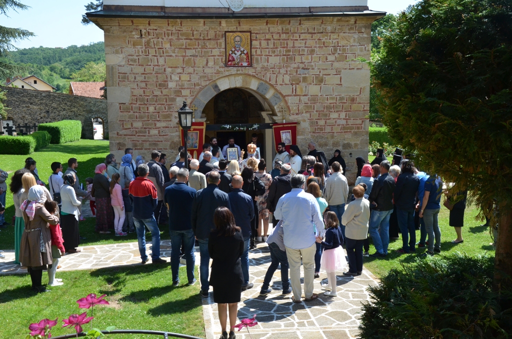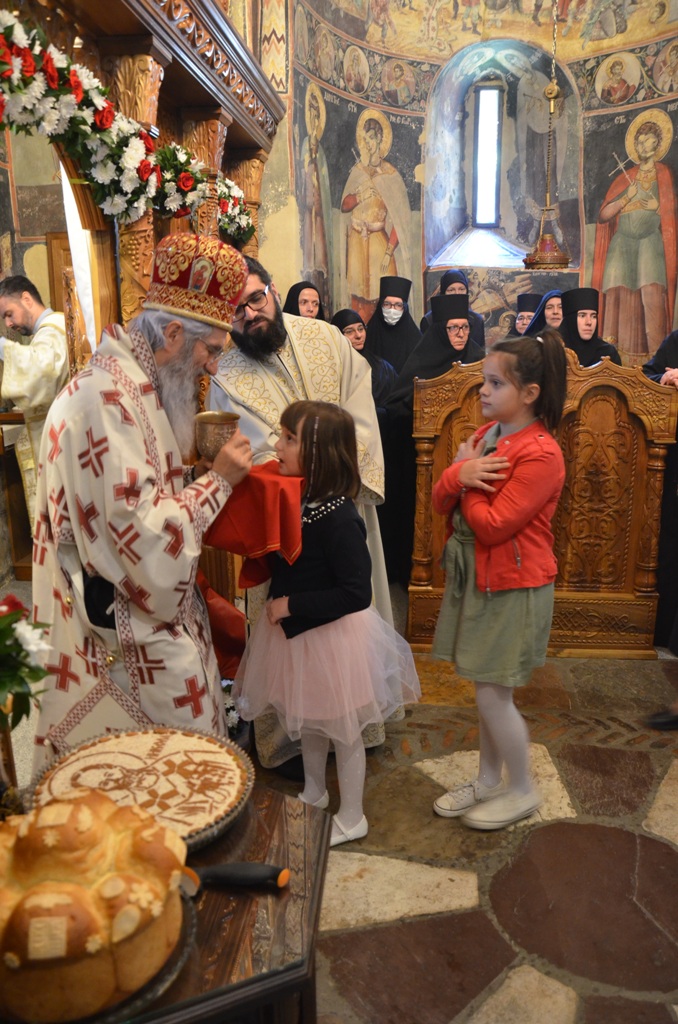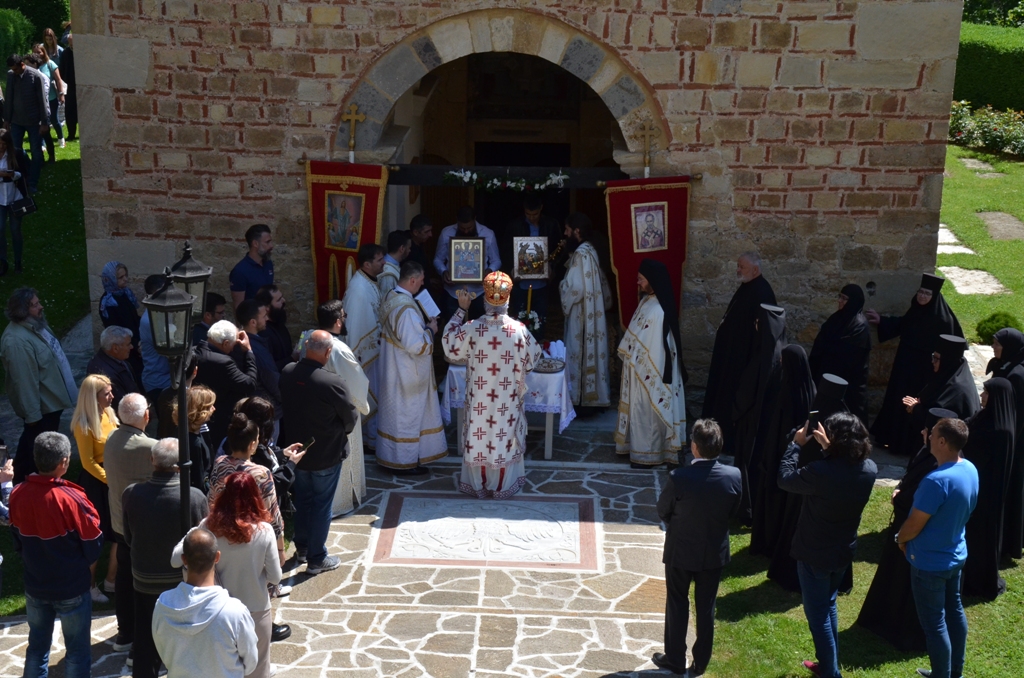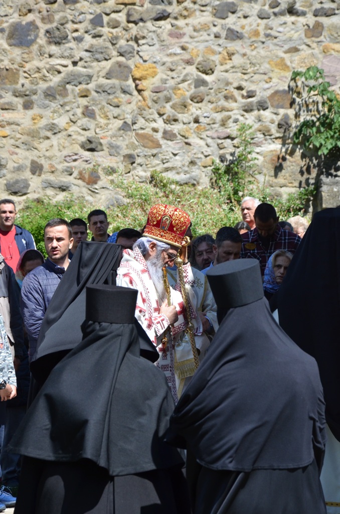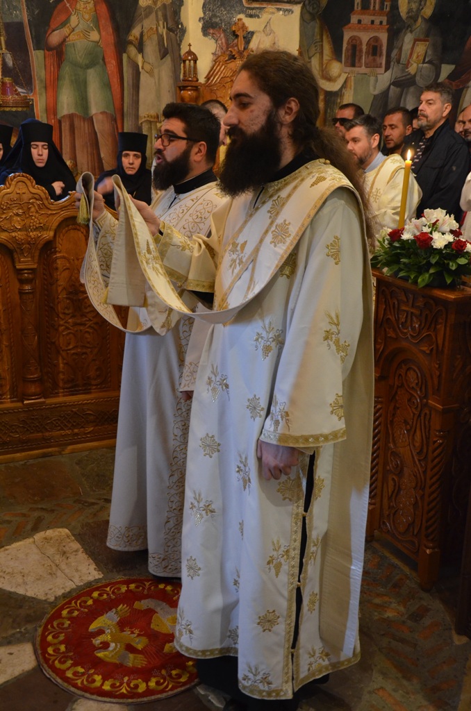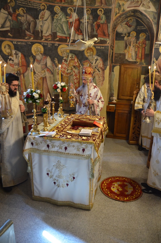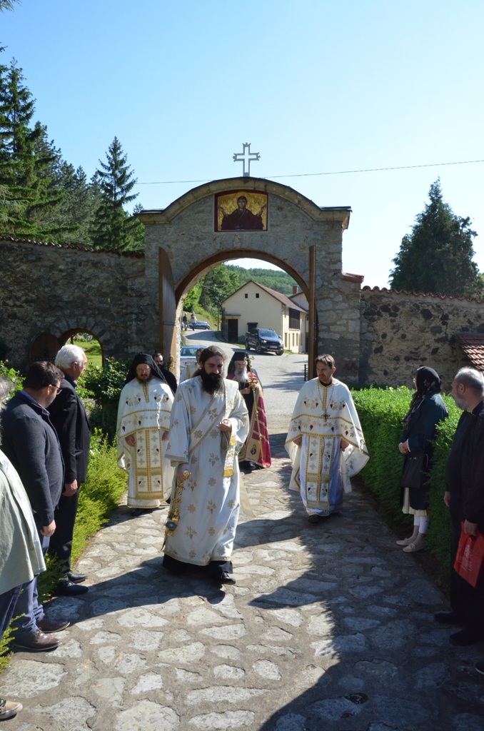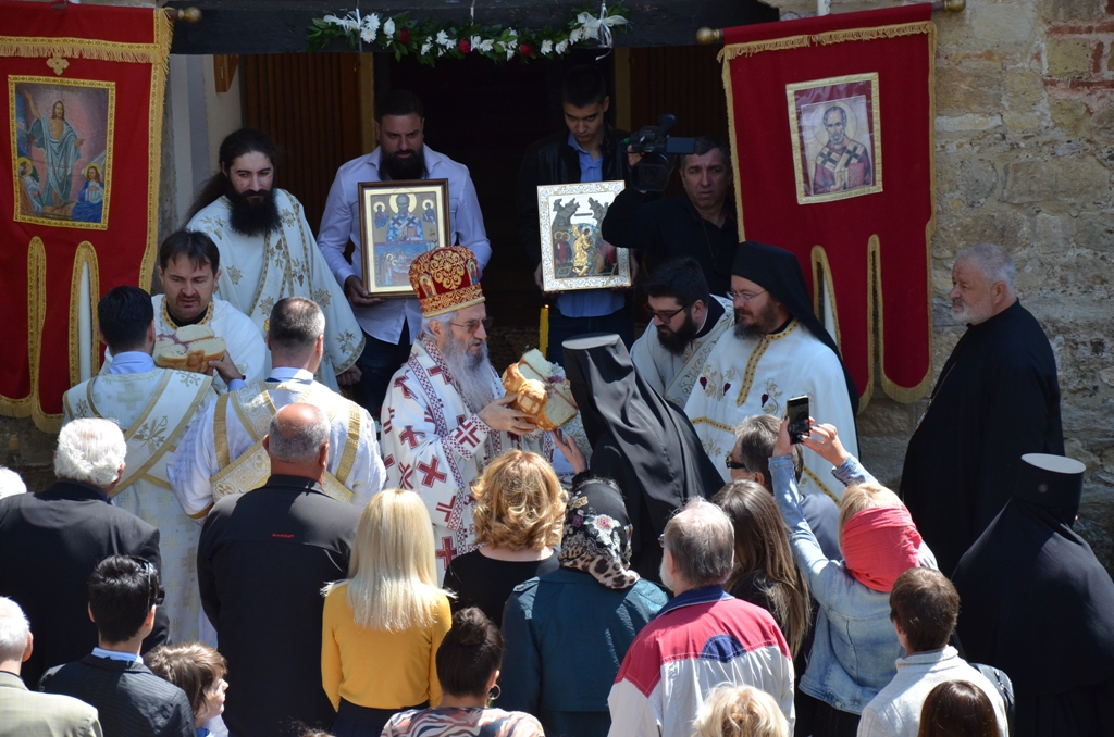 После прочитаног Јевађелског зачала, Владика се обратио надахнутом беседом сабраним верницима подсећајући их да се и даље налазимо у попразнинству Васкрсења Господњег, који је највећи и најрадоснији празник, а потврда томе је што је и после празновања Васкрса, свака недеља је посвећена Васкрсу, то јест сваке недеље празнујемо малу Пасху. Још је указао на превелику љубав Божију према људском роду, која се потврђује кроз Његово оваплоћење, трпљење, страдање и васкрсење. А светитељ кога слави ова света обитељ у којој смо сабрани управо слави сведока Васкрсења Христовога. Те сваки хришћанин који верује у Васкрсење Христово, и у своје васкрсење, који верује у живот Будећег века и живи распетим и Васкрслим Христом јесте и он сведок Ваксрсења Христовог.