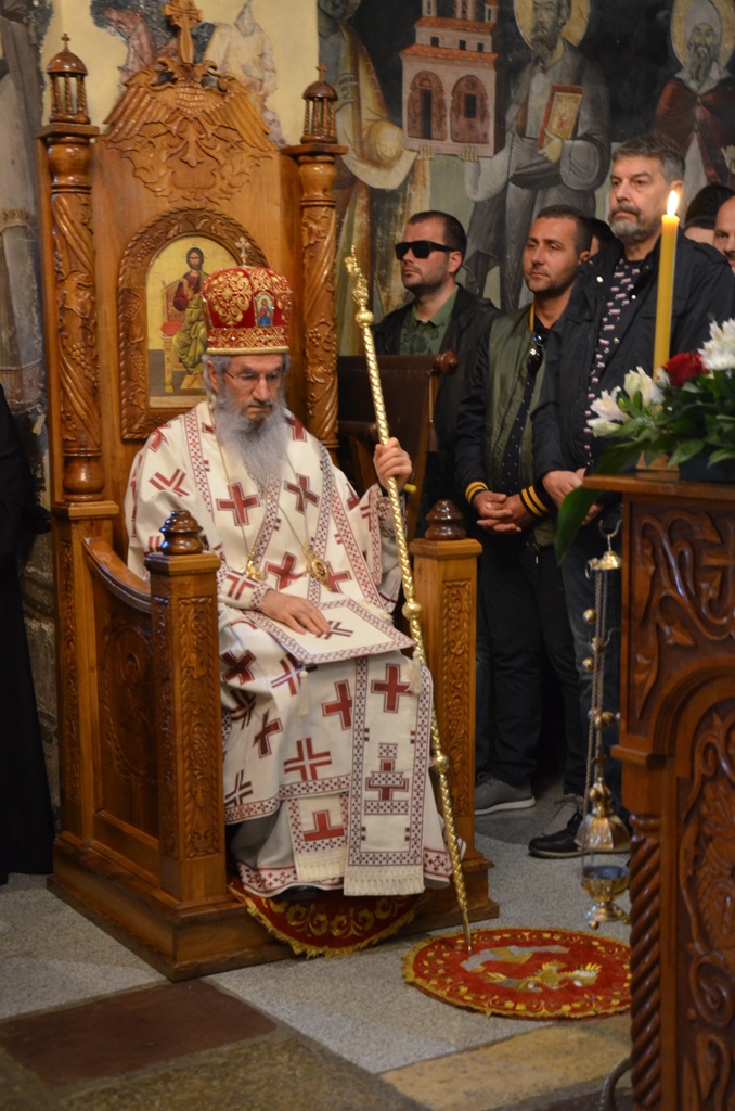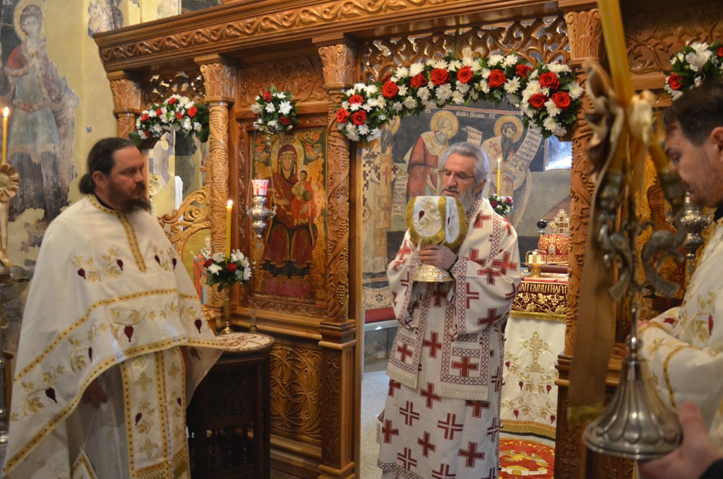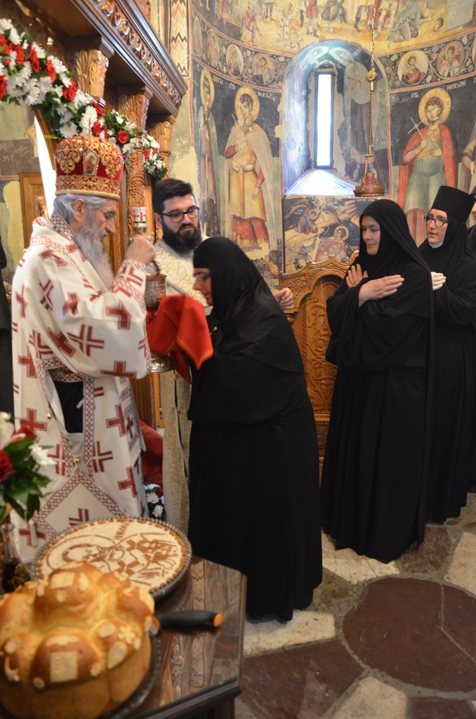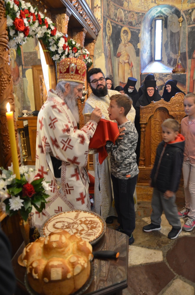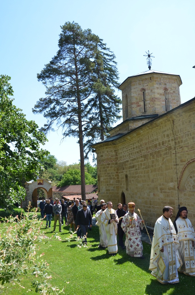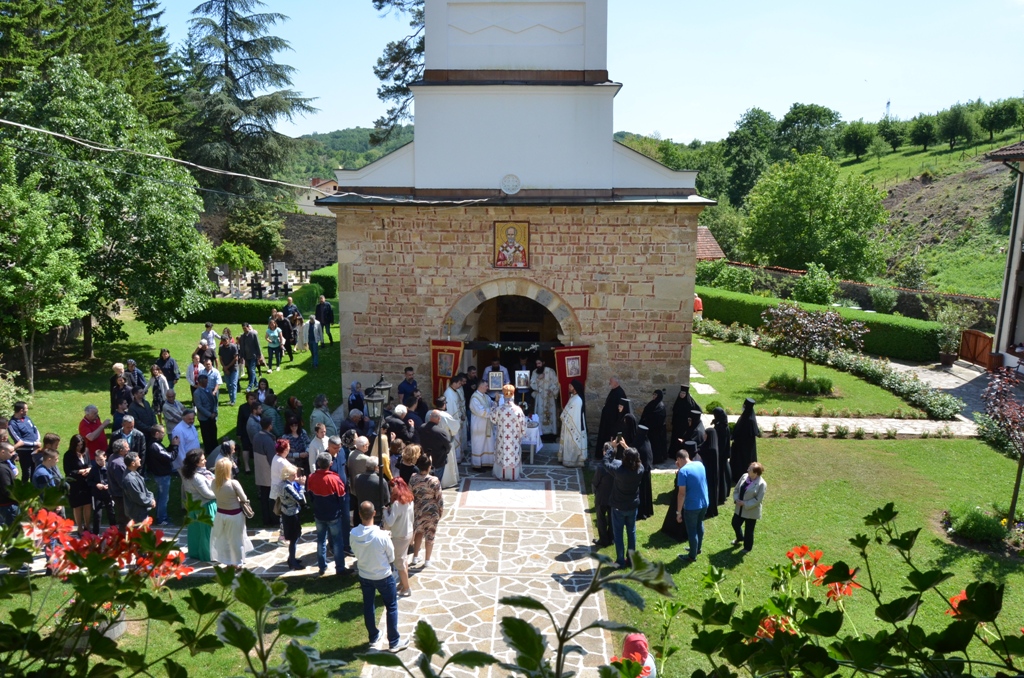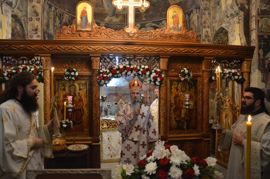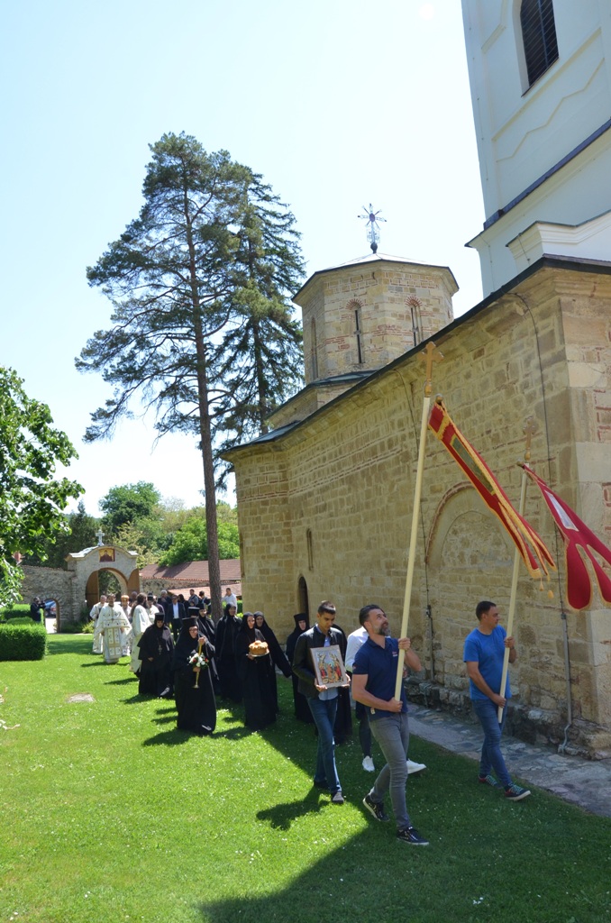 После прочитаног Јевађелског зачала, Владика се обратио надахнутом беседом сабраним верницима подсећајући их да се и даље налазимо у попразнинству Васкрсења Господњег, који је највећи и најрадоснији празник, а потврда томе је што је и после празновања Васкрса, свака недеља је посвећена Васкрсу, то јест сваке недеље празнујемо малу Пасху. Још је указао на превелику љубав Божију према људском роду, која се потврђује кроз Његово оваплоћење, трпљење, страдање и васкрсење. А светитељ кога слави ова света обитељ у којој смо сабрани управо слави сведока Васкрсења Христовога. Те сваки хришћанин који верује у Васкрсење Христово, и у своје васкрсење, који верује у живот Будећег века и живи распетим и Васкрслим Христом јесте и он сведок Ваксрсења Христовог.