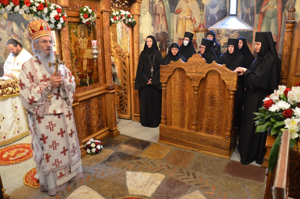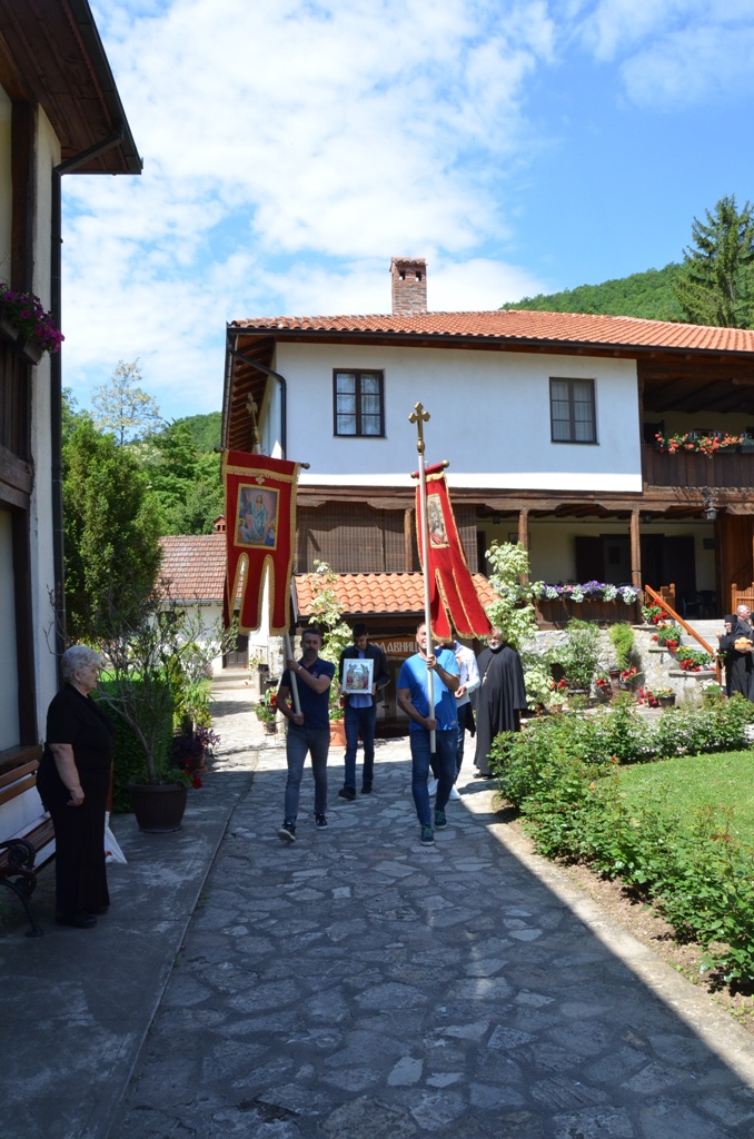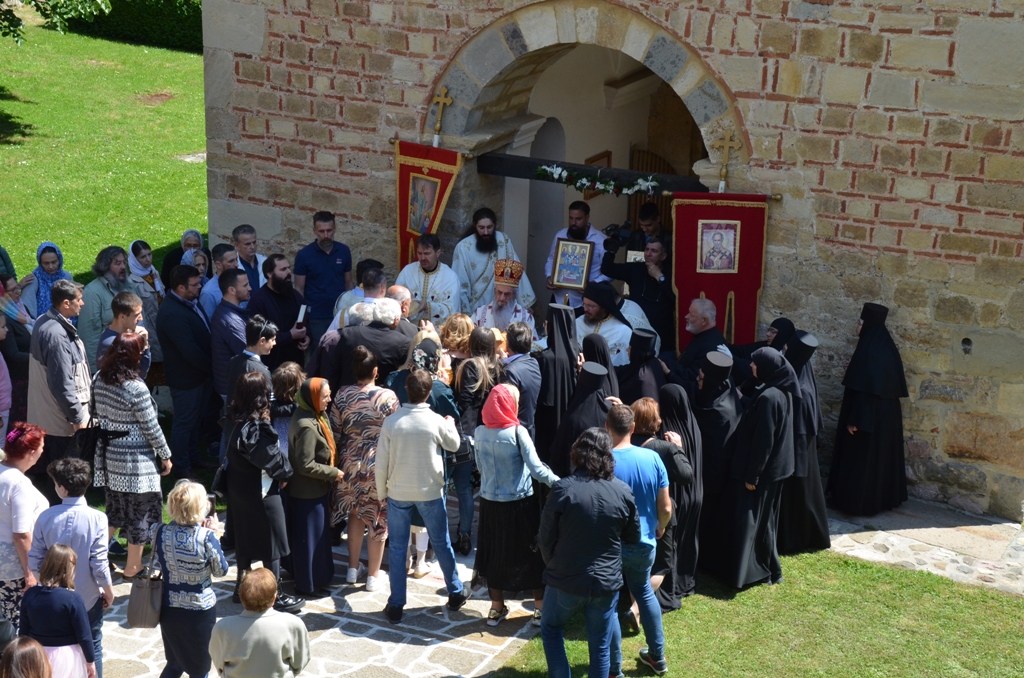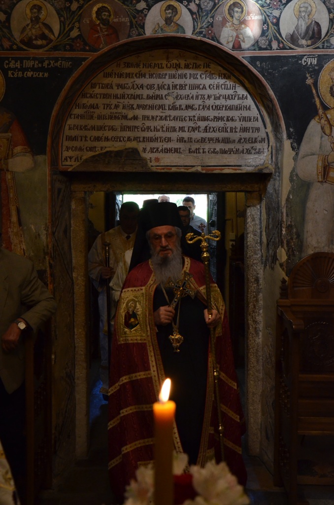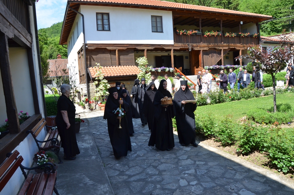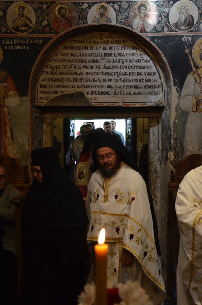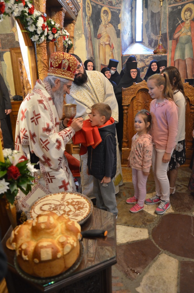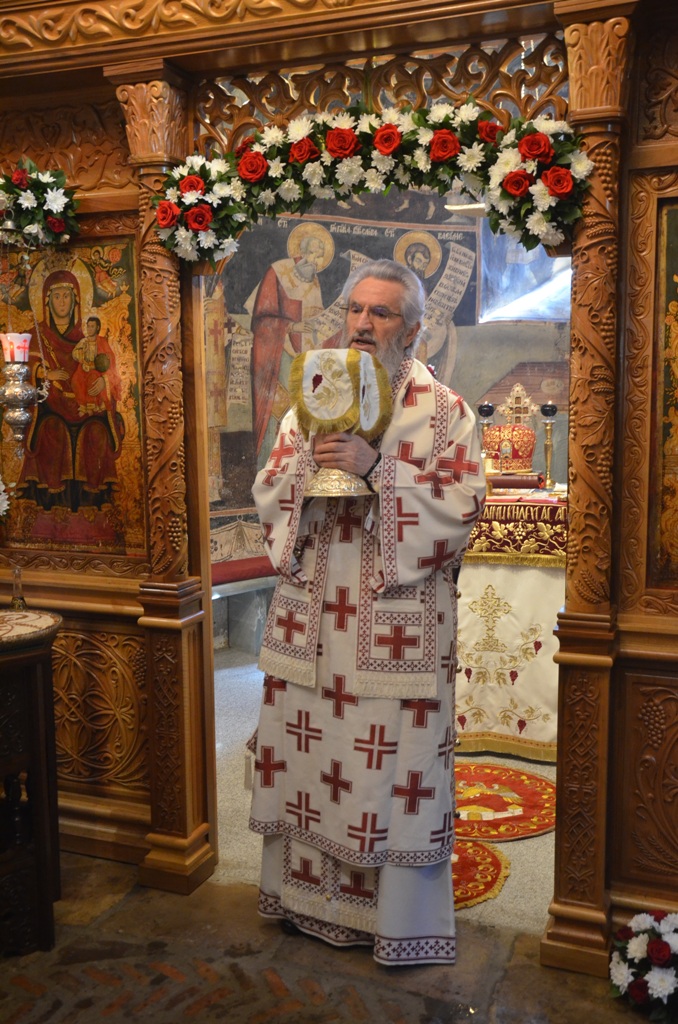 После прочитаног Јевађелског зачала, Владика се обратио надахнутом беседом сабраним верницима подсећајући их да се и даље налазимо у попразнинству Васкрсења Господњег, који је највећи и најрадоснији празник, а потврда томе је што је и после празновања Васкрса, свака недеља је посвећена Васкрсу, то јест сваке недеље празнујемо малу Пасху. Још је указао на превелику љубав Божију према људском роду, која се потврђује кроз Његово оваплоћење, трпљење, страдање и васкрсење. А светитељ кога слави ова света обитељ у којој смо сабрани управо слави сведока Васкрсења Христовога. Те сваки хришћанин који верује у Васкрсење Христово, и у своје васкрсење, који верује у живот Будећег века и живи распетим и Васкрслим Христом јесте и он сведок Ваксрсења Христовог.