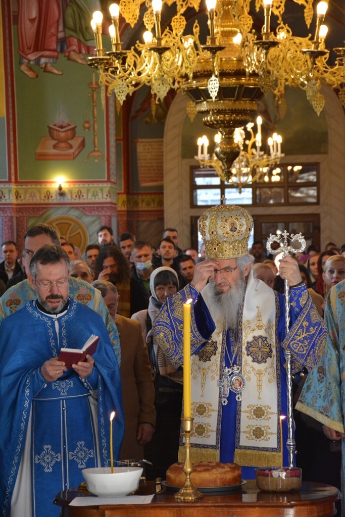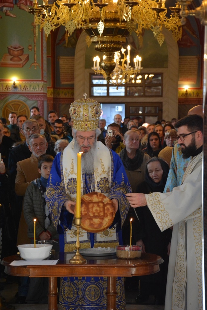 На крају, Епископ Јован је пререзао славски колач са верним народом и хором при храму Св. Александра Невског, који данас прославља своју славу.