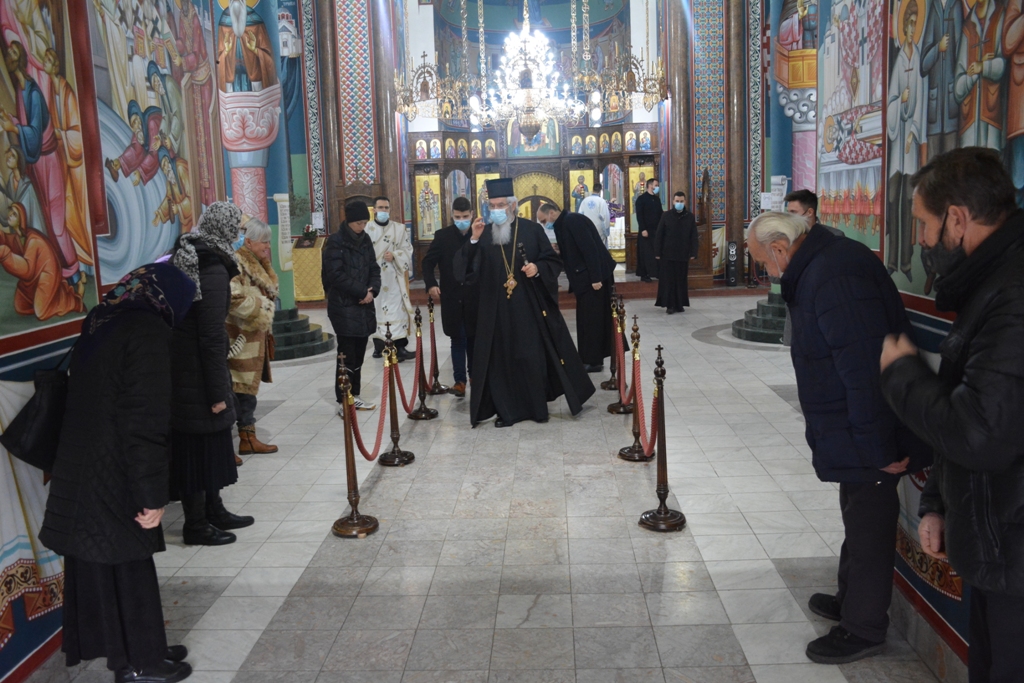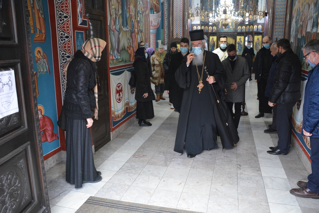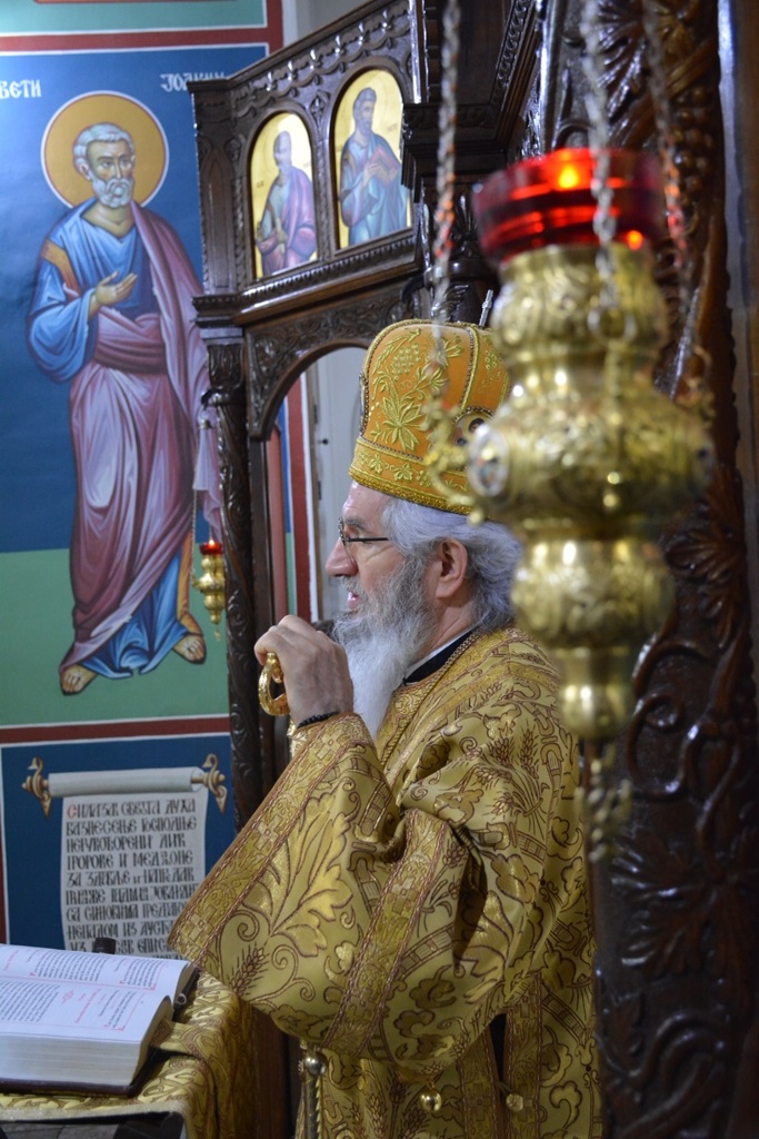 По прочитаном Јеванђељу и Апостолу, Преосвећени се обратио верном народу: “Данас наша света Црква слави великог угодника Божијег и светитеља Светог Макарија Великог. Био је велики у вери, смирењу, био је велики јер је послушао речи Господње које је Господ рекао у данашњем Јеванђељу: “Ходите к Мени сви који сте уморни и натоварени и Ја ћу вас одморити”. И даље Господ говори: “Узмите јарам мој на себе и научите се од Мене јер сам Ја кротак и смирен у срцу своме”. Велики је Свети Макарије јер је послушао мудре савете и речи Апостола Павла: “Плод Духа је љубав, вера, смирење и спокој”. Велики је био свети Макарије што је узео тај јарам Христов на себе, а јарам Христов је Његово учење. То није јарам који спутава човека, него јарам који га уздиже, подиже и храбри га, јер је сав такав човек у Јеванђељу. Ако смо пажљиво саслушали данашње Јеванђеље, уз то ако смо прочитали укратко житије Светог Макарија, онда ћемо видети како се ова два поучна штива у потпуности односе на живот овог великог светитеља Божијега. Свети Макарије је као што читамо из житија, провео шездесет година у пустињи. У пустињи не где је ленствовао, него је предао себе Богу и сав у своме труду и молитви смирењу он је заиста водио велику борбу унутрашњу и спољашњу. Коју то унутрашњу борбу? Водио је борбу сам са собом. Све док човек не поведе борбу сам са собом и не покуша уз помоћ Божију да победи све у себи, и не победи гордост и сујету. И ако се ту човек не ухвати у коштац у такву борбу, неће моћи победити себе а најмање ће победити другога. А горд човек је горд што жели да буде изнад другога, што жели да победи другога у размишљању да је он бољи и паметнији од њега. То је била његова унутрашња борба са самим собом и нечастивим силама. Он је не собом него благодаћу Духа Светога, постом и смирењем. Највише се боје и плаше демони од вере нашег, Крста Христовог и смирења. А Макарије се ухватио у коштац са таквим нечастивим силама, које су теже од било каквих спољашњих непријатеља. Знао је да ако хоће да победи спољашњег непријатеља, да мора прво да победи себе. Он је браћо и сестре задобио плодове Духа Светога. Ти су плодови били видни у сваком погледу. Он је један од оснивача монаштва у Египту. Код њега су људи видели Божанског Духа, којег Макарије никада није истицао, али нема ни потребу. Велики људи не истичу своје особине духовне. Оно што је откривено Богом не може бити сакривено. Ти дарови су били такви да су дејствовали на друге и тако је његова пустиња постала уствари плодоносна пустиња, насељена монаштвом, насељена Божијим људима. Дакле, он је задобио благодат Духа Светога тиме што је у себи радости али радост по Богу и у Богу, што је имао дуготрпљење и што је имао смиреност.”