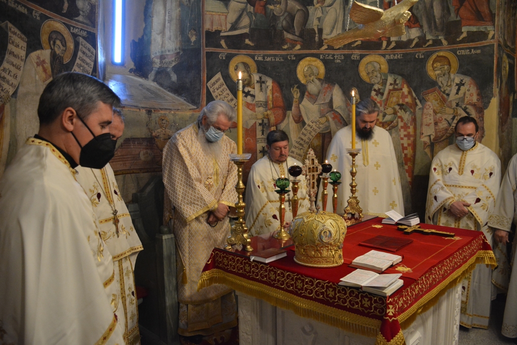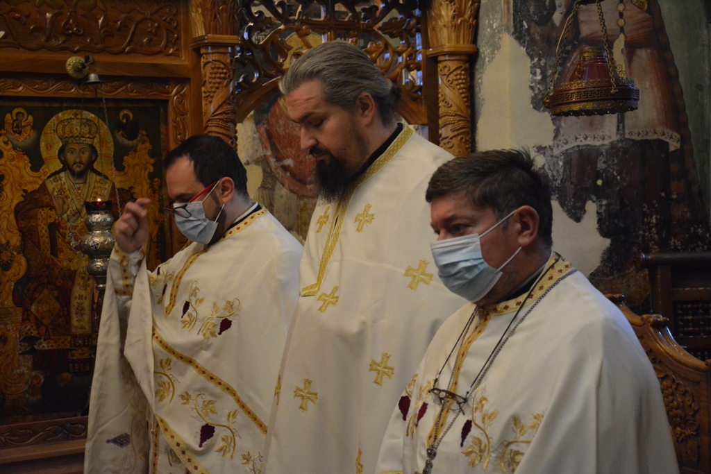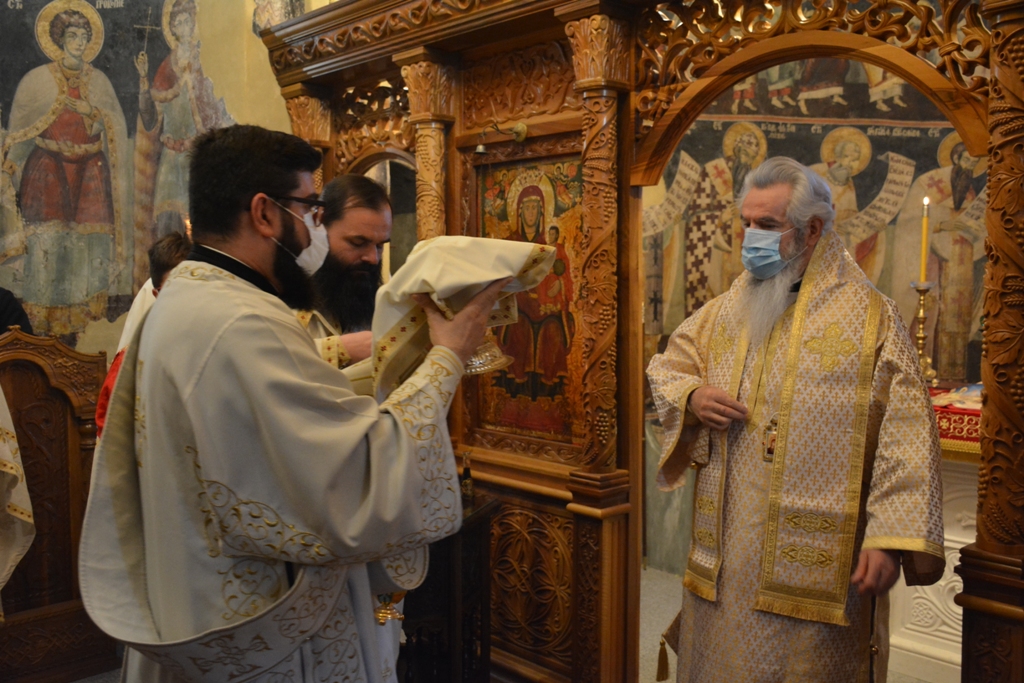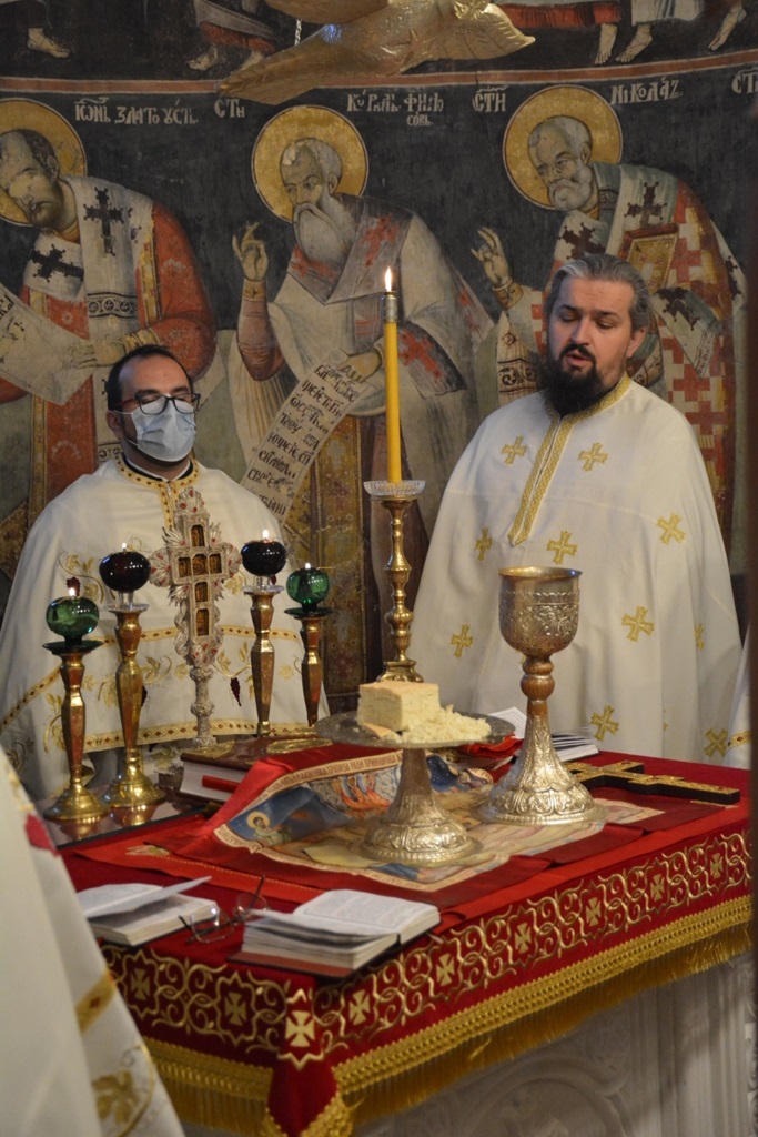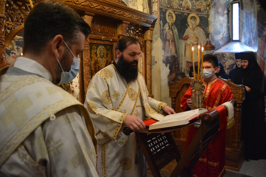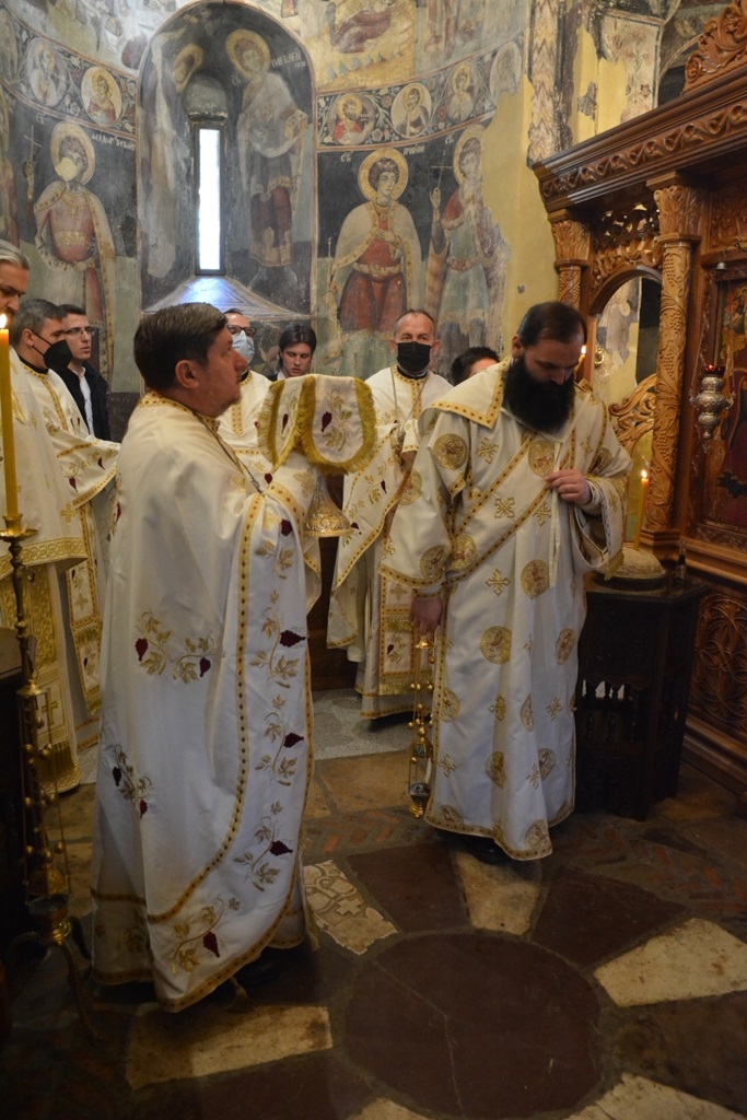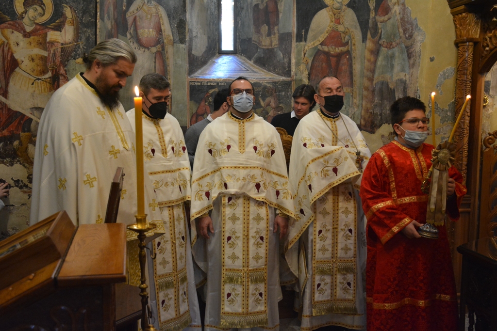 Његовом Преосвештенству саслуживали су ректор Богословије “Светог Јована Златоуста” пртојереј-ставрофор др Зоран Крстић, протојереј-ставрофор Зарије Божовић, протосинђел Онуфрије (Вранић), протојереј Дејан Лукић, јереј Дејан Марковић, протођакон Иван Гашић, јерођакон Василије (Старовлах).