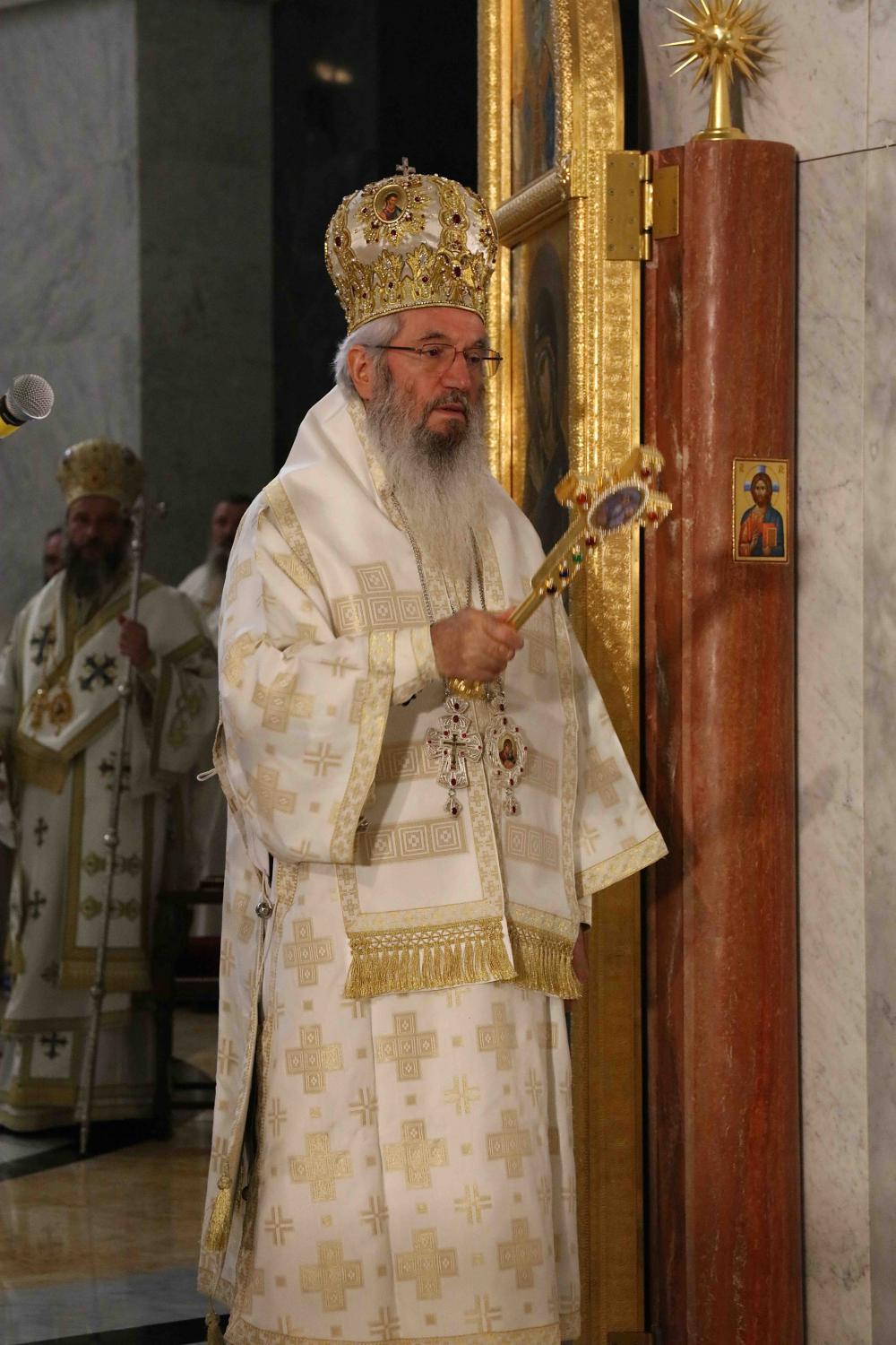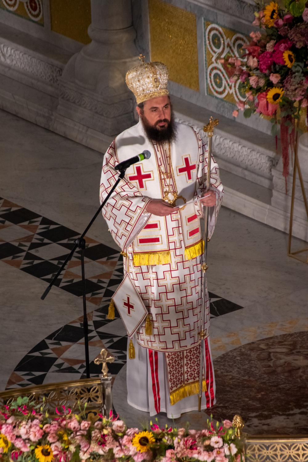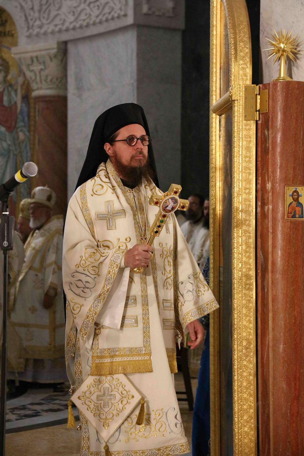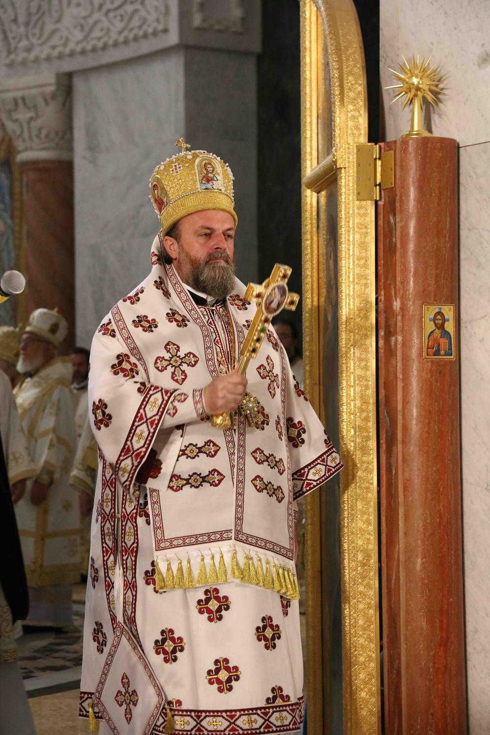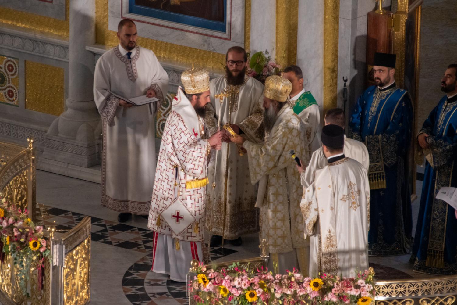 Уручијући архијерејски жезал епископу Јустину, Његова Светост Патријарх српски г. Порфирије је истакао: -Данас смо имали радостан духовни догађај пре свега што смо учествовали у тајни Царства Небеског кроз причешће Светим Телом и Крвљу Господа и Спаситеља нашега Исуса Христа који је Глава Цркве, који је у пуноћи својој присутан у светој Литургији. А тамо где је Он, ту је и Царство Небеско. Из тајне свете Литургије, која је управо оприсутњење Царства Небеског међу нама, налазе се и све остале тајне Цркве. Јер Литургију, Тајну Спасења, врши сам Распети и Васкрсли Господ, а на Његовом месту и по Његовом обличју, од апостолских времена па до данас, Црква је установила да стоје Епископи. Данас смо имали велики духовни благослов да имамо хиротонију још једног новог Епископа Цркве.