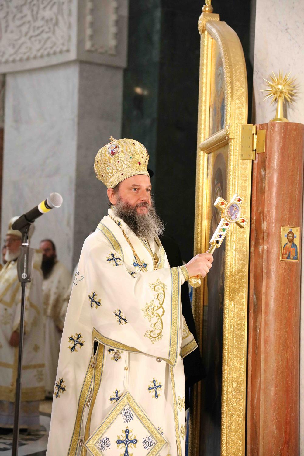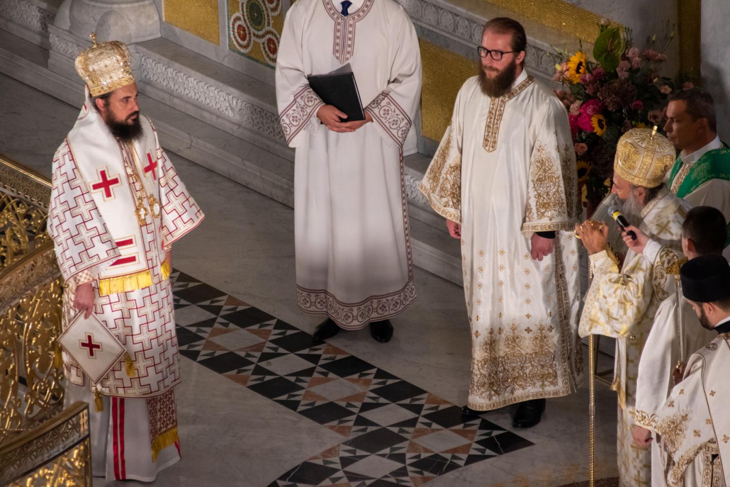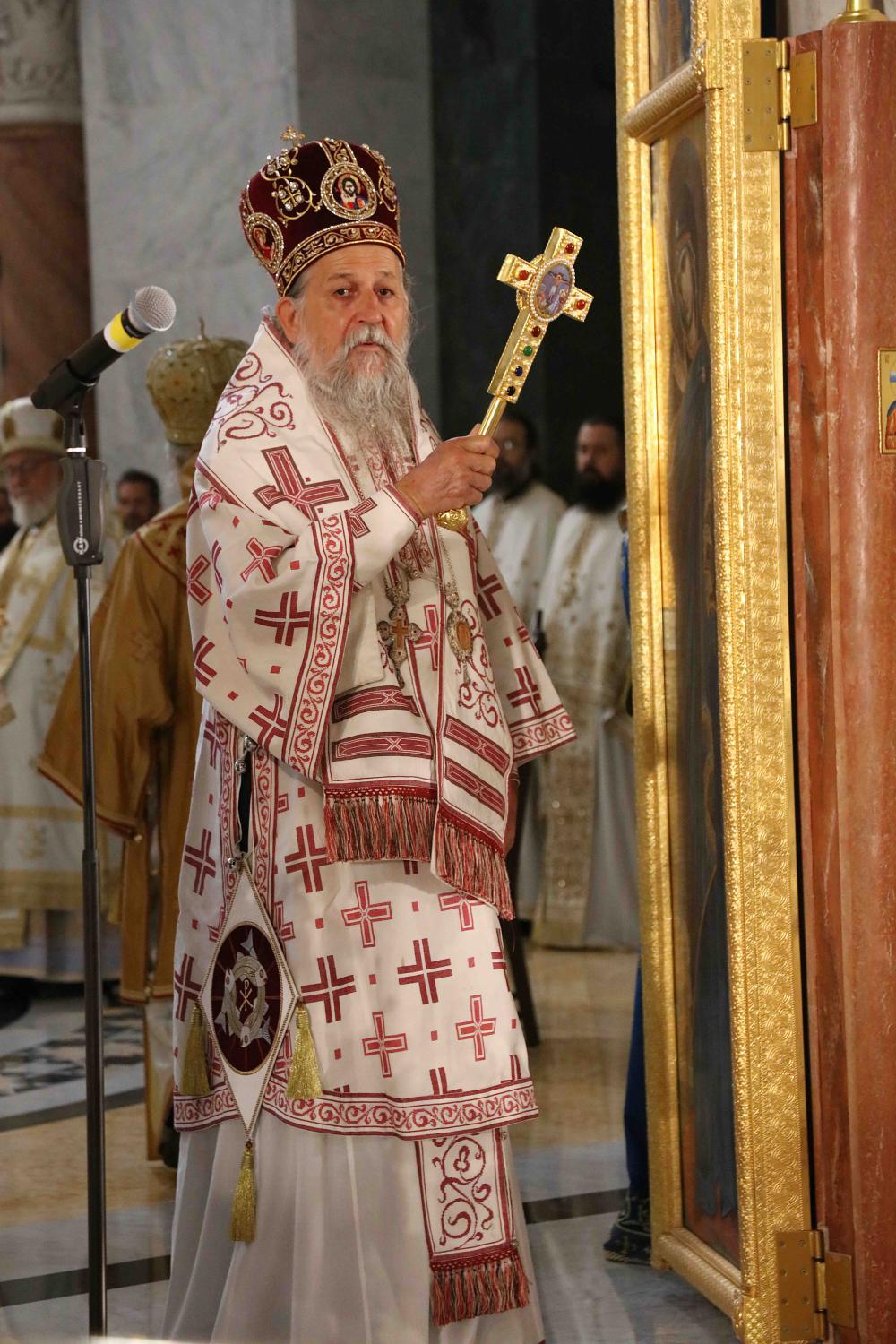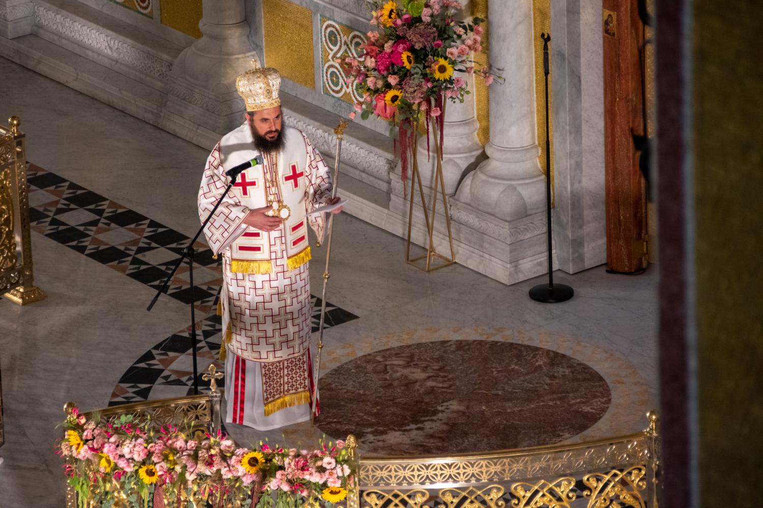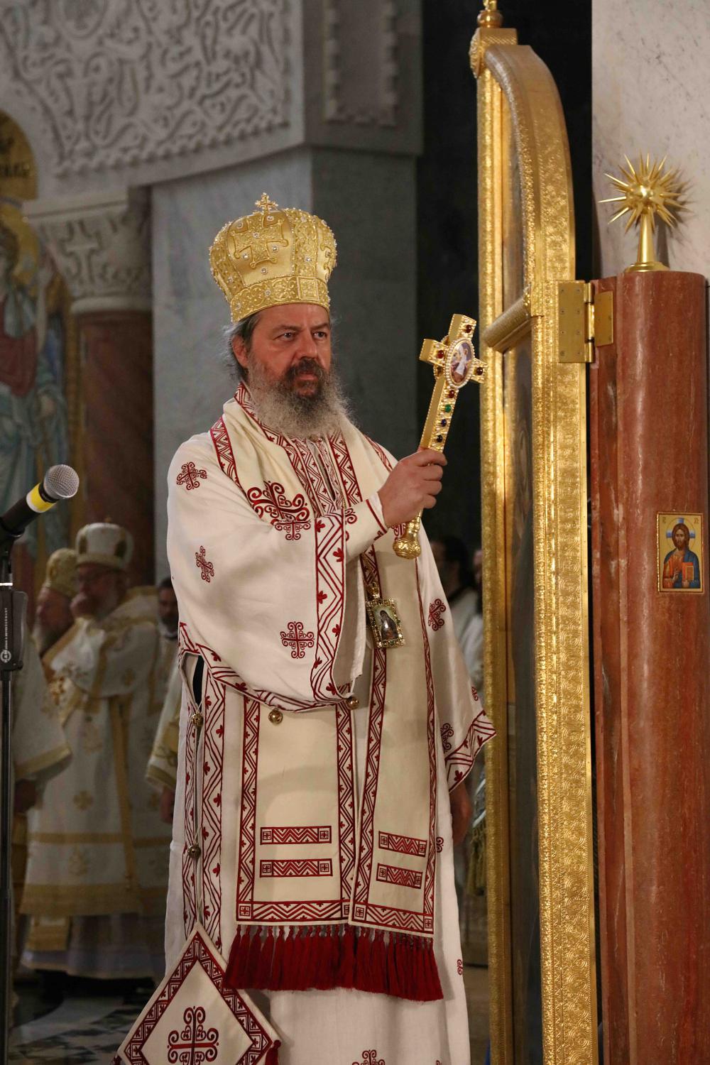 Уручијући архијерејски жезал епископу Јустину, Његова Светост Патријарх српски г. Порфирије је истакао: -Данас смо имали радостан духовни догађај пре свега што смо учествовали у тајни Царства Небеског кроз причешће Светим Телом и Крвљу Господа и Спаситеља нашега Исуса Христа који је Глава Цркве, који је у пуноћи својој присутан у светој Литургији. А тамо где је Он, ту је и Царство Небеско. Из тајне свете Литургије, која је управо оприсутњење Царства Небеског међу нама, налазе се и све остале тајне Цркве. Јер Литургију, Тајну Спасења, врши сам Распети и Васкрсли Господ, а на Његовом месту и по Његовом обличју, од апостолских времена па до данас, Црква је установила да стоје Епископи. Данас смо имали велики духовни благослов да имамо хиротонију још једног новог Епископа Цркве.