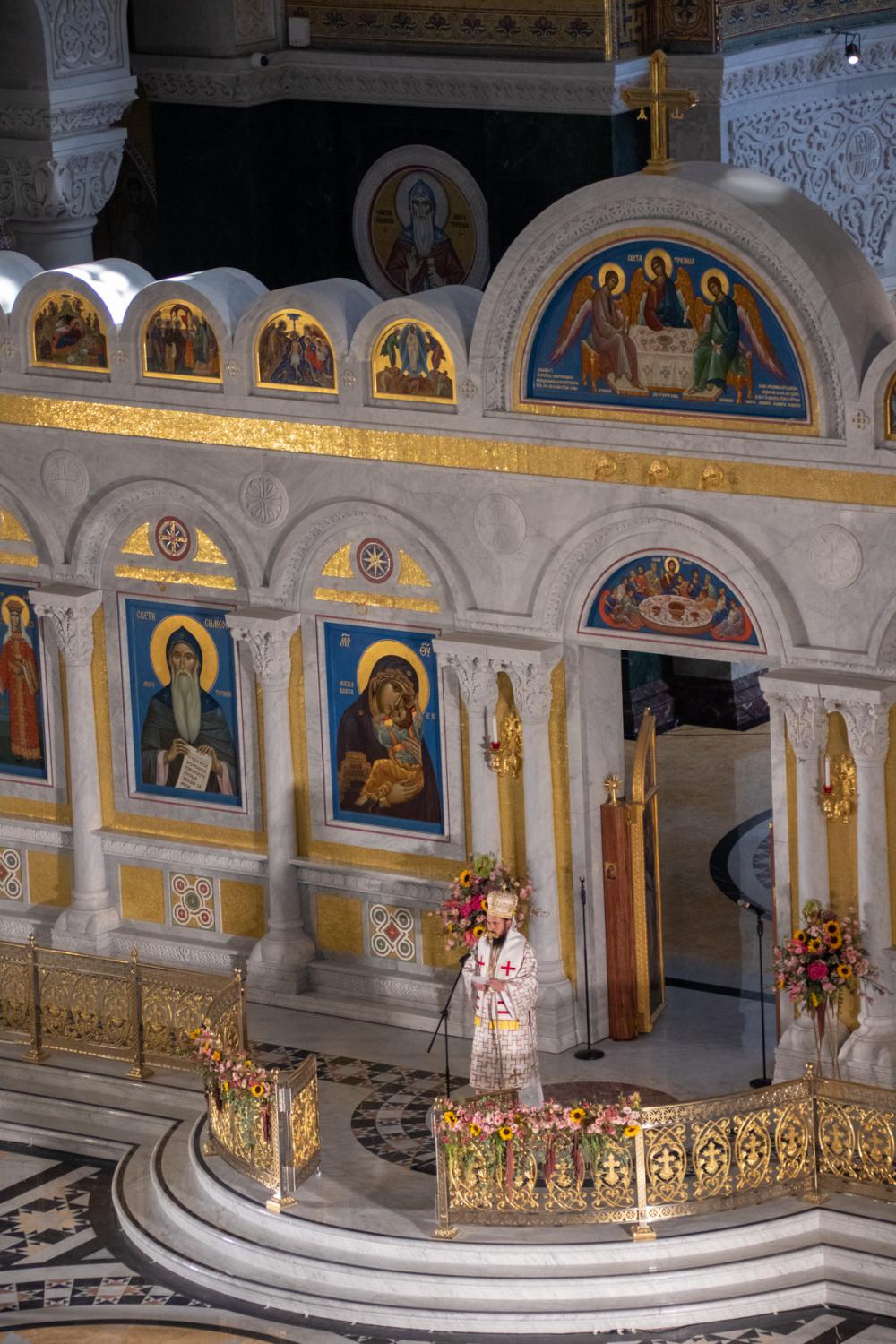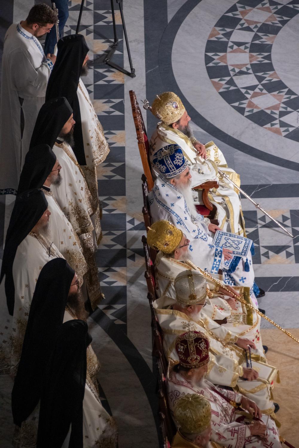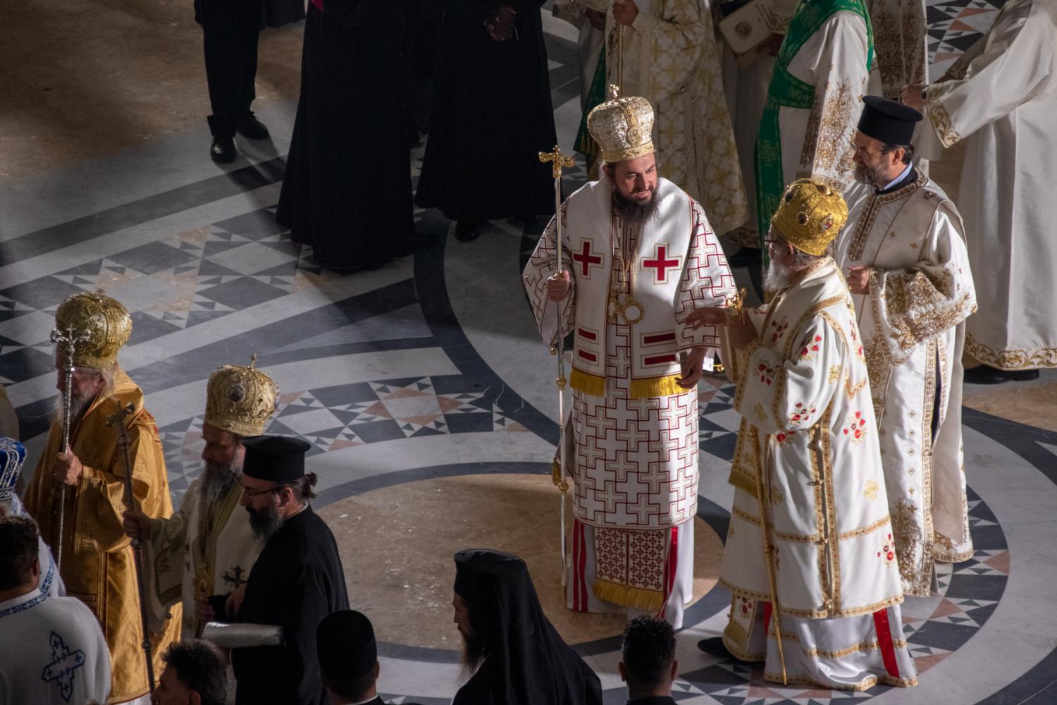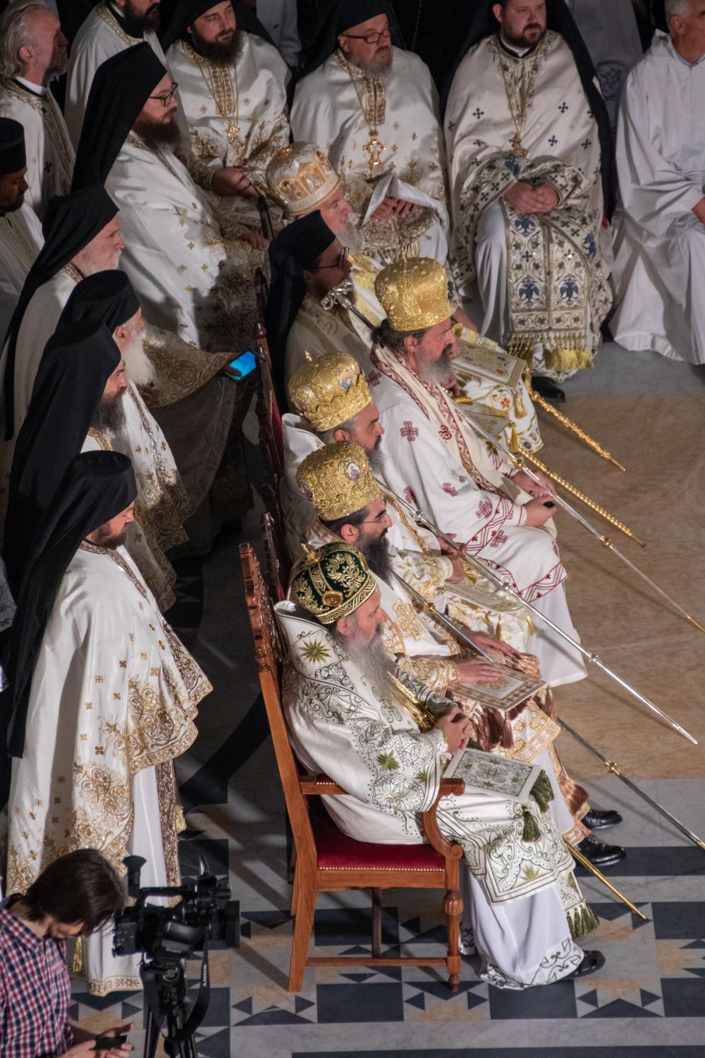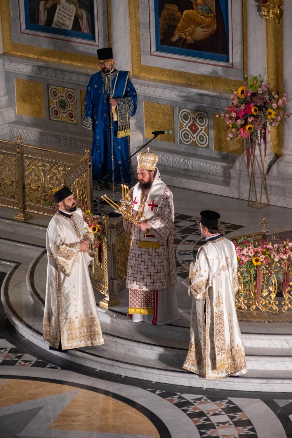 Уручијући архијерејски жезал епископу Јустину, Његова Светост Патријарх српски г. Порфирије је истакао: -Данас смо имали радостан духовни догађај пре свега што смо учествовали у тајни Царства Небеског кроз причешће Светим Телом и Крвљу Господа и Спаситеља нашега Исуса Христа који је Глава Цркве, који је у пуноћи својој присутан у светој Литургији. А тамо где је Он, ту је и Царство Небеско. Из тајне свете Литургије, која је управо оприсутњење Царства Небеског међу нама, налазе се и све остале тајне Цркве. Јер Литургију, Тајну Спасења, врши сам Распети и Васкрсли Господ, а на Његовом месту и по Његовом обличју, од апостолских времена па до данас, Црква је установила да стоје Епископи. Данас смо имали велики духовни благослов да имамо хиротонију још једног новог Епископа Цркве.