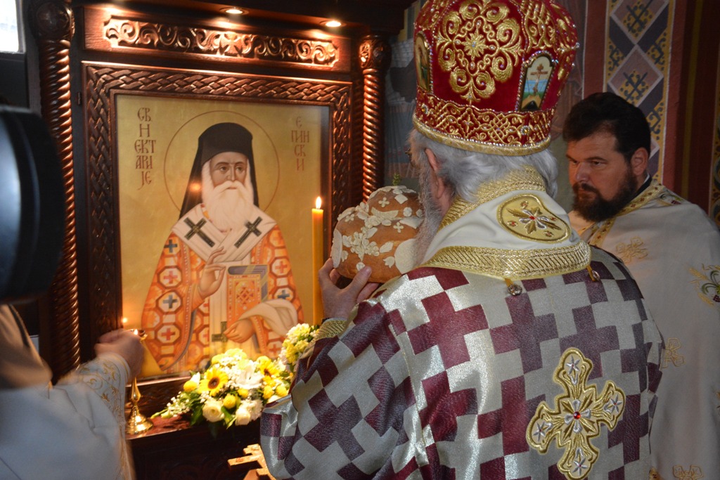 Након прочитаног јеванђељског зачала, Епископ Јован је честитао празник сабраном верном народу и подсетио на значај Светог Нектарија Егинског: „Браћо и сестре, данас наша Црква слави великог угодника и молитвеника Божијег, Светог Нектарија Егинског Чудотворца. Ми данас прослављамо човека Божијег који је задобио једну од најважнијих хришћанских врлима – врлину смирења. Њоме је Свети Нектарије живео целог свог живота. Свети Нектарије је показивао ту врлину у свим приликама и неприликама. Ту своју врлину је показивао баш онда када су га највише прогонили, осуђивали и клеветали и то на правди Бога. Он се угледао на онога који је оличење смирења, а то је Господ наш Исус Христос. Ако је ико, браћо и сестре, смирен, то је Господ Исус Христос. Када су га људи осудили и разапели на Крст, он је и тада био смирен и молио се Оцу: „Оче, опрости им јер не знају шта чине“. Угледајући се на Господа Исуса Христа и Свети Нектарије је све трпео и подносио. Знао је да онај који верује у Бога, кад тад бити прослављен од Бога. Његово прогањање и клеветање није било месец, годину или пет година, већ много дуже. Што је више времена проводио у прогонству, све се више учвршћивао у вери у Бога и у врлини смирења. Он се стално молио да га не ухвати гордост, јер је знао за речи Јеванђеља да се Бог гордима противи, а смиренима даје благодат. Заиста, Свети Нектарије је задобио благодат, то јест Христа. Када је задобио Христа и уселио га у себе, он није имао потребе да се плаши, јер је знао да ко је са Богом, он побеђује. Свети Нектарије није размишљао да се тиме хвали. Није му стало до његове личне победе, већ да победе истина и правда Божија. Ето, све нам ово говори да ми треба да се угледамо на светитеље Божије да бисмо стекли смирење. Ако немамо смирења, џаба нам је све што чинимо у животу. Нема праве молитве, бдења и поста без смирења. Смирење је темељ хришћанског живота, заједно са вером. Смирење је темељ нашег духовног живота. Смирење је грађевина на којем се зида прави човек. Такав човек је Божији човек. Зато је Свети Нектарије до краја свог живота издржао. Управо је смирење Нектарија учинило светим, као што је смирење Марију учинило Богородицом. Пресвета Богородица и Свети Нектарије могли су да одбију оно што од Бога примају, али да ли би они били ово што сад јесу? Данас не бисмо имали Светог Нектарија, великог чудотворца. Господ Светог Нектарија је учинио и великим чудотворцем. Благодат Духа Светог и данас дејствује кроз његово нетљено тело. Мислим да нема правог хришћанина који није чуо за чудотворство Светог Нектарија. Многи су то осетили и на себи кроз оздрављења и друга чуда. Све то Бог чини прослављајући светитеље, јер су они прославили Њега. Господ све то чини да бисмо се и ми уверили у силу и благодат Божију. Браћо и сестре, из свега овога можемо видети шта човек задобија када се усавршава у смирењу.
