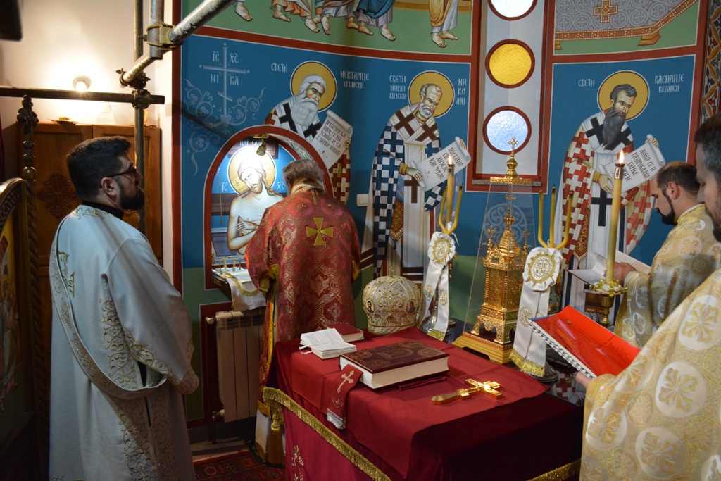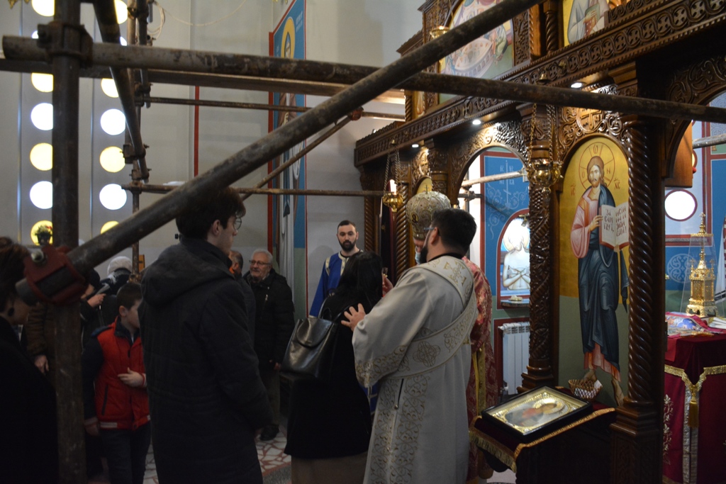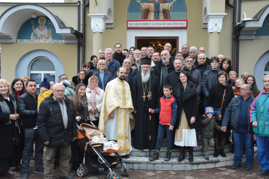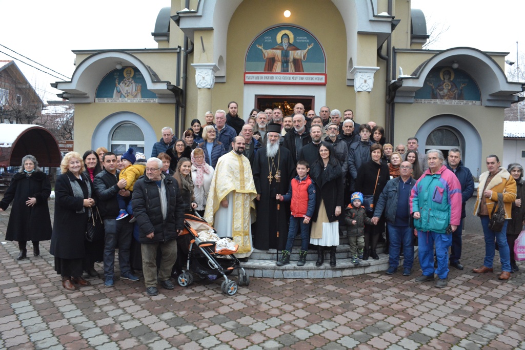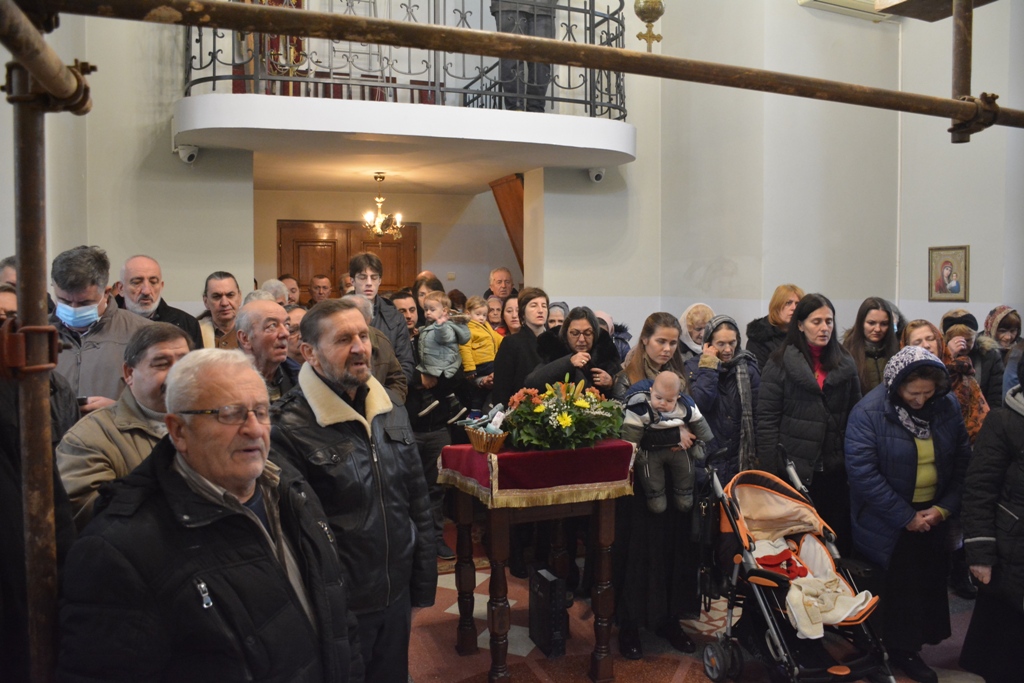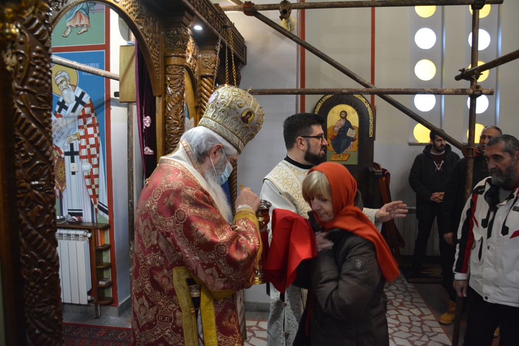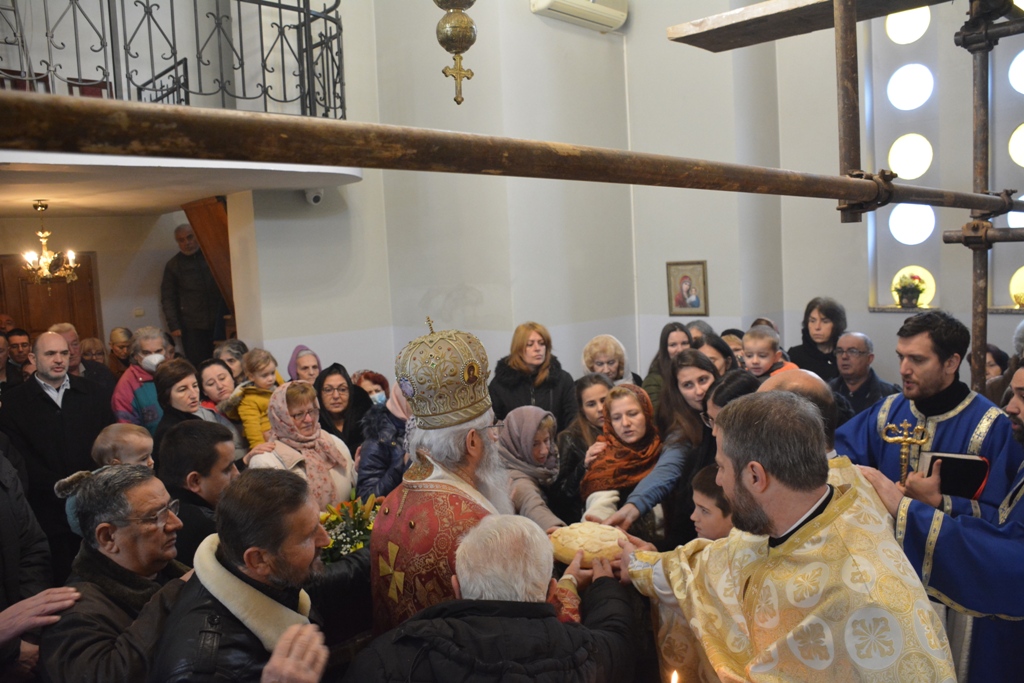 Владика је причестио вернике из Чаше бесмртности, пресекао славки колач, и после Свете Литургије је, уз топле речи, верницима поделио иконице. Благословио је, и својим присуством увеличао, славски доручак, који је за служашче и за вернике припремио свештеник Милош Ђурић.
