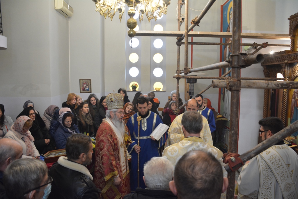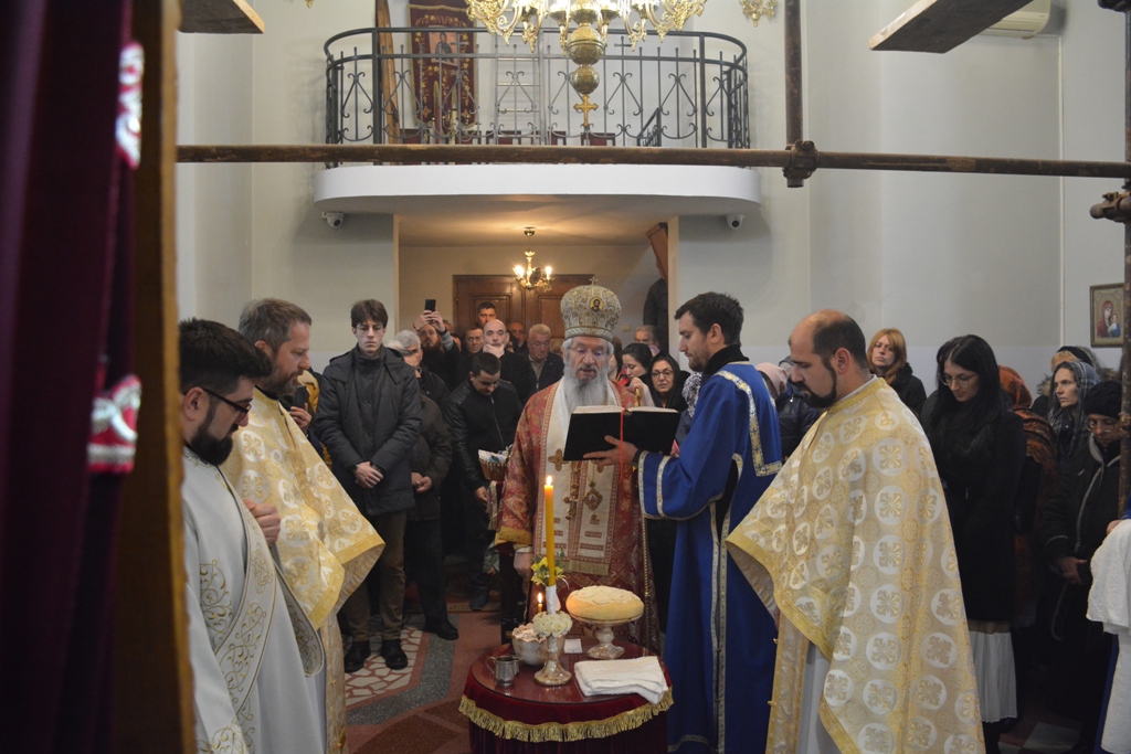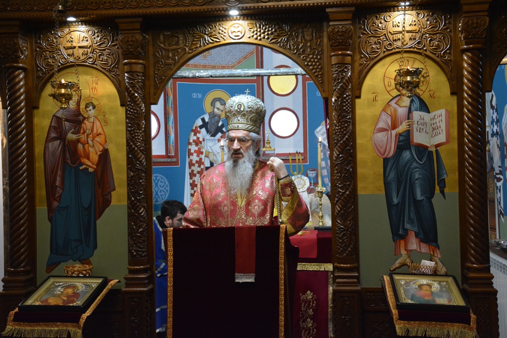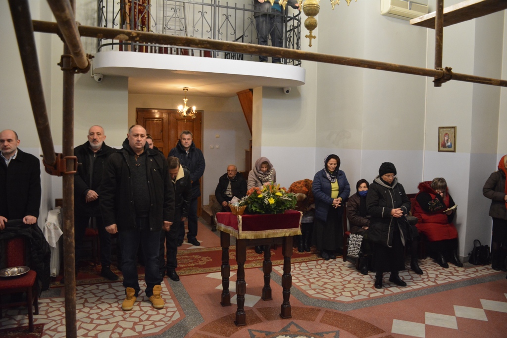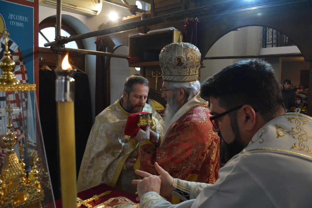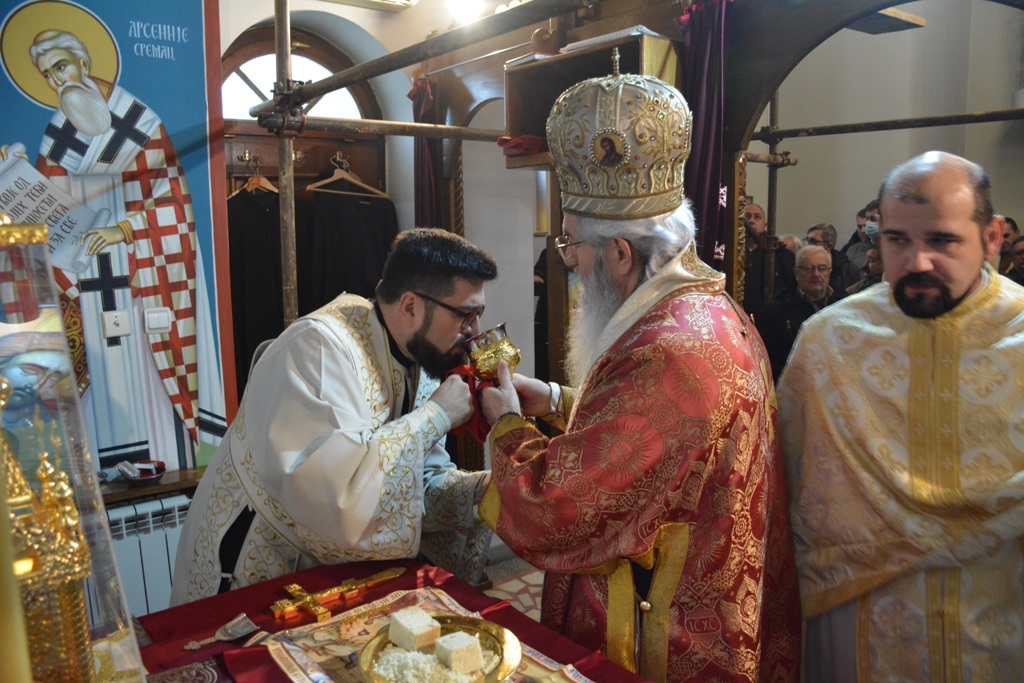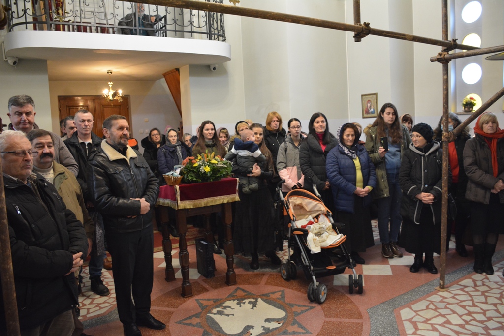 Владика је причестио вернике из Чаше бесмртности, пресекао славки колач, и после Свете Литургије је, уз топле речи, верницима поделио иконице. Благословио је, и својим присуством увеличао, славски доручак, који је за служашче и за вернике припремио свештеник Милош Ђурић.