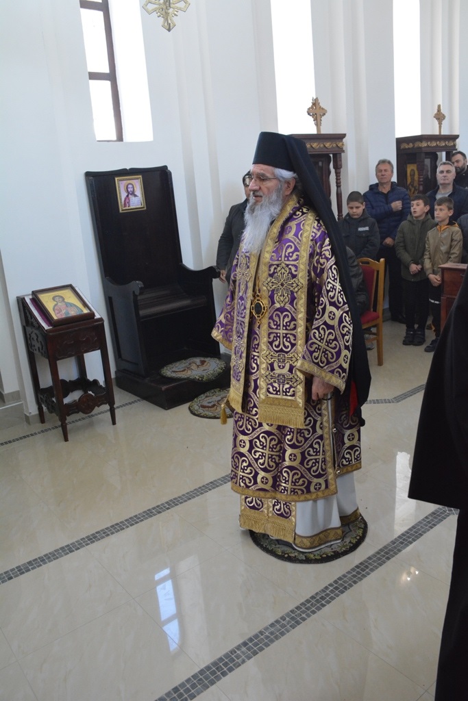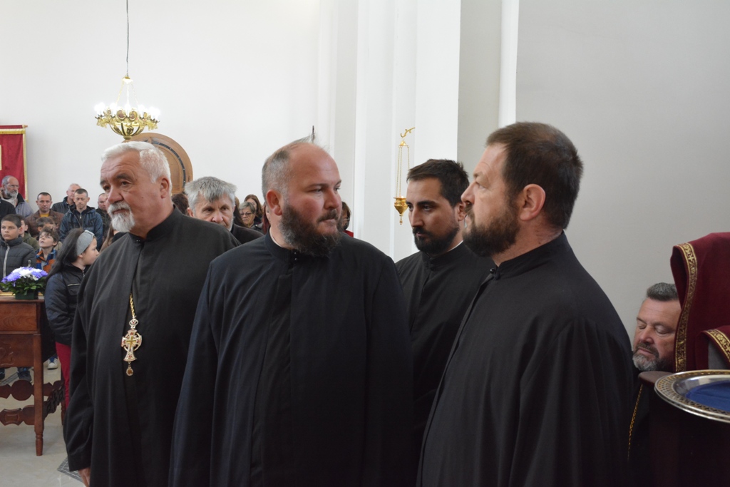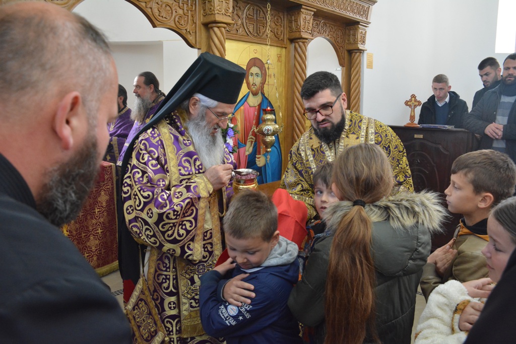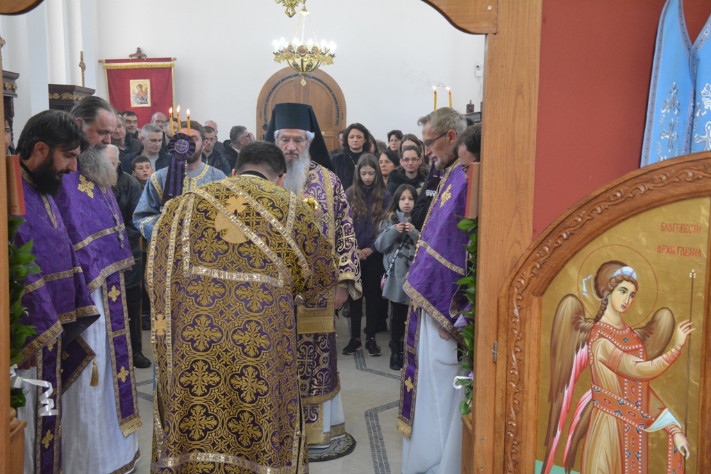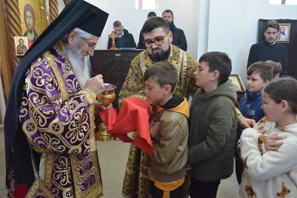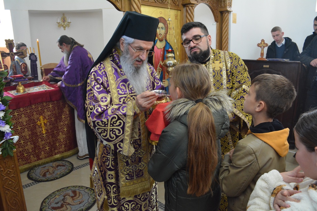 У богонадахнутој беседи Владика Јован је рекао: “Окупили смо се да служимо Свету Литургију, да се Богу молимо, да молимо Бога да нам буде милостив; а Он јесте милостив. Он ће своју милост пружати према нама онолико колико смо ми милостиви према њему, колико смо милостиви једни према другима. Да заблагодаримо Богу што нас је привео овој недељи, и на сам почетак ове недеље сабрао овде, јер ова недеља, шеста недеља Великог и васкршњег поста јесте увод у Велику недељу, Страсну недељу.Називамо је страсном јер је Господ ради нас и ради наших грехова страдао за нас. Прихватио је да Га људи и пљују и шамарају и прикују живог на Крст, све из љубави према нама. И у оме јесте највећа љубав Божија што нас је Господ управо преко Крста загрлио. И ми тога треба да се сећамо, да се сећамо те љубави Божије, да је Бог Отац није пожалио свог јединородног Сина да страда да се ми поново спасемо, да се ми поново вратили тамо где нам је намењено место било пре пада, а то је рај. Зато Господ нас позива увек, а посебно у овим посним данима да се молимо. Њему молитве наше нису потребне, али су нама потребне. Зашто? Зато ако се правилно молимо и разговарамо са Богом, да применимо то на свакодневни живот, ако хоћемо да нешто добијемо од неког човеке. Ми понизно молимо, и ако кажемо молим те дај ми то, поајми ми. И добићеш. Али ако са дрскошћу кажемо: ма мораш да ми даш, е неће нам дати ни овајчовек, неће нам дати ни Бог. Зато Бог тражи молитву, наше смирење, нашу љубав. Бог нам је дао себе тимре што нам је дао Цркву, што нам се даје у Цркви и даје нам се Господ у свим хришћанским врлинама у свим светим тајнама, а највише нам се даје Господ у Светој тајни Причешћа. Пазите, Бог нас не оставља, него нам даје себе, да ми још овде у овоме свету, кроз Причешће, осетимо ту заједницу са Богом, осетимо да примамо самога Господа у себе. И зато човек када се причешћује више није сам човек, он је са Богом. Има ли већег дара него да човек буде са Богом и да Бог буде с њиме. Ми требамо да се што чешће ппричешћујемо. Ми треба да верујемо да је у Причешћу сам Господ. Ми вером долазимо до Бога. Али исто тако и вером прилазимо светом Причешћу. Јер ми који се причешћујемо стално треба да се сећамо оних речи Христових ко једе моје тело и пије моју Крв у мени обитава и ја у њему. Заиста Бог обитава у нама. Зато Свети оци кажу онај човек који се причешћује пребива у Богу и Бог обитава у њему. Па куд ћеш већег дара, зар можемо имати већи дар него да Бога задобијемо. Ми људи осећамо дарове овоземаљске које Бог и људи дају. Осећамо и дар што нам је Бог дао живот. Осећамо дар ако живимо хришћанским животом. Осећамо дар кад нам Бог даје пород, кад нам Бог даје другог човека поред себе. Али све је то неупоредиво са даром када Бог себе нама даје. Е зато кажем када се причешћујемо треба да верујемо. Ми примамо самога Бога, не некакве симболе. Зато је потребно, колико год је то могуће нама грешнима, палима, да се припремамо за свето причешће. Има разних начина на које се припремамо: то је пост, стрпљење, милосрђе, молитва, али највећа и најзначајнија припрема наша треба да се састоји у нашем покајању и у нашем исповедању грехова. Искрено покајање. Покајање је велико чудо, велика сила, велика моћ, која преображава човека из грешног у светост, из грешног стања у праведно стање.