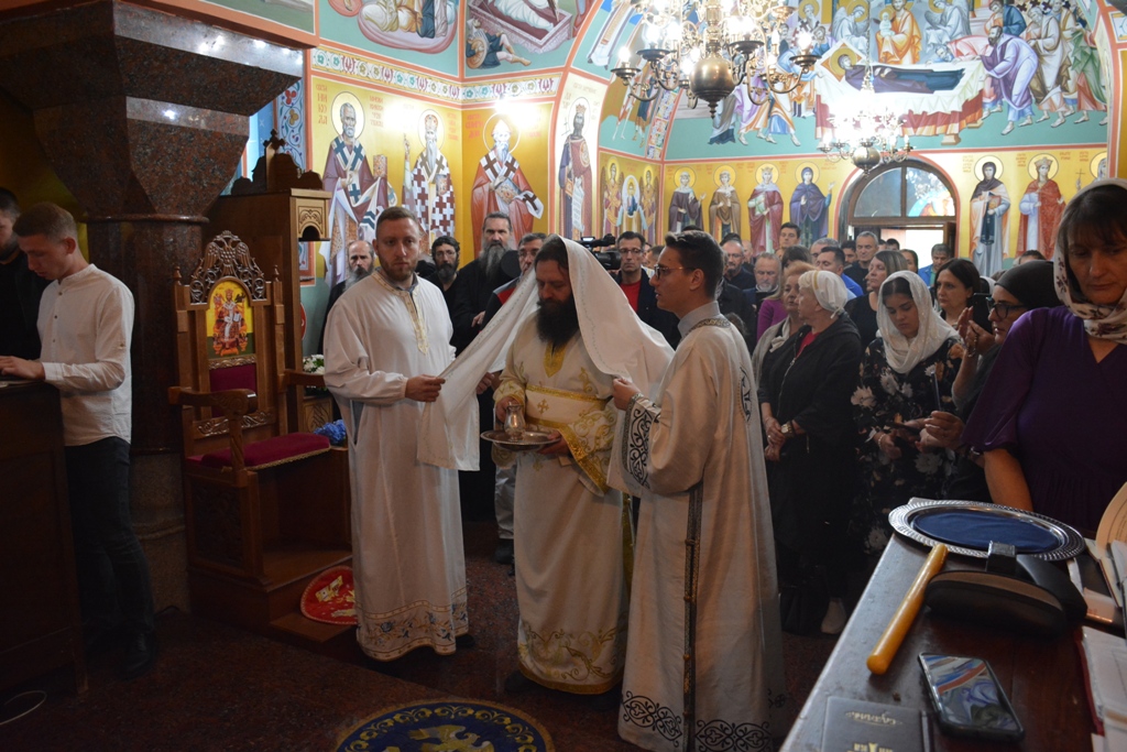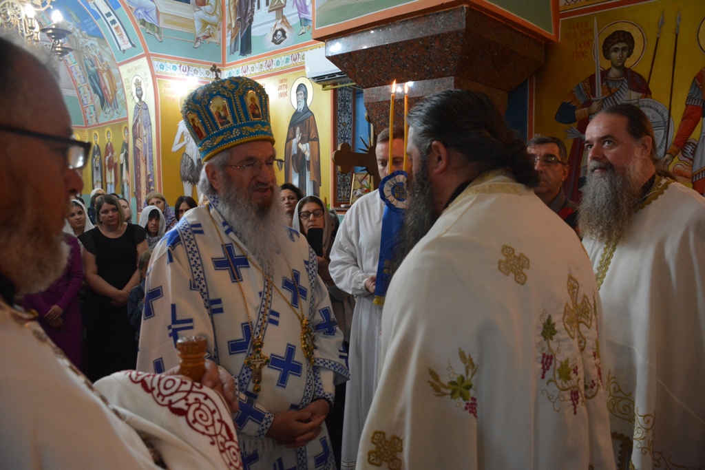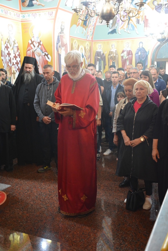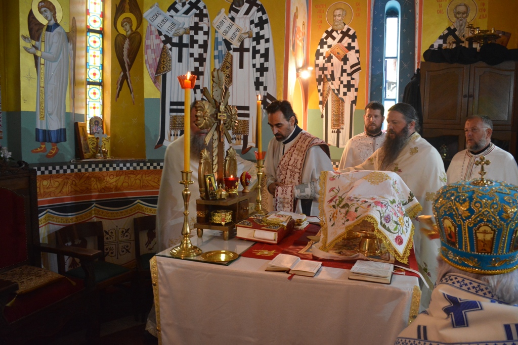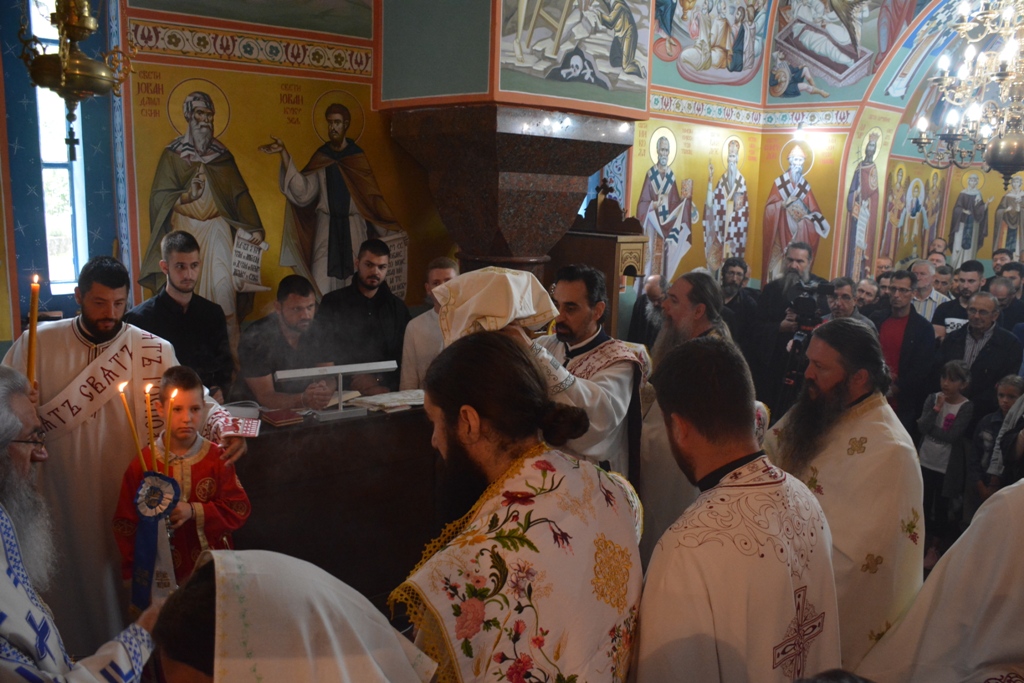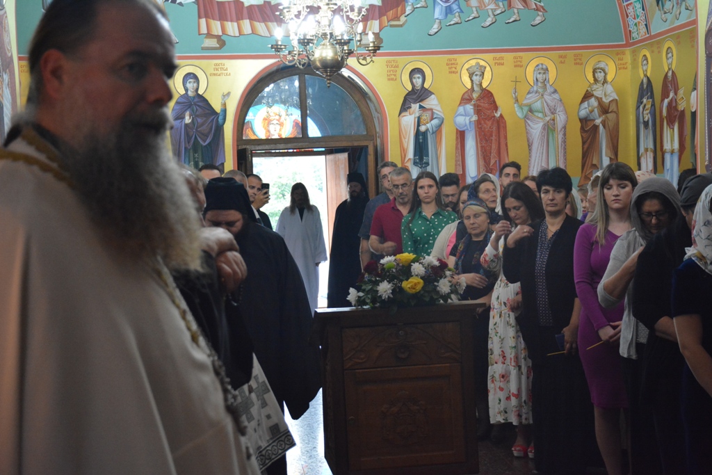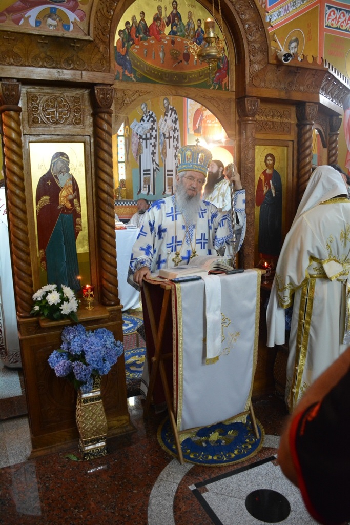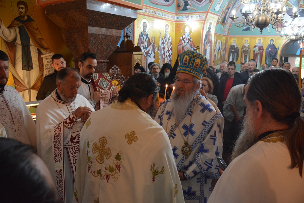 Након прочитаног Јеванћелског зачала Преосвећени Владика обратио се сабраном народу рекавши да нам се Литургијом даје Христос, даје нам се Царство Небеско. Литургијом нам се даје правило којим треба да живимо да би задобили спасење и да би задобили Царство Небеско. Сама реч Литургија знаћи благодарење, што значи да ми благодаримо Богу за све оно што нам Бог даје. А нама Бог браћо и сестре даје много више него што мислимо, тј. много нам више добра даје која ми не знамо, али је Богу све знано. Литургија спуста небо на земљу, а земљу уздиже на небо, али уздиже и оне људе који стоје на земљи, који стоје у храму, али којима су ум и срце, и мисли и речи уперене ка Богу, односно ка Небу. Сваки човек када устане изјутра прво треба да заблагодари Богу па тек онда да настави да се моли. Јер онај који не зна да благодари не зна правилно ни да се моли. Стога треба да се научимо да благодаримо Богу, не само када добијамо оно за шта се молимо, већ и онда када то не добијамо. Јер када нам даје оно за шта му се молимо и када нам не даје, Бог то чини ради нашег спасења. Бог зна када нама треба шта да подари. Он зна када треба да одговори на наше молбе, на наше молитве, јер Бог нас познаје боље него што ми мислимо да себе познајемо. Човек често о себи мисли да је бољи него што јесте, да је бољи од другога. То није хришћански. Све док не схватимо и не сматрамо да су други бољи од нас ми нећемо постати бољи. Све док се гордимо и мислимо о себи више него што јесмо ми доказујемо да смо управо ништа јер се сами истичемо, јер хришћанско није да се ми истичемо ни у чему, наше је да се молимо, да благодаримо, наше да нас други истичу, а то не можемо без смирења, без љубави, без наде, без Светих Тајни и светих врлина.
