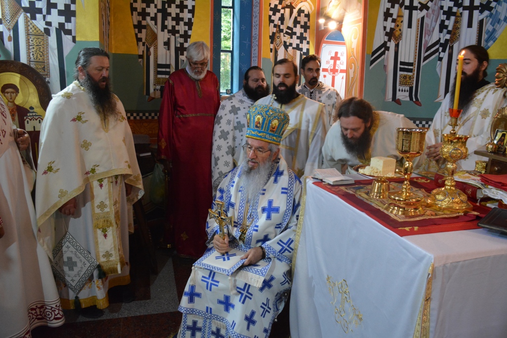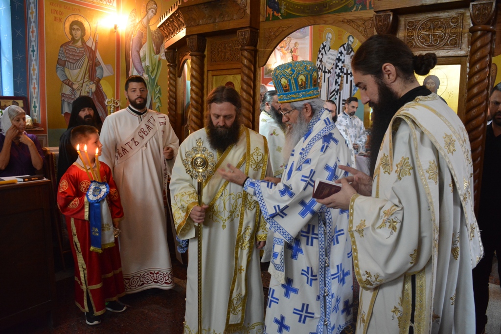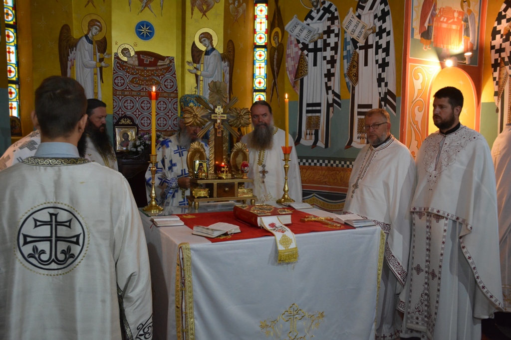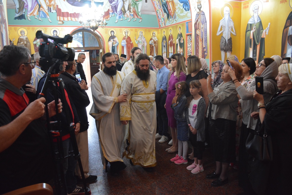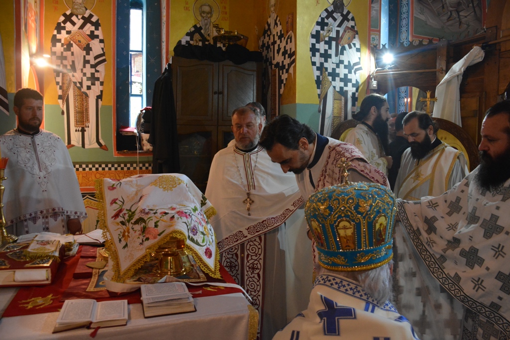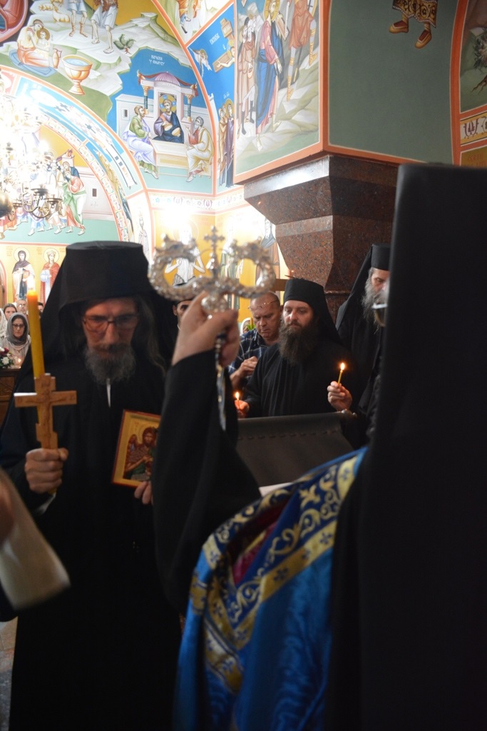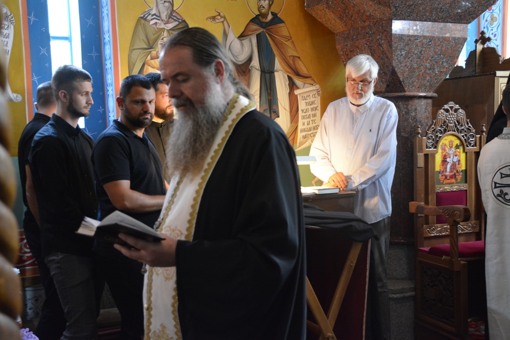 Након прочитаног Јеванћелског зачала Преосвећени Владика обратио се сабраном народу рекавши да нам се Литургијом даје Христос, даје нам се Царство Небеско. Литургијом нам се даје правило којим треба да живимо да би задобили спасење и да би задобили Царство Небеско. Сама реч Литургија знаћи благодарење, што значи да ми благодаримо Богу за све оно што нам Бог даје. А нама Бог браћо и сестре даје много више него што мислимо, тј. много нам више добра даје која ми не знамо, али је Богу све знано. Литургија спуста небо на земљу, а земљу уздиже на небо, али уздиже и оне људе који стоје на земљи, који стоје у храму, али којима су ум и срце, и мисли и речи уперене ка Богу, односно ка Небу. Сваки човек када устане изјутра прво треба да заблагодари Богу па тек онда да настави да се моли. Јер онај који не зна да благодари не зна правилно ни да се моли. Стога треба да се научимо да благодаримо Богу, не само када добијамо оно за шта се молимо, већ и онда када то не добијамо. Јер када нам даје оно за шта му се молимо и када нам не даје, Бог то чини ради нашег спасења. Бог зна када нама треба шта да подари. Он зна када треба да одговори на наше молбе, на наше молитве, јер Бог нас познаје боље него што ми мислимо да себе познајемо. Човек често о себи мисли да је бољи него што јесте, да је бољи од другога. То није хришћански. Све док не схватимо и не сматрамо да су други бољи од нас ми нећемо постати бољи. Све док се гордимо и мислимо о себи више него што јесмо ми доказујемо да смо управо ништа јер се сами истичемо, јер хришћанско није да се ми истичемо ни у чему, наше је да се молимо, да благодаримо, наше да нас други истичу, а то не можемо без смирења, без љубави, без наде, без Светих Тајни и светих врлина.