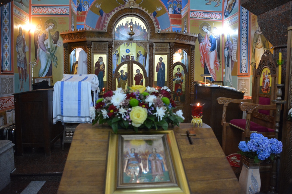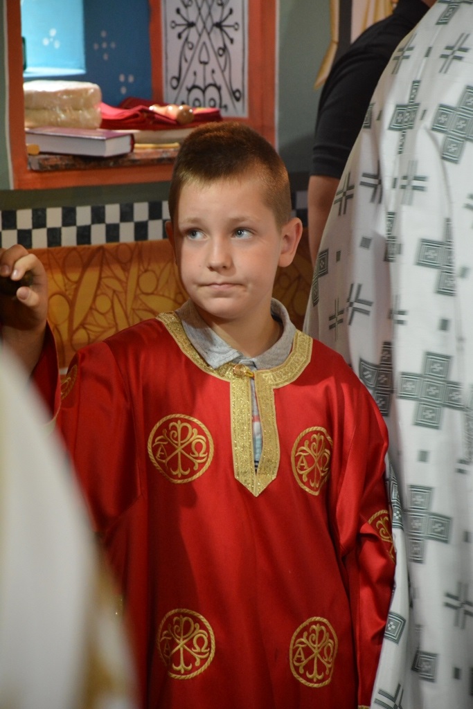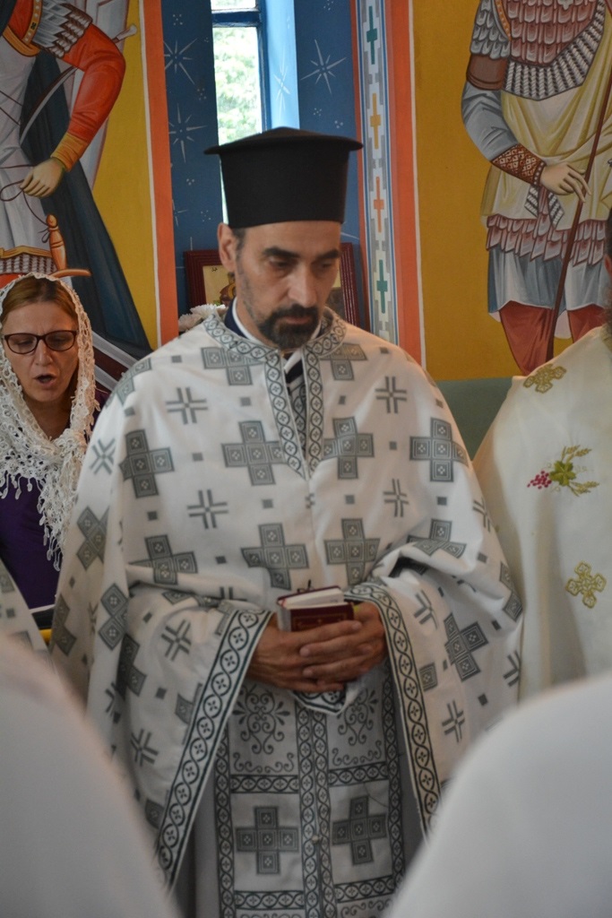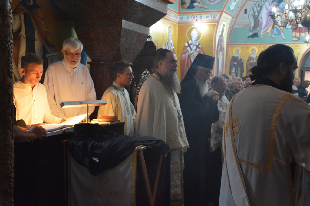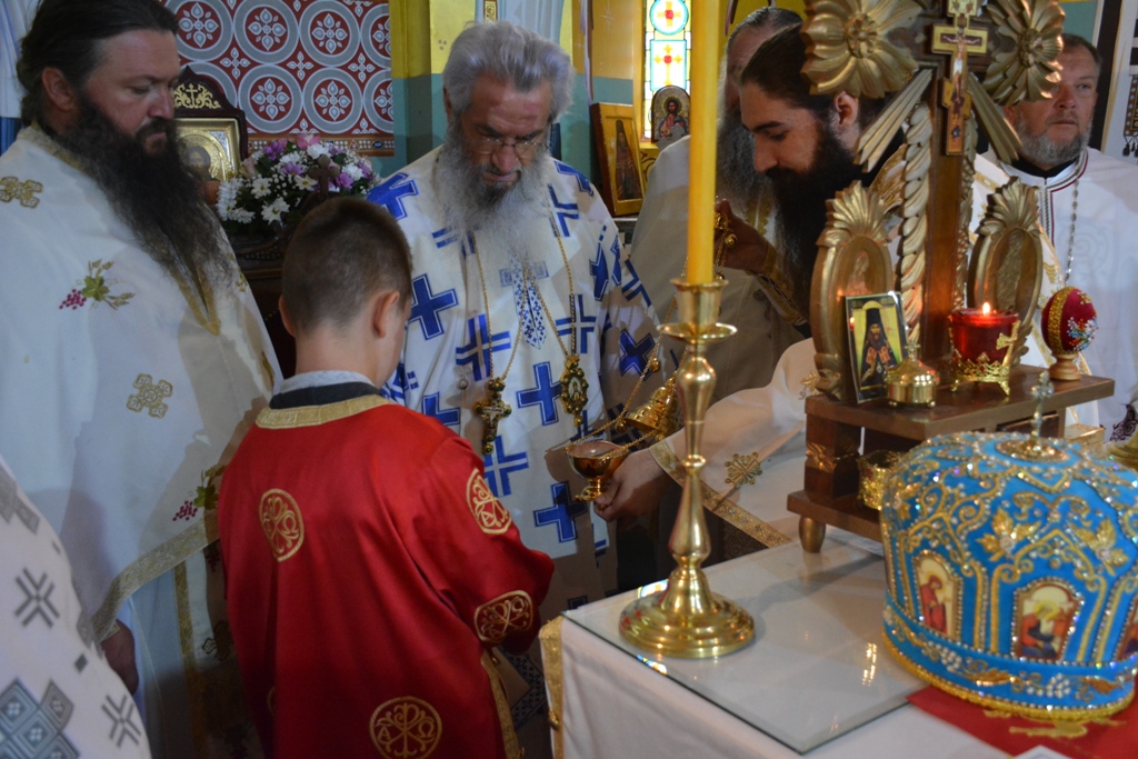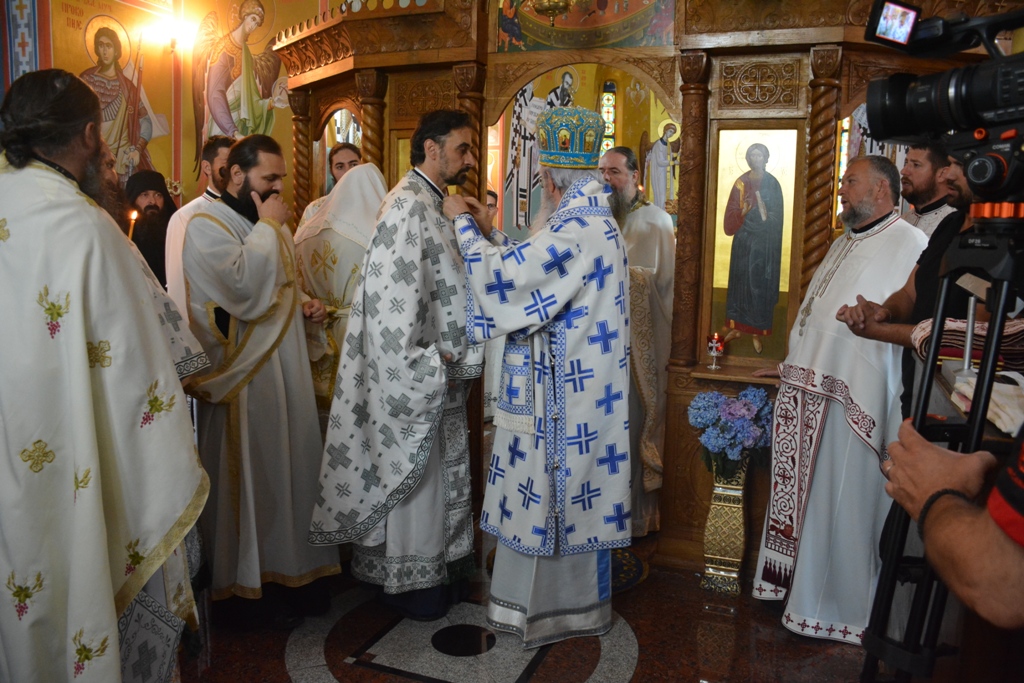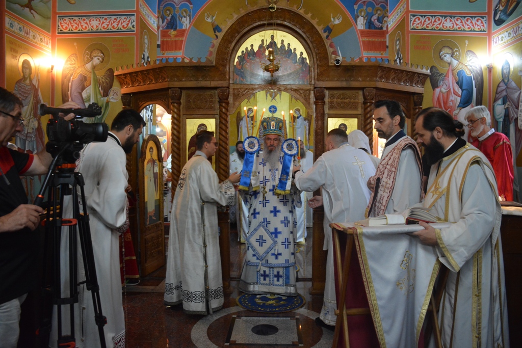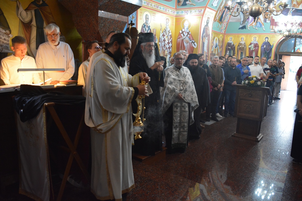 Након прочитаног Јеванћелског зачала Преосвећени Владика обратио се сабраном народу рекавши да нам се Литургијом даје Христос, даје нам се Царство Небеско. Литургијом нам се даје правило којим треба да живимо да би задобили спасење и да би задобили Царство Небеско. Сама реч Литургија знаћи благодарење, што значи да ми благодаримо Богу за све оно што нам Бог даје. А нама Бог браћо и сестре даје много више него што мислимо, тј. много нам више добра даје која ми не знамо, али је Богу све знано. Литургија спуста небо на земљу, а земљу уздиже на небо, али уздиже и оне људе који стоје на земљи, који стоје у храму, али којима су ум и срце, и мисли и речи уперене ка Богу, односно ка Небу. Сваки човек када устане изјутра прво треба да заблагодари Богу па тек онда да настави да се моли. Јер онај који не зна да благодари не зна правилно ни да се моли. Стога треба да се научимо да благодаримо Богу, не само када добијамо оно за шта се молимо, већ и онда када то не добијамо. Јер када нам даје оно за шта му се молимо и када нам не даје, Бог то чини ради нашег спасења. Бог зна када нама треба шта да подари. Он зна када треба да одговори на наше молбе, на наше молитве, јер Бог нас познаје боље него што ми мислимо да себе познајемо. Човек често о себи мисли да је бољи него што јесте, да је бољи од другога. То није хришћански. Све док не схватимо и не сматрамо да су други бољи од нас ми нећемо постати бољи. Све док се гордимо и мислимо о себи више него што јесмо ми доказујемо да смо управо ништа јер се сами истичемо, јер хришћанско није да се ми истичемо ни у чему, наше је да се молимо, да благодаримо, наше да нас други истичу, а то не можемо без смирења, без љубави, без наде, без Светих Тајни и светих врлина.