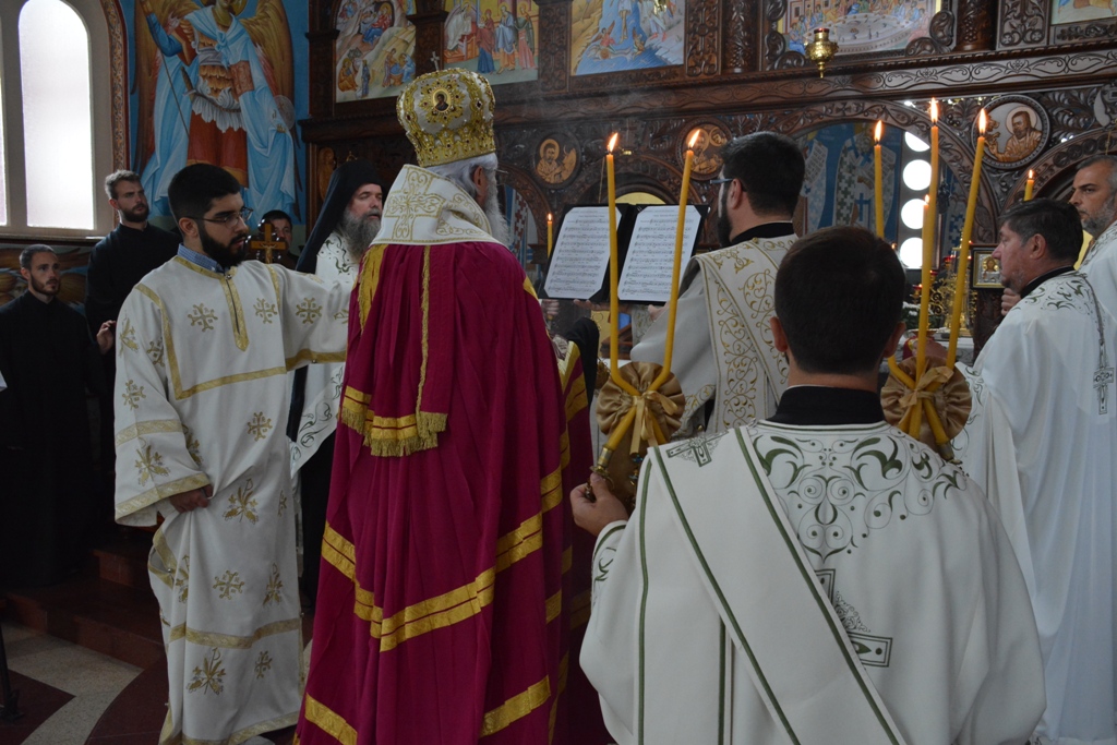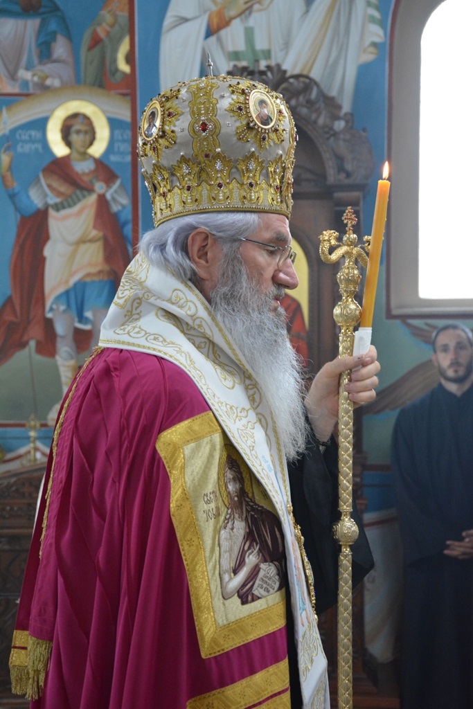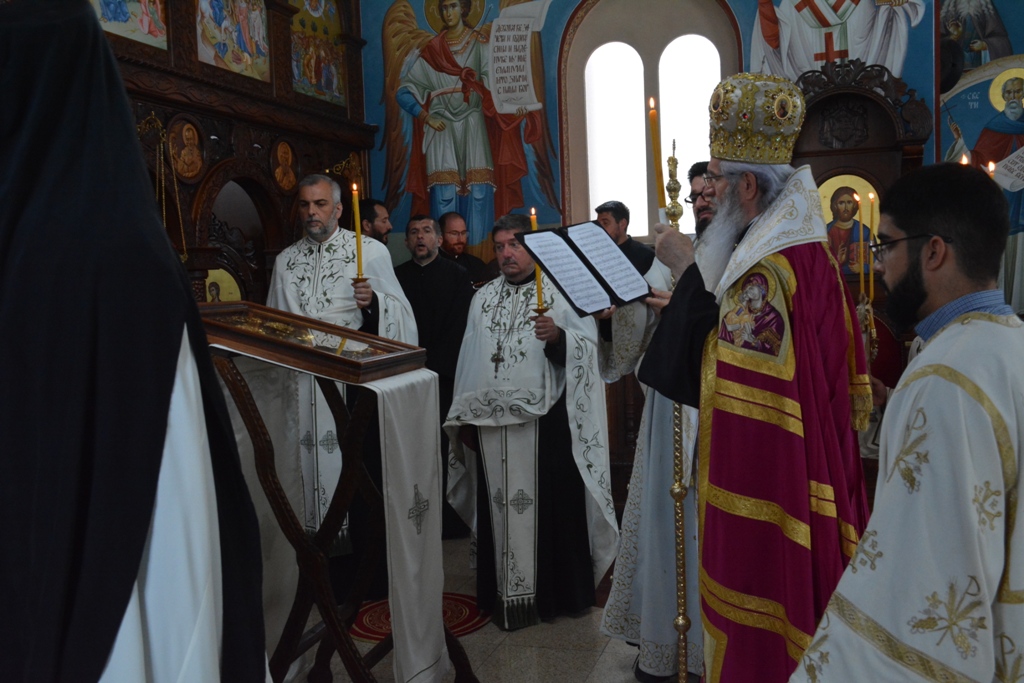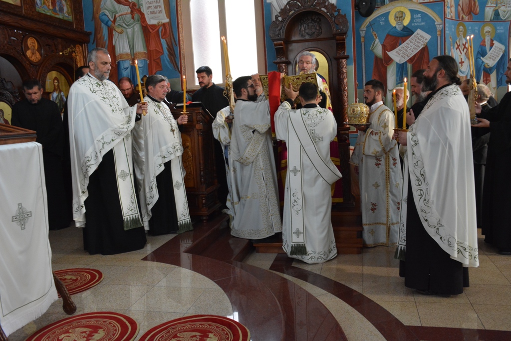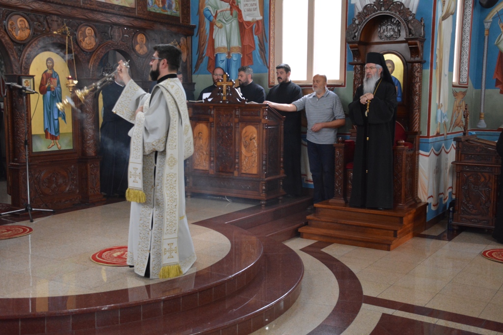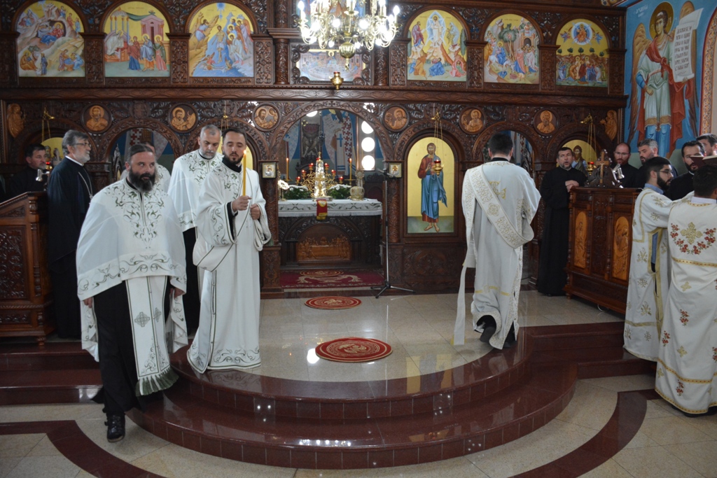 Његовом Преосвештенству су саслуживали ректор Богословије Светог Јована Златоуста протојереј-ставрофор проф. др Зоран Крстић, архимандрит Петар (Драгојловић) игуман манастира Пиносава, протојереј Љубиша Ђураш, протонамесник Иван Теодосић, протођакон Иван Гашић и ђакон Александар Бабић.