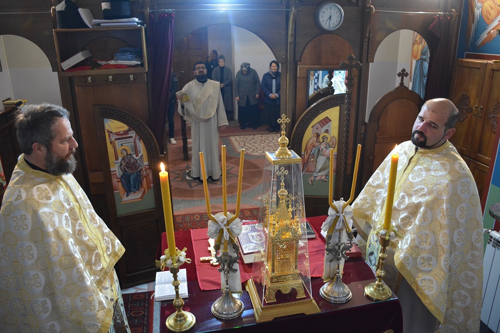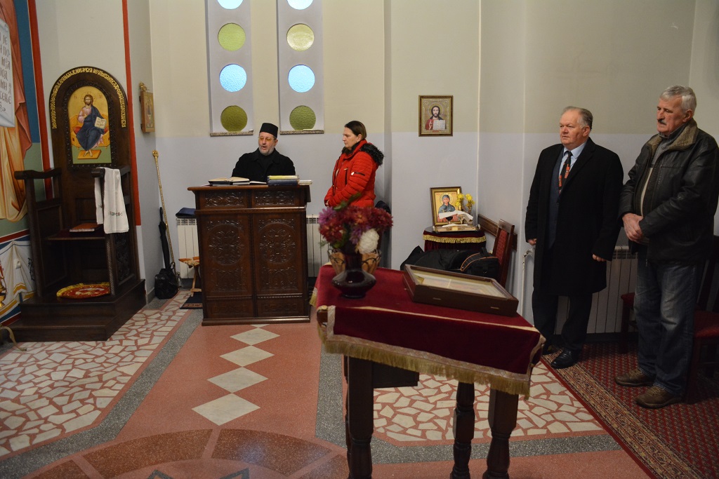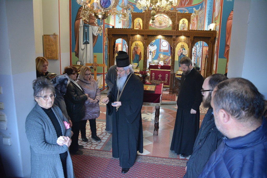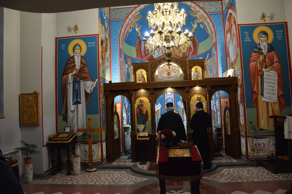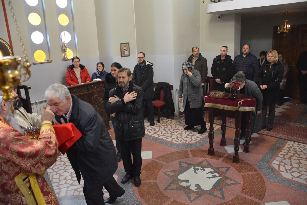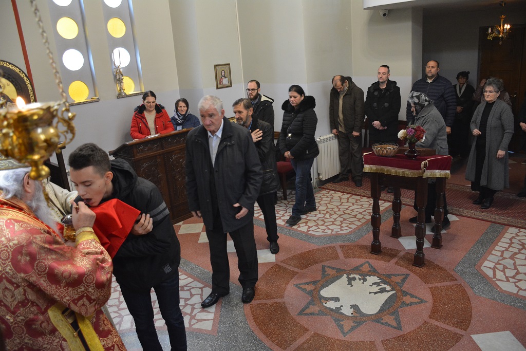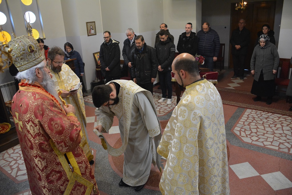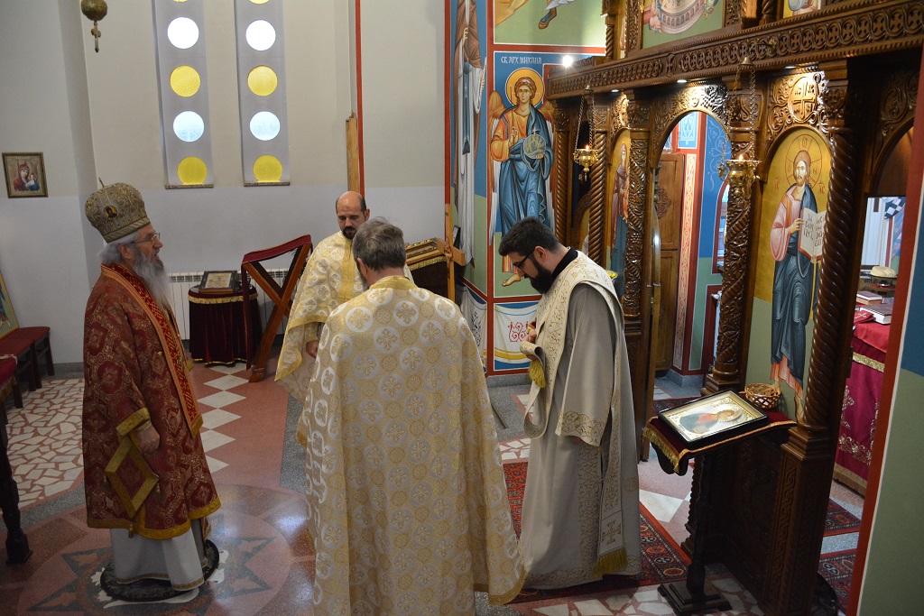 Његовом Преосвештенству саслуживали су протојереј Саша Антонијевић, јереј Милош Ђурић и протођакон Иван Гашић, док је за певницом појао протојереј Драгослав Милован.