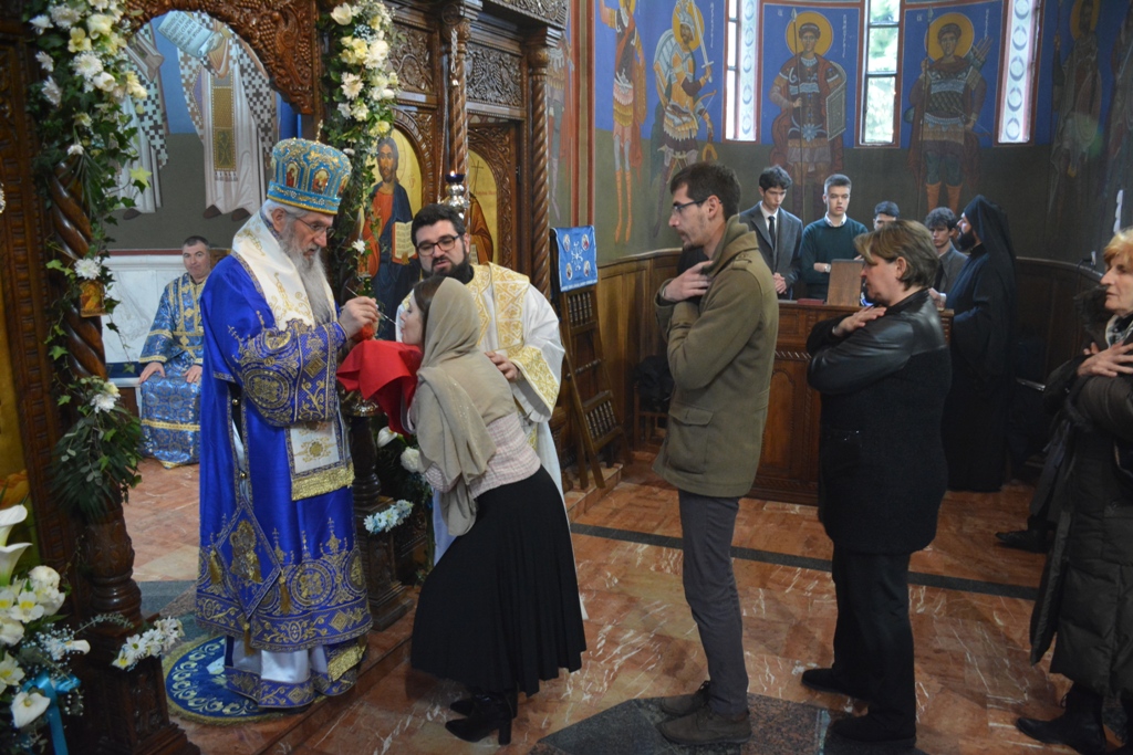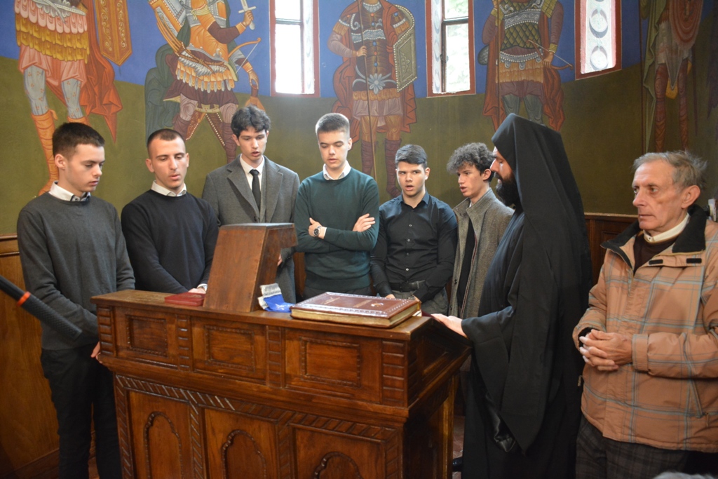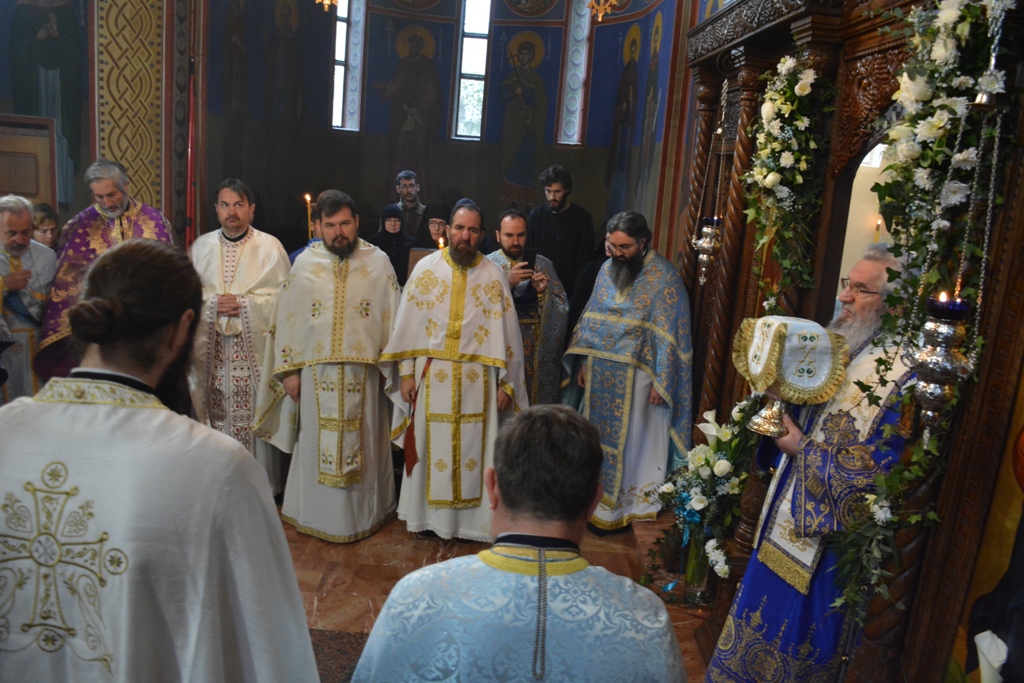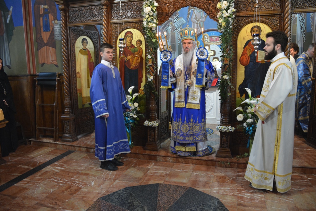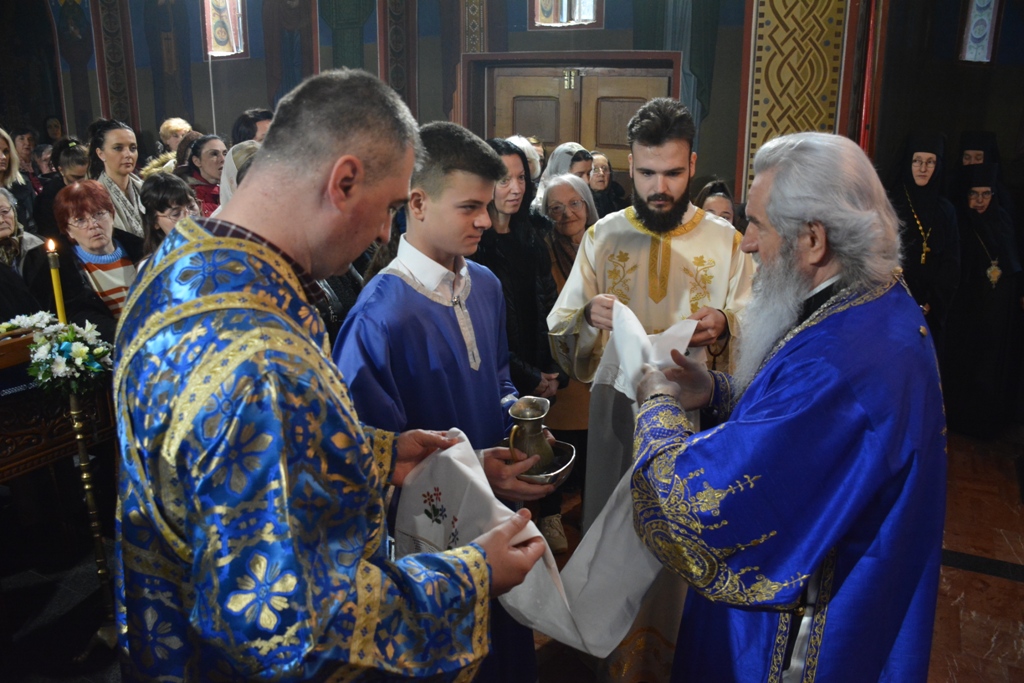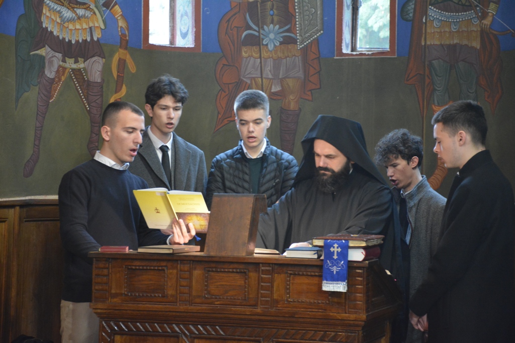 Свету Архијерејску литургију су својим појањем улепшали ученици Богословије, предвођени професором певања јерођаконом Василијем (Старовлахом).