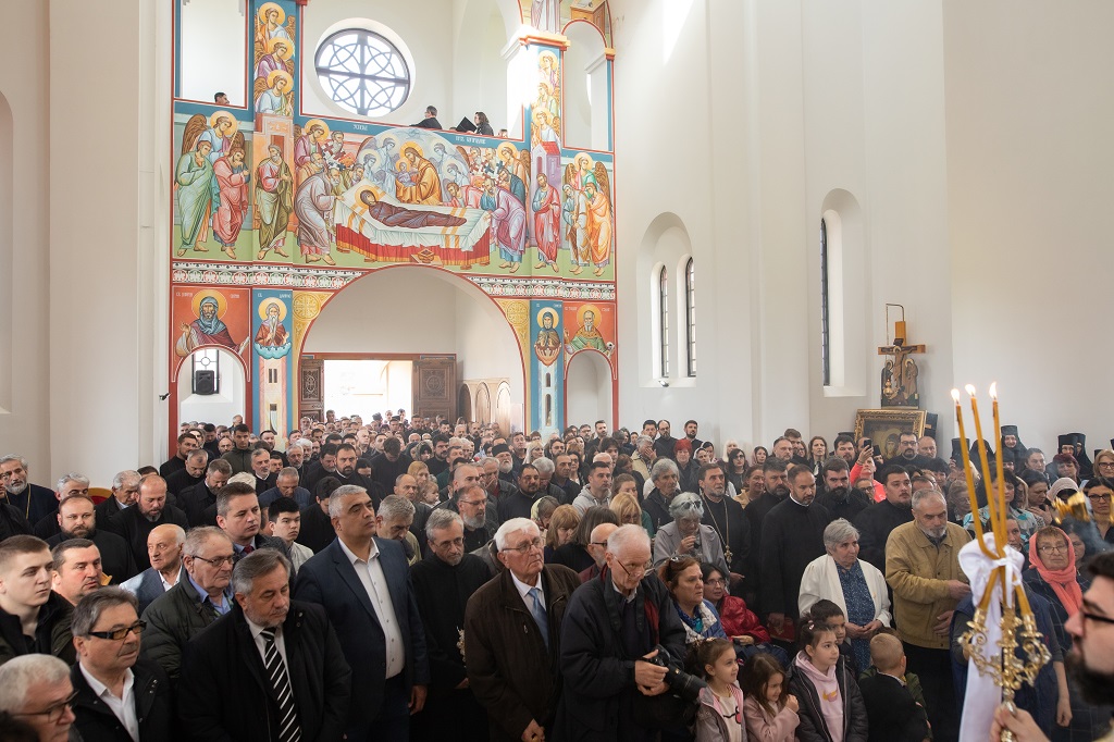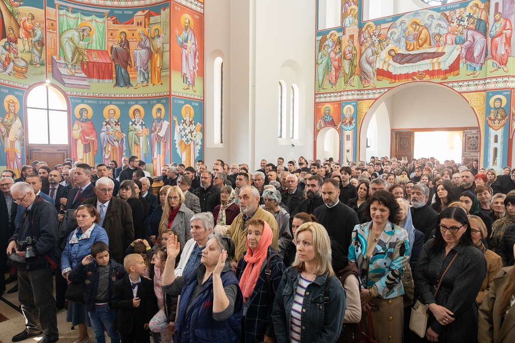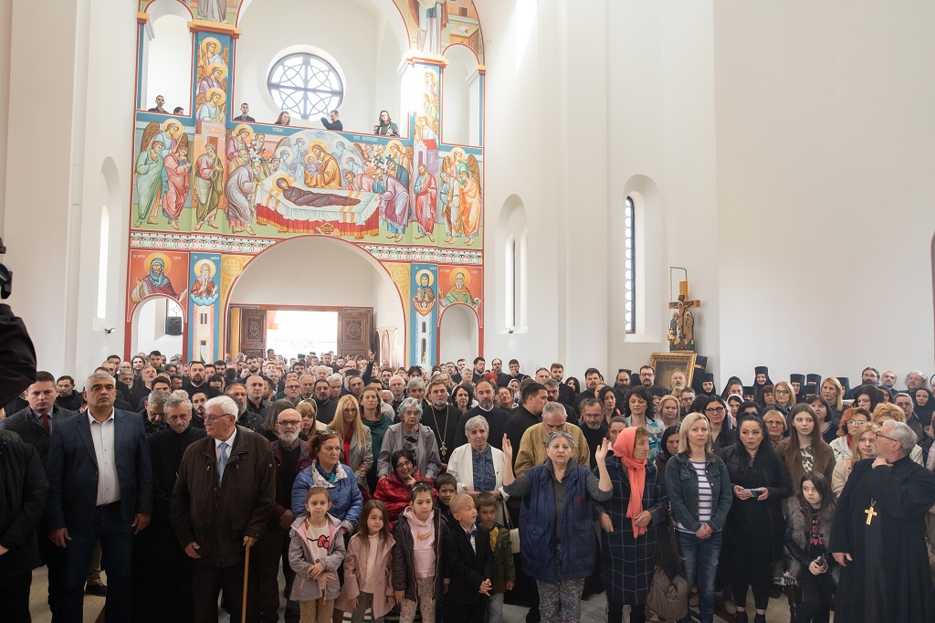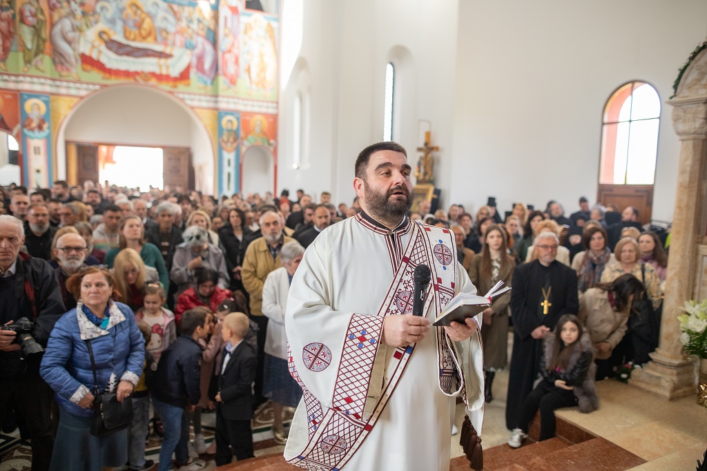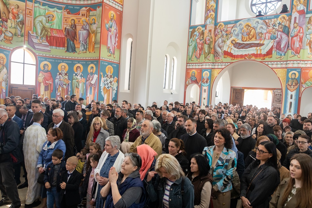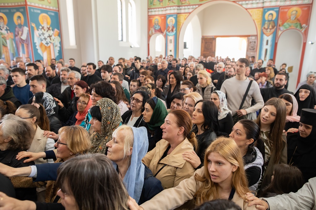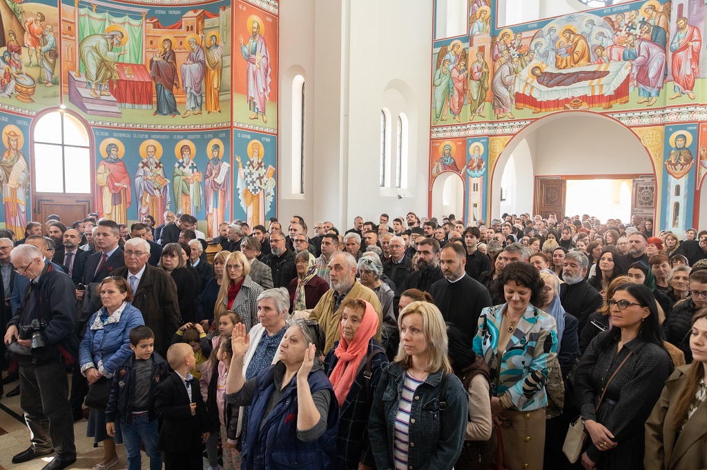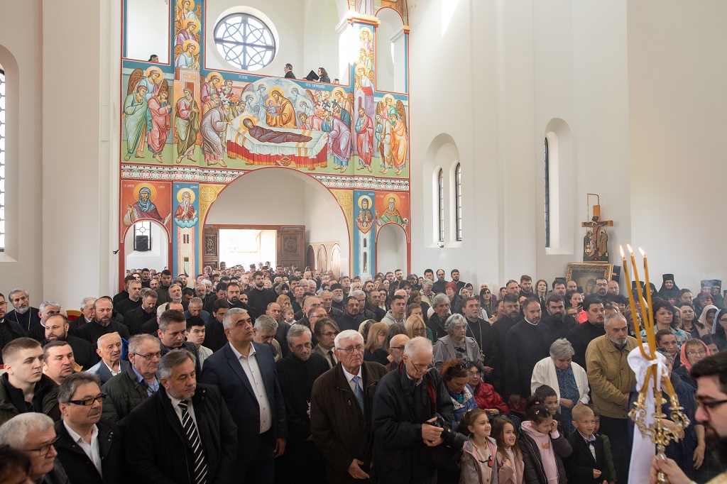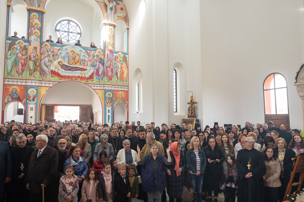 Браћо и сестре! Ако хоћемо искрено да размислимо и да будемо искрени и поштени, онда ћемо схватити и разумети да ми највише сами себе оптерећујемо и то собом. Највише својим егом, највише тиме што сам заокупљен собом, али заокупљен како да се истакнем, како да се покажем, како да се прикажем бољим него што јесам, значајнијим него што јесам. То је у људској природи и то је оно све што у ствари не дозовљава да заиста Христа примимо у себе и да носимо Христа у себи, да би Христос носио нас. Дакле, рекох браћо и сестре, Крст је знак наше припадности, наше вере. И отуда идентитет наше вере се црпи и произилази управо из Васкрсења, а не из неких ритуала. Не из неких наших обичаја, за које мислимо да се на њима заснива идентитет наше вере. Понављам и себи и вама, идентитет наше вере је управо у Васкрсењу, у вери у Васкрсење или другим речима у вери у загробни, вечни живот. То је та вера коју би требало да ми чувамо и којом би требало да живимо. Да чувамо веру, да би нас вера чувала. Да живимо вером, да би вером спознали и Бога и све тајне неба и земља, а значи и да би спознали и тајну другог човека. Све то управо произилази из Васкрсења, а то значи да доброта и врлине које носимо, које испуњавамо нису узалудне и неће бити узалудне. Све што добро учинимо на овоме свету, неће нам пропасти. Неће остати не награђено од стране Бога. Но, не смемо то што чинимо, да чинимо у своју славу и у своје име, да би могао казати – ја сам то, то и то створио – него да то чинимо у славу Божију. Кад чинимо у име Божије, чинимо у име свакога другога. Зато не можемо доброту да одвојимо од Бога, па да припишемо себи.