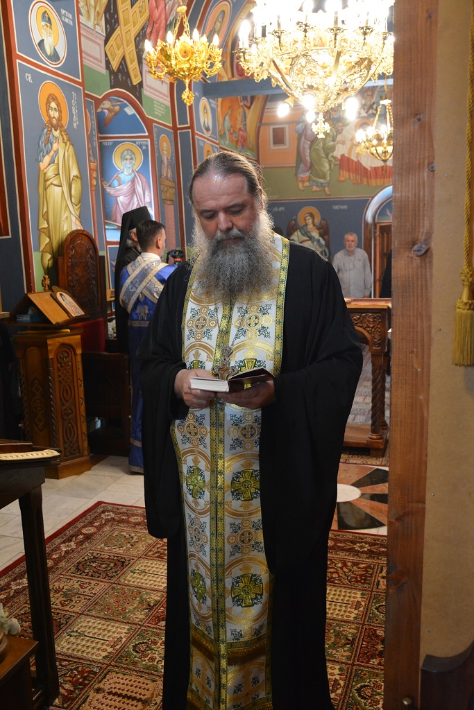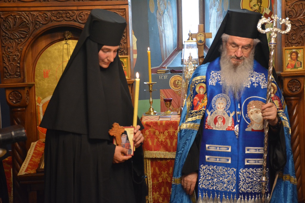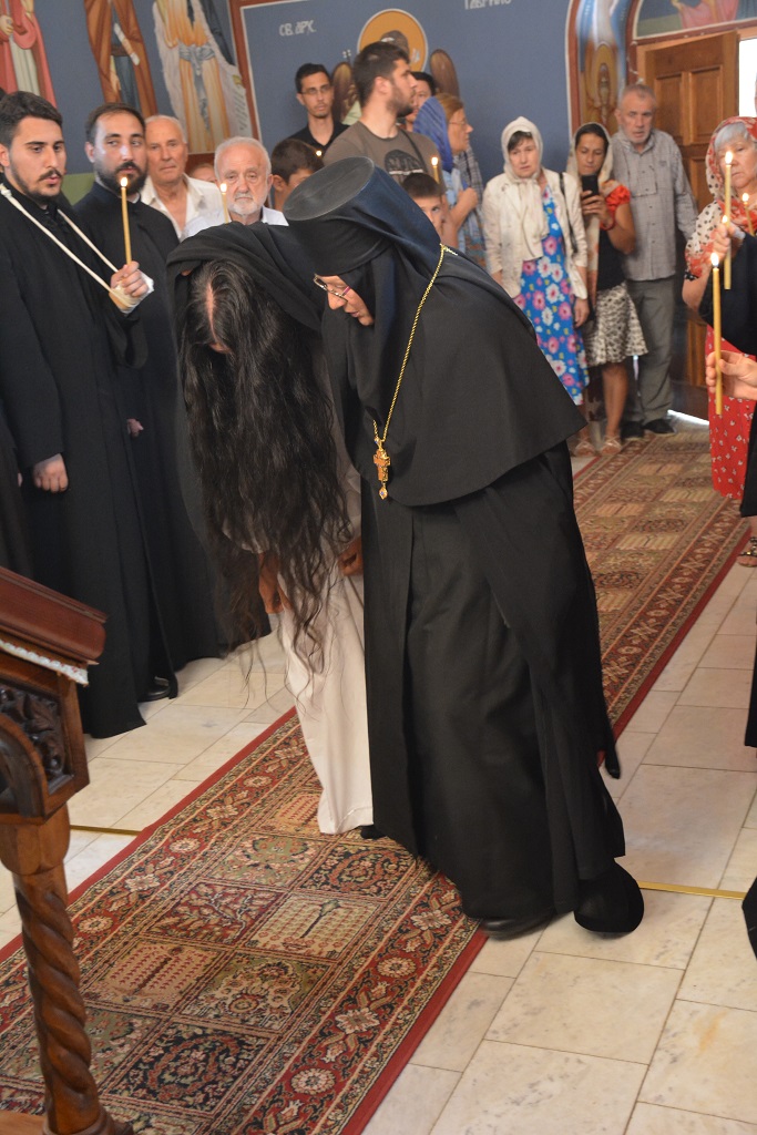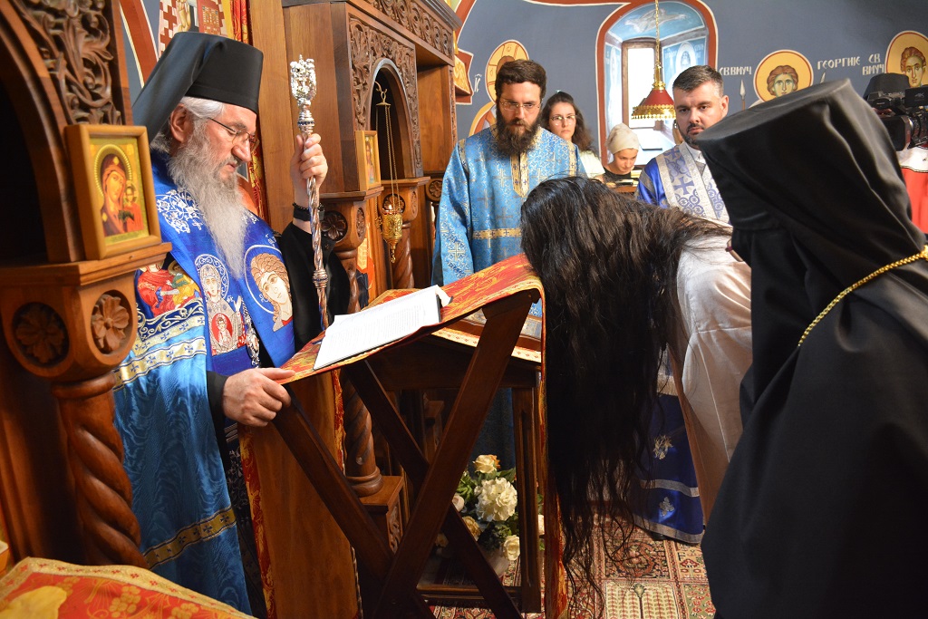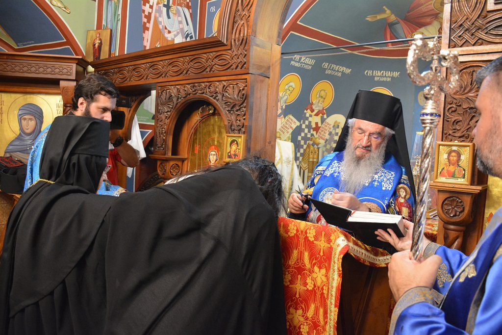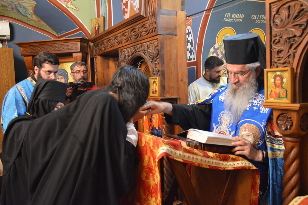 Преосвећени је посебно замолио сестру Јустину да не умује својим умом, то значи да никад неће бити послушна, него ће увек наћи неки изговор, да мисли да је овако или онако, а не како ти се каже. Преосвећени је подсетио на причу о послушнику Акакију, коме је игуман дао суво дрво и рекао му да га пободе и залива. Са вером је своје послушање извршио и Господ је наградио његово трпљење, његову послушност, његову веру и дрво је олистало и донело плод. Игуман је узео плод и унео у трпезарију и позвао братију да узме плода од послушности. Монаштво које нема послушност, које тера по својој вољи, то није монаштво. Преосвећени је посебно истакао да се сестра Јустина данас заручила Христу, да је данас невеста Христова, а Христос је женик свих нас, а да невеста од како је заручена, само мисли када ће да се сретне са својим жеником. Треба да исчекујемо женика Христа, али да му будемо верни, јер само оне који су у вери Господ награђује и даје им благослов, даје им вечност, даје им царство. Данас је сестра примила анђела чувара, али ни онај други није одступио. Замолио је да се усавршава у жртвеној љубави, да се жртвује за другу сестру, а љубав све покрива.