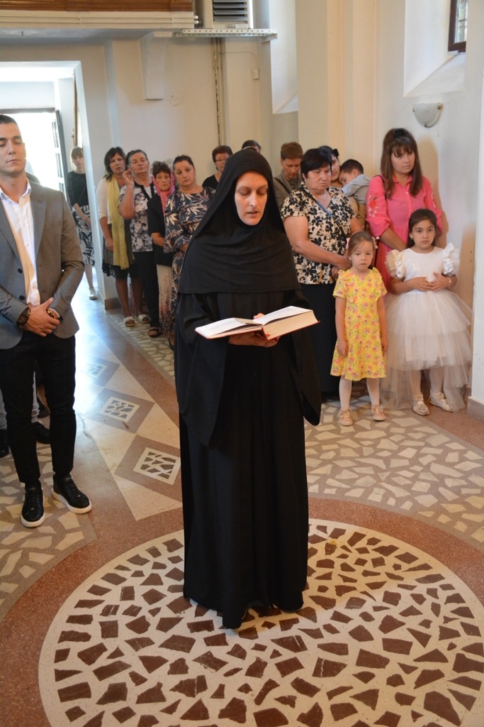 “Браћо и сестре, данас наша Црква прославља Свету мајку Ангелину Српску, као што нам је познато она је била деспотица, није рођена у Србији, рођена је у Албанији. Она је била мученица за веру Христову и била је монахиња. Њу је с правом наша Црква назвала мајком Ангелином, јер је она уистину била мајка, не само својој деци, већ сваком детету и свакој мајци она је била узор мајке, праве мајке. Она је била мајка у историји нашег рода и мајке у вечности. Реч мајка значи светиња браћо и сестре. И на њу, као и на Пресвету Богородицу, могу се упоредити оне речи Богородичине када је казала Светом Архангелу Гаврилу када је дошао да јој јави најрадоснију вест да ће она постати мајка Бога живога, тада је она рекла “Ево слушкиње Господње, нека ми буде по речи Твојој”. Света Ангелина је заиста слушала реч Божију, али није само слушала, него и извршавала, јер како је Господ рекао нису само блажени они који слушају, него они који слушају и испуњавају. Џаба нам је браћо и сестре да цело Свето Писмо знамо напамет ако не живимо по Јеванђељу. Човек који не слуша Бога иде за сваким, иде из греха у грех, из невоље у невољу. И заиста Света Ангелина је и слушала али и испуњавала реч Божију, и што је најважније живела је по речима Божијим. Њен живот красила је вера у Бога и љубав према Богу и према другима. Али она је изнад свега имала смирење”.