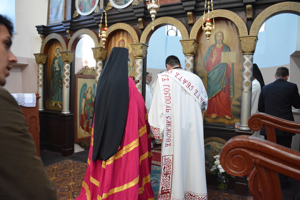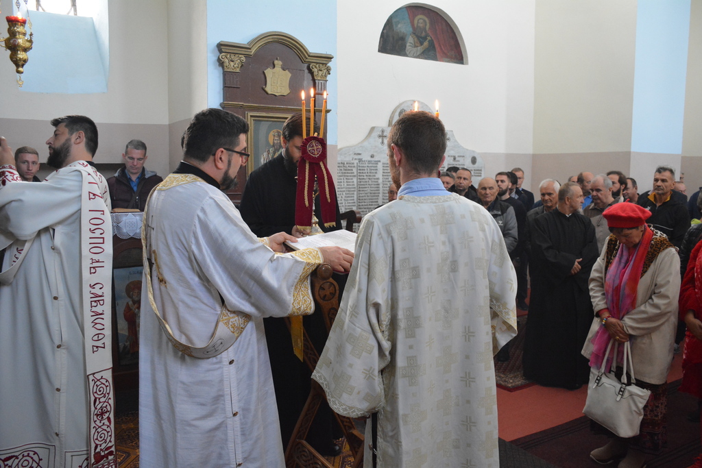 “У име Оца и Сина и Светога Духа. Помаже Бог браћо и сестре. Ми смо се данас сабрали у овоме светоме храму да првенствено служимо Свету Литургију, а служећи Божанствену Литургију ми служимо Богу, Цркви и себи. Колики је значај Литургије најбоље нам то говоре свети Оци који кажу да ће свет опстати све док се у њему врши Света Литургија. Литургија је та која нас држи, браћо и сестре, у сталном контакту са Богом и једне са другима. Јер Литургија се не служи само за једног човека, нити служи Литургију један човек. Литургија се служи за све подједнако, како за живе тако и за мртве. Литургију служе сви они крштени људи, поготово који знају шта је Литургија. Јер ко зна шта је Литургија он зна шта је и Црква, и ко зна шта је Црква, он зна шта је и Литургија. Тако да, браћо и сестре, Литургија је предукус Царства Небеског. А нама је најпотребније и у овоме и у ономе свету управо то Царство Небеско. И зато је Литургија тај предукус, предосећај тог Царства Небескога. И ако ми не осећамо то Божанско дејство благодати Свете Литургије онда не можемо ни да осетимо ни њену светињу. Литургија је прозор у вечност, и гледање у вечност. Она је темељ нашег хришћанског живота. Јер, ако нисмо на Литургији и ако не учествујемо у Литургији онда смо ми изгубљени и за овај и за онај свет. Зашто? Па зато, браћо и сестре, што се једино на Литургији ми причешћујемо и сједињујемо са Богом. А уколико се не сједињујемо са Богом, онда то значи да нисмо хришћани, значи да немамо праву веру, и да не знамо шта је Литургија. А Литургија је она Трпеза Господња коју је Господ поставио на Тајној Вечери пред своје страдање, и та трпеза никада се не скида, и неће се скинути све до краја света и века. На Трпези Господњој ми се хранимо самим Богом. Христос је себе ставио на ту Трпезу и све је позвао, али на жалост сви се не одазивају. Зато је Христос и рекао колики је значај Литургије, значај Причешћа, када је рекао: “Ко једе моје Тело и пије моју Крв има живота у себи”. Онај ко то не ради нема живота у себи, значи нема Бога у себи, а човек када нема Бога у себи он је празан човек. Али када се човек храни Христом, када верује у Бога, када живи вером, он је понављам испуњен Богом и испуњен је и другим људима, ближњима. Јер ми преко Бога долазимо до другог човека, и преко другог човека долазимо до Бога. Када је Бог у нама и у нашим срцима наше срце постаје безобални океан, а то значи да Бог проширује наше срце да прво Он уђе у њега, а онда у тако проширено срце, које је најомиљенији дом Божији, ми можемо да сместимо целу васељену, цело човечанство. А човек који нема Бога у себи јесте, сужени човек, саможив, човек који само мисли на себе, друге не види. А ако не видимо другога, онда ни нас неће погледати Бог. И зато, браћо и сестре, ми данас служимо Божанствену Литургију, која почиње са оним предивним возгласом који гласи: „Благословено Царство Оца и Сина и Светога Духа”, а то значи као да кажемо “Нека буде прослављено Царство Оца и Сина и Светога Духа.”, тј. прослављено Царство Тројице.