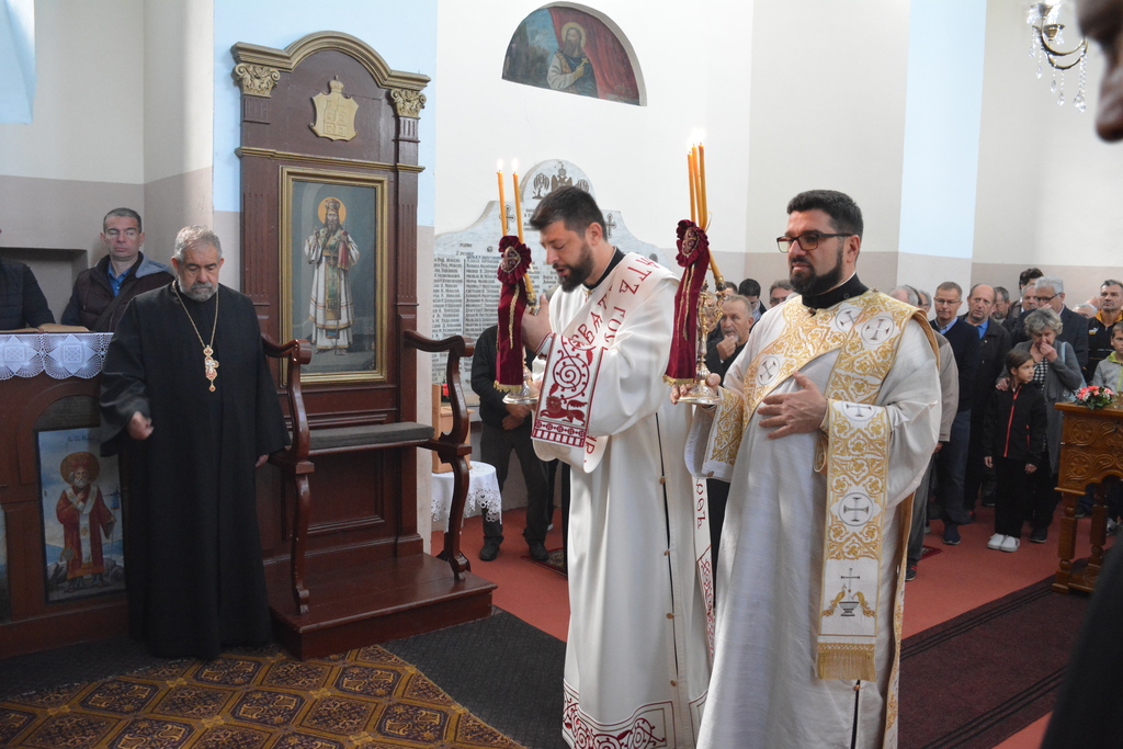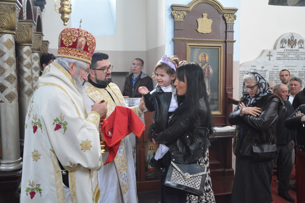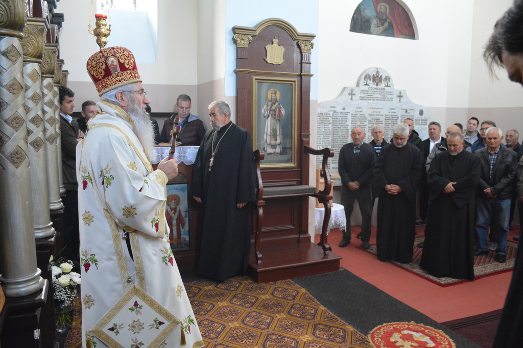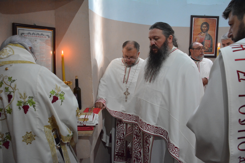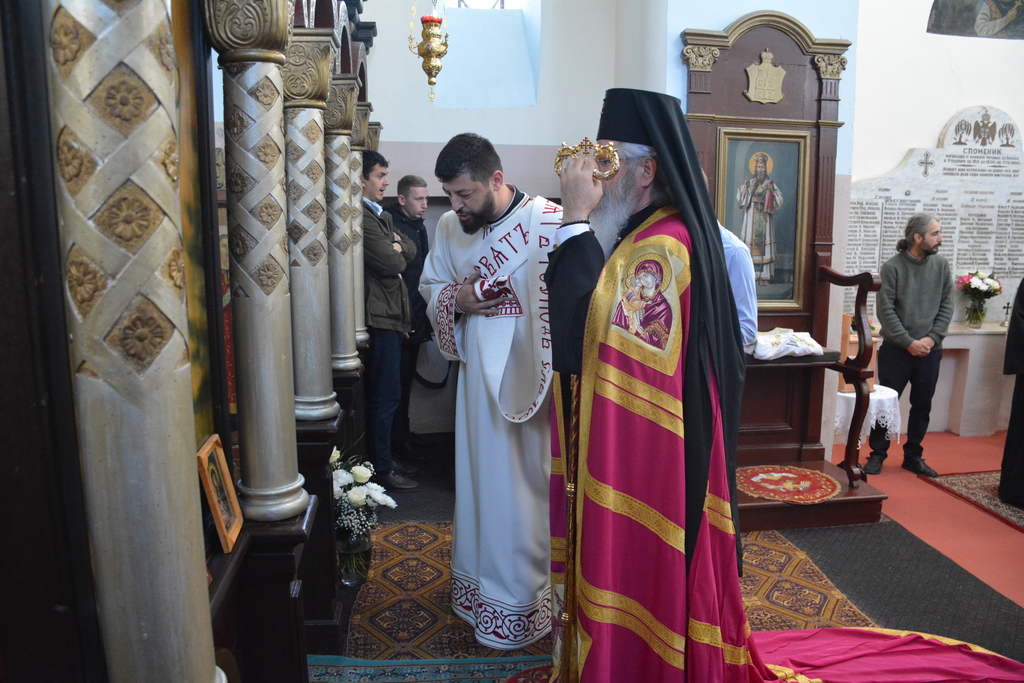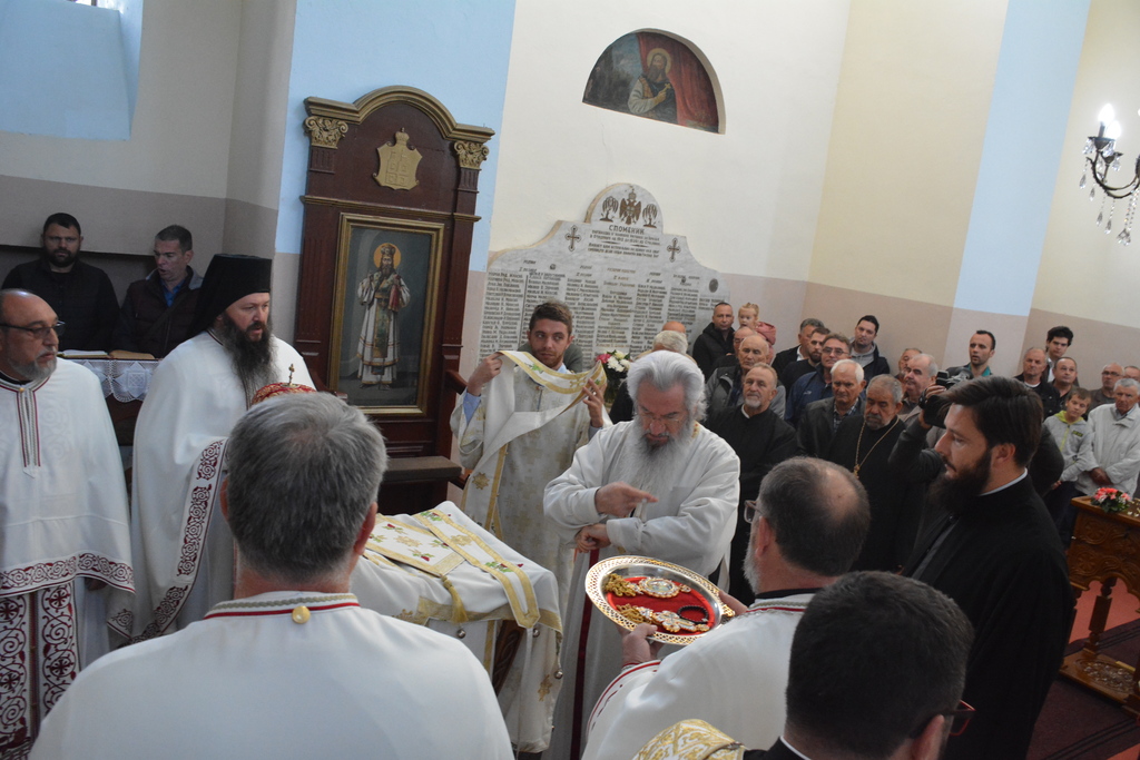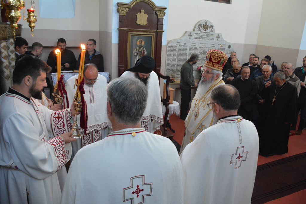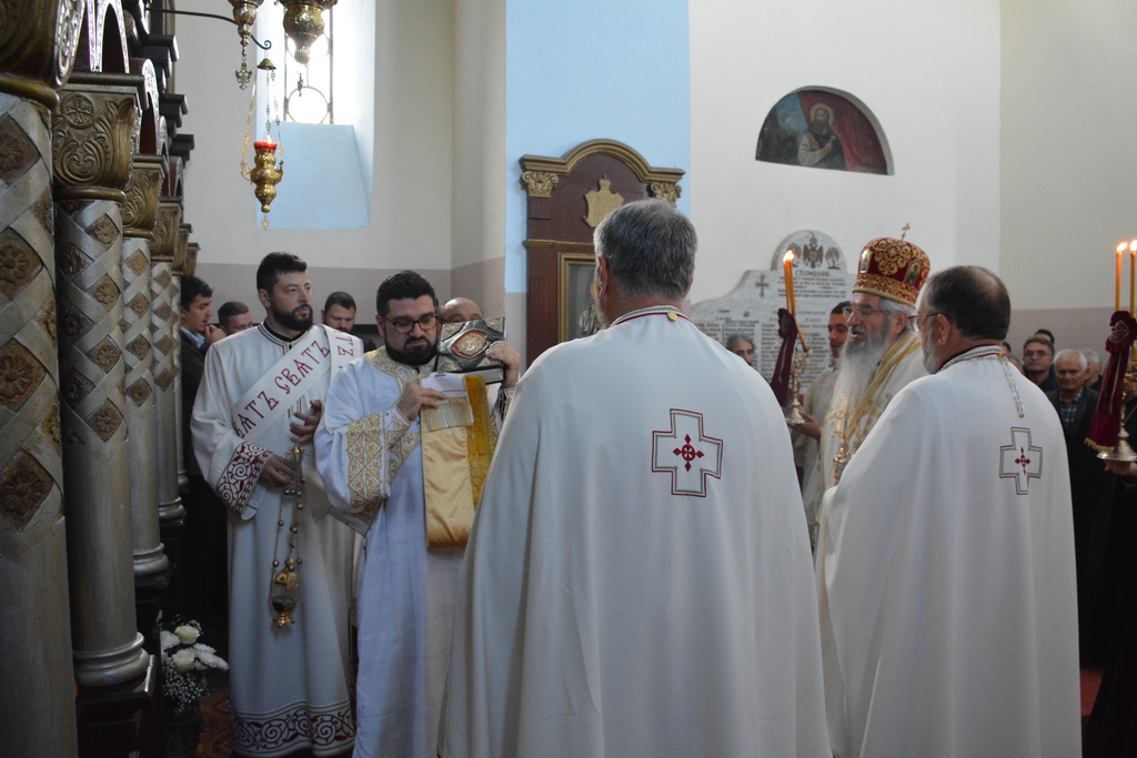 Шта то човек може да подари и принесе Богу? Ништа. Ми ћемо данас који смо се овде сабрали казати да смо данас принели свећу, просфору, кандило, или било шта. Добро јевто и тако и треба, али браћо и сестре, то Богу не треба, јер он је Пуноћа. Али треба нама и ми то чинимо због нас. И наше молитве нису Богу потребне, али су потребне ради нас, да ми молитвом умилостивимо Бога да нам Бог буде милостив. Све што чинимо ми заправи чинимо не ради Бога, већ ради себе. Све ово што ми приносимо јесу средства преко којих долазимо до Бога. И наш труд када је искрен и када је поштен онда Бог тај труд и награђује, ако га чинимо из смирења, а не само узгред. Зато Литургија тражи целога човека, а не човека који је само на Литургији присутан телом, а дух му тамо негде. Богу смо ми најпотребнији, јер је Он ради нас и дошао у овај свет зато што воли човека. И зато Бог не жели да допусти да било ко од нас страда, погине духовно. Бог неће ни да природа пропадне, творевину је створио како би нас што више приближио себи, како би ми кроз ову лепоту творевине Божије сагледали силу Божију, моћ Божију и љубав Божију. Творевина се преко човека спасава и она уздише када је човек окрене леђа. А, како тек Бог уздише када му ми окренемо леђа. Бог хоће нас који му се у миру обраћамо и у миру живимо са Њиме и једне са другима, са ближњима. Тај Божији мир ми осећамо свуда, ако имамо веру, а највише тај мир осећамо на Божанственој Литургији. Неопходно је да Света Литургија од почетка сија светлошћу Свете Тројице. Литургија је Светлост и зато свештеник и започиње Свету Литургију славословећи Свету Тројицу. Она је откривење Царства Небескога, али је она у исти мах и Тајна Христовог доласка. Она нам открива Ваплоћеног Бога, јер Његов долазак јесте то Царство Небеско. Христос се јавља управо кроз Свете Тајне које се свршавају на Божанственој Литургији. Литургијски Христов долазак што и јесте евхаристијска, приношена благодарна Тајна прображава земљу у небо. Она спуста небо на земљу и земљу уздиже на небо. Сви заједно служимо Литургију са Богом, али са нама саслужују и анђели и арханђели, браћо и сестре. Тако храм, у коме се сабирају верници да би исказали благодарење Господу, постаје обиталиште анђела и арханђела. И када би нам се отворио тај духовни вид видели би смо да је овај храм пун анђела и светитеља Божијих. Зато нам треба, као што рекох, тај духовни хришћански живот, да сагледамо оно што не можемо сагледати нашим телесним очима. Литургија се служи у миру, у миру са Богом, са собом и једних са другима. У миру Господу да се помолимо, тј. са миром. А тај мир, прави мир, јесте једино мир Божији, вишњи мир. Ако смо узнемирени онда нећемо да осетимо дејство благодати Божије које нам се даје управо кроз свете Тајне и свете врлине. Мир који је човек примио као благодатни дар од Бога управо је онај мир који човек поново прима живећи поред Бога, живећи Литургијом, живећи Јеванђељем, живећи Христом. Јер ништа друго не доноси мир нашој души као познање Бога и стицање врлина. Нека нам Господ помогне да живимо у миру са Богом, са собом и једних са другима”, рекао је Епископ Јован.