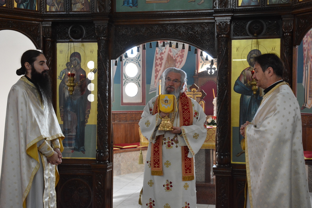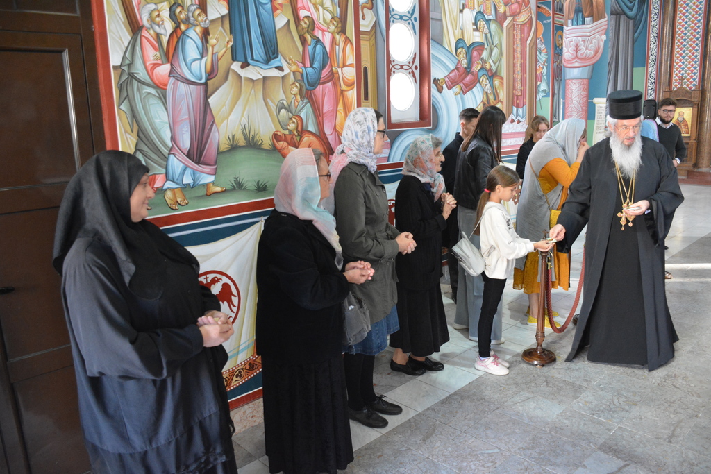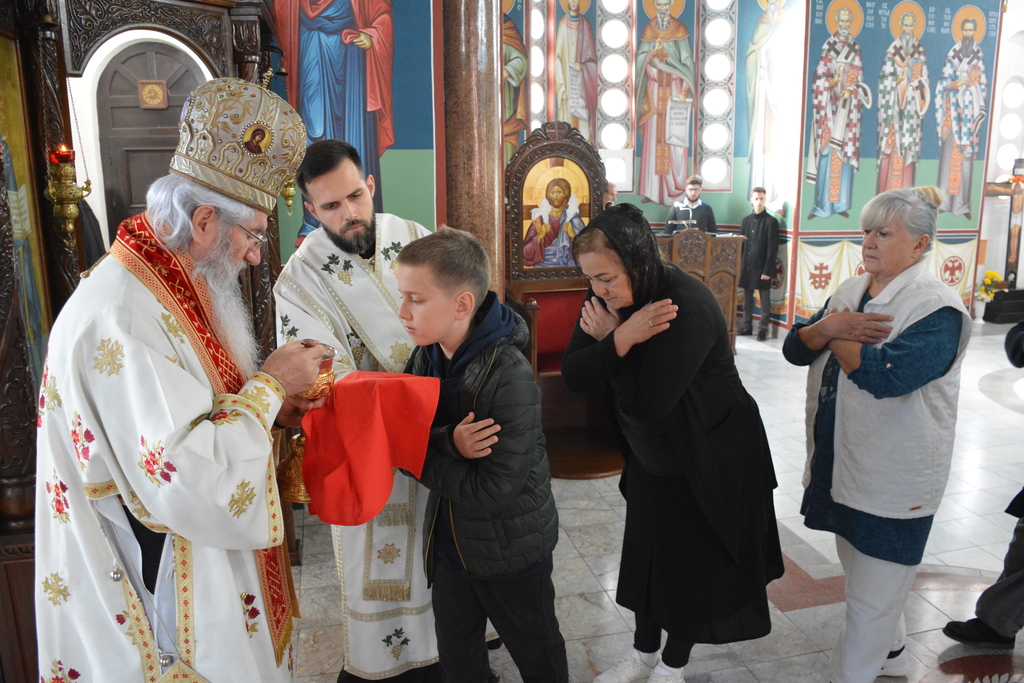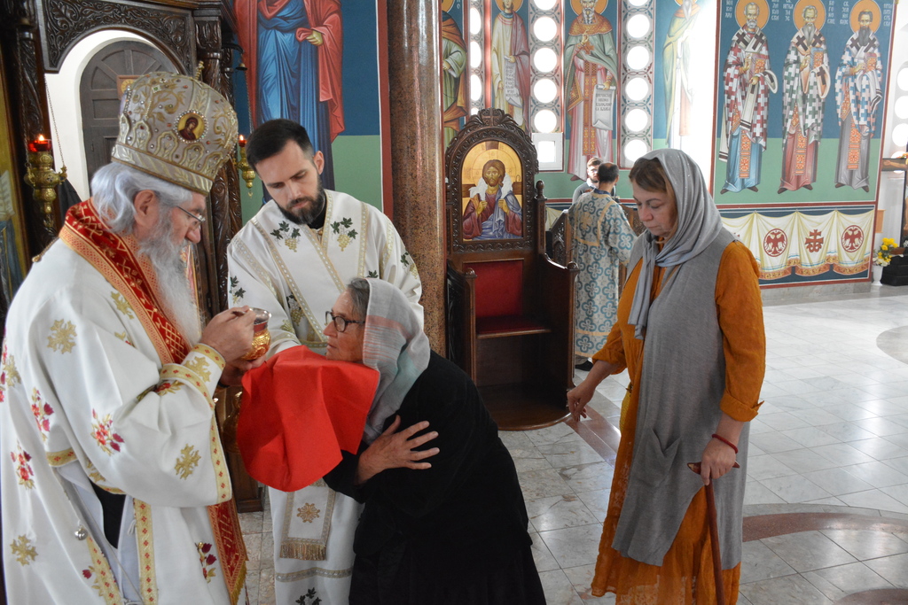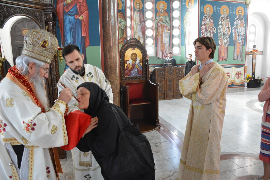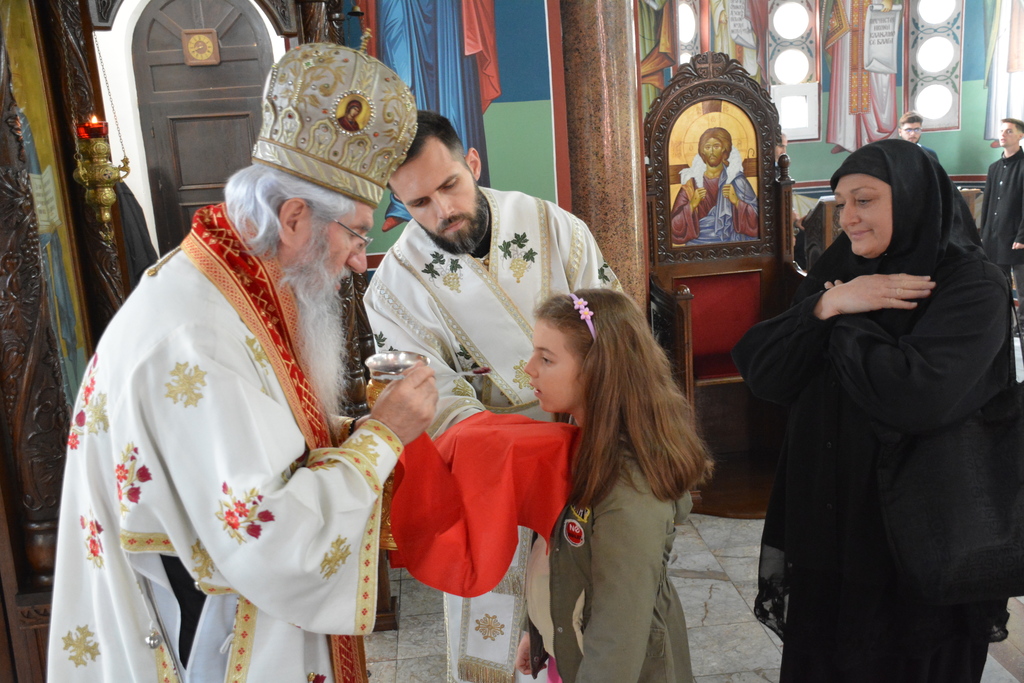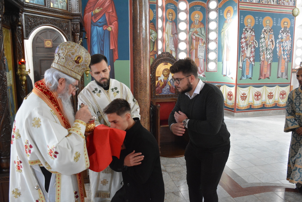 У наставку Преосвећени је причестио верни народ Телом и Крвљу Господњом и подсетио све верне на један поучан пример из живота Светог Владике Николаја, на духовно укрепљење и радост: „Када је владика Николај рукоположио једног младог свештеника у Македонији и поставио у неком месту, и овај мученик у току дана је бивао на парохији, али ноћу када би се звери чуле побегао би. И дошао је код светог Владике у Охрид и каже: „Свети Владико не смем да живим овде, моја жена и деца се плаше“. Владика га саветује као да је то ватрено крштење, да треба да победи себе, да се моли, и он тако охрабрен речима Владике Николаја оде и опет побегне. И тако је чинио неколико пута, и он је наставио да долази код владике само да га премести, мислећи да ће на другом месту да му буде боље. На крају владика Николај кад је он дошао он му да неку књигу да чита и не разговара са њим. И овај када је схватио и када је видео да он има борбу у себи, Владика Николај је клекнуо пред иконом Христовом и казао: „Боже опрости ми што сам овог човека рукоположио за свештеника када њему ни благодат Твоја није довољна“. Чувши овај свештеник узео је благослов, отишао у своју парохију, и додао је после Владика Николај да је тај свештеник остао на том месту све време свештеничке службе и Владика додаје и каже та парохија није била парохија, то је био прави монашки манастир.“