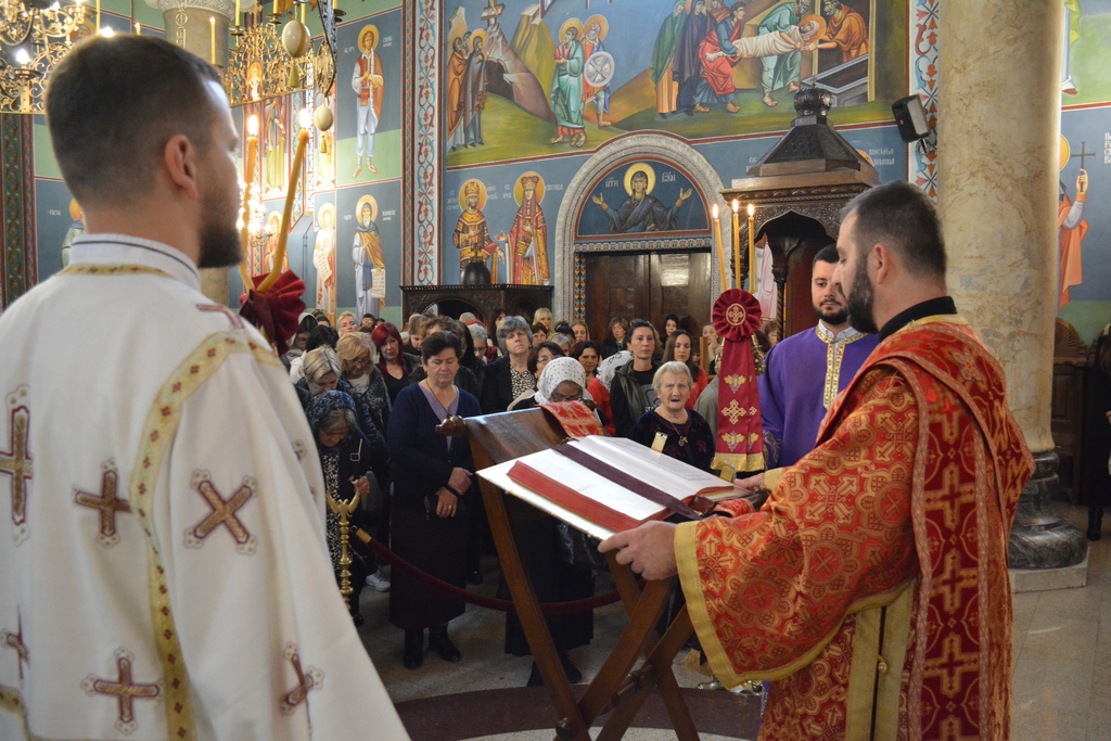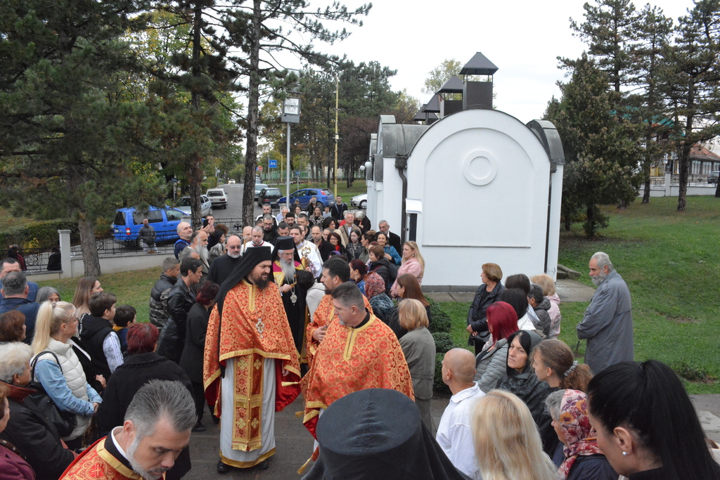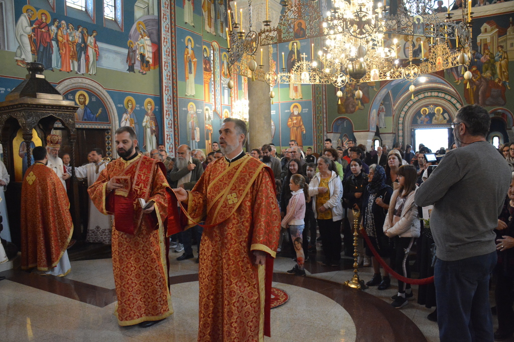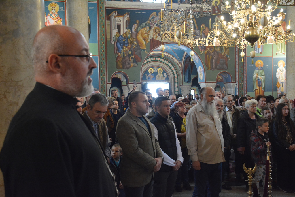 Срећан празник! Срећна слава овога храма! Срећна слава братству и свима који смо се данас сабрали да прославимо патрона овога Храма. Срећна слава и свима који Светог Димитрија славе као своју крсну славу! Данас смо се сабрали у овоме храму да прославимо великог угодника Божијег и страдалника за веру хришћанску, великог молитвеника Светог великомученика Димитрија мироточивог чудотворца! Сабрали смо се да се Богу молимо и да се у својим молитвама сетимо Светог великомученика Димитрија и да га замолимо да се он моли Богу за нас: да останемо народ Божији, да нас сачува од искушења, да се он моли Богу за нас да очувамо своју веру, онако како је он очувао у оно тешко време када је вера била гоњена и прогоњена. Да се он моли Богу за нас јер је неопходно да се увек и изнова молитвима обраћамо Богу и светитељима. Молитва је непрестано призивање Бога да Он буде са нама. А да би он био са нама треба да му се молимо и да верујемо да Бог постоји, да је Бог љубав, да је милостив, да је срцезналац наш и да Он боље зна наша срца него што ми сами знамо. Да је Бог свевидљив. Види Бог наше невоље и муке, али види и нашу радост кад се радујемо у Богу. Види Бог и када ми страдамо браћо и сестре. Човек кад има неко искушење мисли да га је Бог заборавио. Није га Бог заборавио. Никога од нас неће заборавити у колико ми не заборавимо Бога. Може ли родитељ да заборави дете? Па не може браћо и сестре! Па чак и да није добро дете јер је то тело од његовог тела, крв од његове крви! Чак прави родитељ за оно неваљало дете више брине, јер оно што је добро то је ту код њега. А ми браћо и сестре када год грешимо, ми се удаљавамо од Бога. Грех је тај који нас удаљава од Бога. Тада се ми удаљимо и од оца и од мајке, брата, сестре, комшије, пријатеља. Удаљујемо се јер смо у ствари са таквим животом потиснули Бога и себе. Али није нас Бог потиснуо из Себе! То треба да знамо да када поклекнемо у своме животу, а живот је такав да носи разне прилике, Бог је ту. Он само тражи да ми покажемо веру! Да верујемо и да пожелимо да нам Бог помогне да устанемо. Јер свако зло које учинимо то је наш пад. Човек кад пада, он се често и повреди. Од пада зависи и његова повреда. Ако је већи пад већа је и повреда и шта тада треба? Треба му помоћник да му помогне да устане. Често говорим, нема провалије у коју човек може да падне а да се Бог неће сагнути да га подигне. Ако се Бог толико смири за створење да не пропадне а како ми да се не смиримо пред Богом. Зашто се ми онда не смиримо једни према другима. Неко ће казати ја се пред Богом смиравам, а не могу да се смирим пред другим неким. Смири се ти човече пред човеком без обзира какав је јер ми у сваком човеку треба да видимо икону Божију! Човек када га обузме гордост, сујета, тај човек не само што не види Бога јер му је духовни вид ослепљен, него не види и другога човека. Он је себе толико уздигао и долази у такво стање да каже без мене свет не може да постоји. Пазите колико човек може да оде далеко, кад човек себе замени Богом. То је најстрашније! То је највећи пад човеков. Али ни тада Бог не оставља човека! Како да га остави кад се због човека родио, пролио крв Своју, претрпео све због нас и због нашега спасења! Опет понављам и кад паднемо треба да се сетимо Бога. И кад грешимо да се мало зауставимо. Како каже стара пословица: ,,И кад си мајка, покриј се". Значи, признај да си грешан. Признај да грешиш. Т