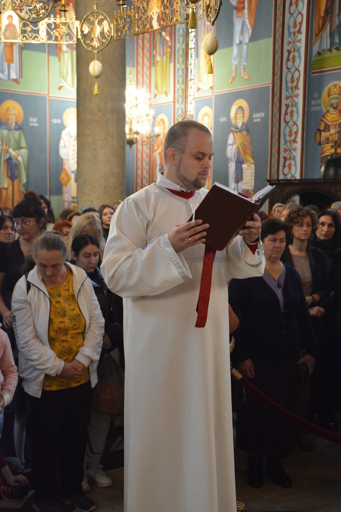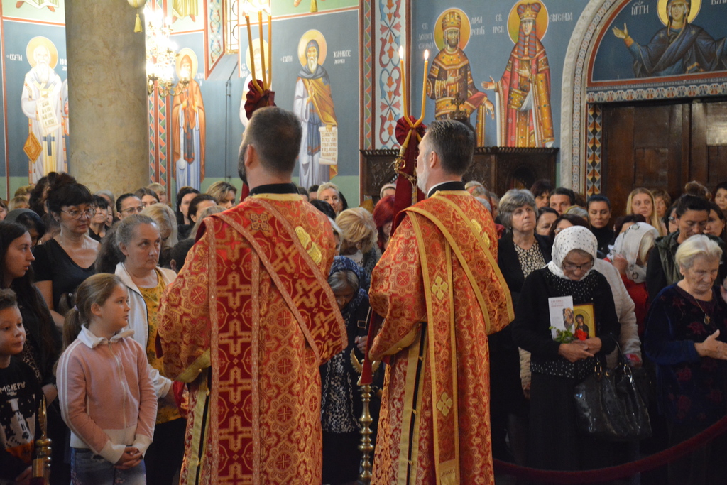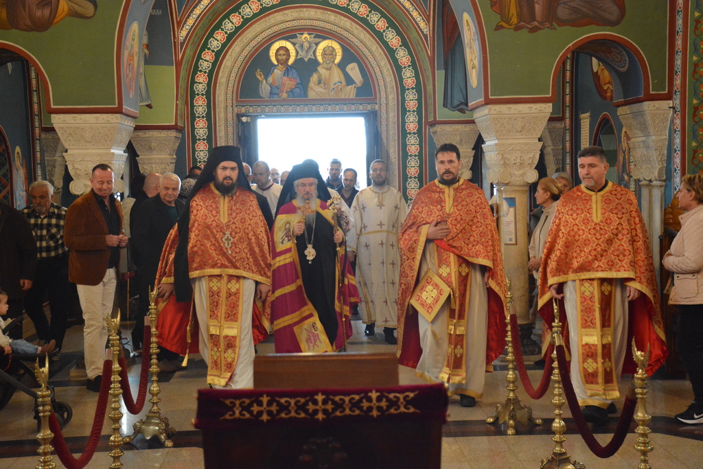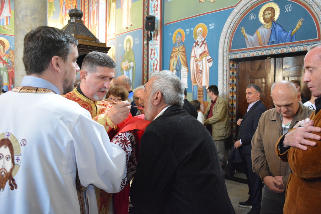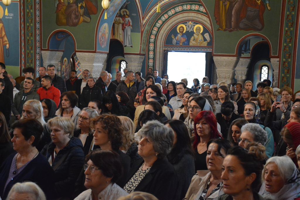 Срећан празник! Срећна слава овога храма! Срећна слава братству и свима који смо се данас сабрали да прославимо патрона овога Храма. Срећна слава и свима који Светог Димитрија славе као своју крсну славу! Данас смо се сабрали у овоме храму да прославимо великог угодника Божијег и страдалника за веру хришћанску, великог молитвеника Светог великомученика Димитрија мироточивог чудотворца! Сабрали смо се да се Богу молимо и да се у својим молитвама сетимо Светог великомученика Димитрија и да га замолимо да се он моли Богу за нас: да останемо народ Божији, да нас сачува од искушења, да се он моли Богу за нас да очувамо своју веру, онако како је он очувао у оно тешко време када је вера била гоњена и прогоњена. Да се он моли Богу за нас јер је неопходно да се увек и изнова молитвима обраћамо Богу и светитељима. Молитва је непрестано призивање Бога да Он буде са нама. А да би он био са нама треба да му се молимо и да верујемо да Бог постоји, да је Бог љубав, да је милостив, да је срцезналац наш и да Он боље зна наша срца него што ми сами знамо. Да је Бог свевидљив. Види Бог наше невоље и муке, али види и нашу радост кад се радујемо у Богу. Види Бог и када ми страдамо браћо и сестре. Човек кад има неко искушење мисли да га је Бог заборавио. Није га Бог заборавио. Никога од нас неће заборавити у колико ми не заборавимо Бога. Може ли родитељ да заборави дете? Па не може браћо и сестре! Па чак и да није добро дете јер је то тело од његовог тела, крв од његове крви! Чак прави родитељ за оно неваљало дете више брине, јер оно што је добро то је ту код њега. А ми браћо и сестре када год грешимо, ми се удаљавамо од Бога. Грех је тај који нас удаљава од Бога. Тада се ми удаљимо и од оца и од мајке, брата, сестре, комшије, пријатеља. Удаљујемо се јер смо у ствари са таквим животом потиснули Бога и себе. Али није нас Бог потиснуо из Себе! То треба да знамо да када поклекнемо у своме животу, а живот је такав да носи разне прилике, Бог је ту. Он само тражи да ми покажемо веру! Да верујемо и да пожелимо да нам Бог помогне да устанемо. Јер свако зло које учинимо то је наш пад. Човек кад пада, он се често и повреди. Од пада зависи и његова повреда. Ако је већи пад већа је и повреда и шта тада треба? Треба му помоћник да му помогне да устане. Често говорим, нема провалије у коју човек може да падне а да се Бог неће сагнути да га подигне. Ако се Бог толико смири за створење да не пропадне а како ми да се не смиримо пред Богом. Зашто се ми онда не смиримо једни према другима. Неко ће казати ја се пред Богом смиравам, а не могу да се смирим пред другим неким. Смири се ти човече пред човеком без обзира какав је јер ми у сваком човеку треба да видимо икону Божију! Човек када га обузме гордост, сујета, тај човек не само што не види Бога јер му је духовни вид ослепљен, него не види и другога човека. Он је себе толико уздигао и долази у такво стање да каже без мене свет не може да постоји. Пазите колико човек може да оде далеко, кад човек себе замени Богом. То је најстрашније! То је највећи пад човеков. Али ни тада Бог не оставља човека! Како да га остави кад се због човека родио, пролио крв Своју, претрпео све због нас и због нашега спасења! Опет понављам и кад паднемо треба да се сетимо Бога. И кад грешимо да се мало зауставимо. Како каже стара пословица: ,,И кад си мајка, покриј се". Значи, признај да си грешан. Признај да грешиш. Т
