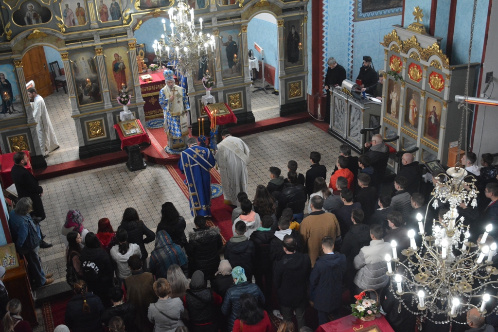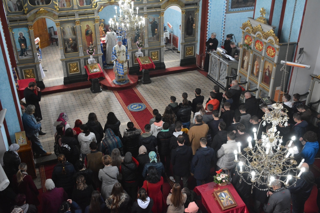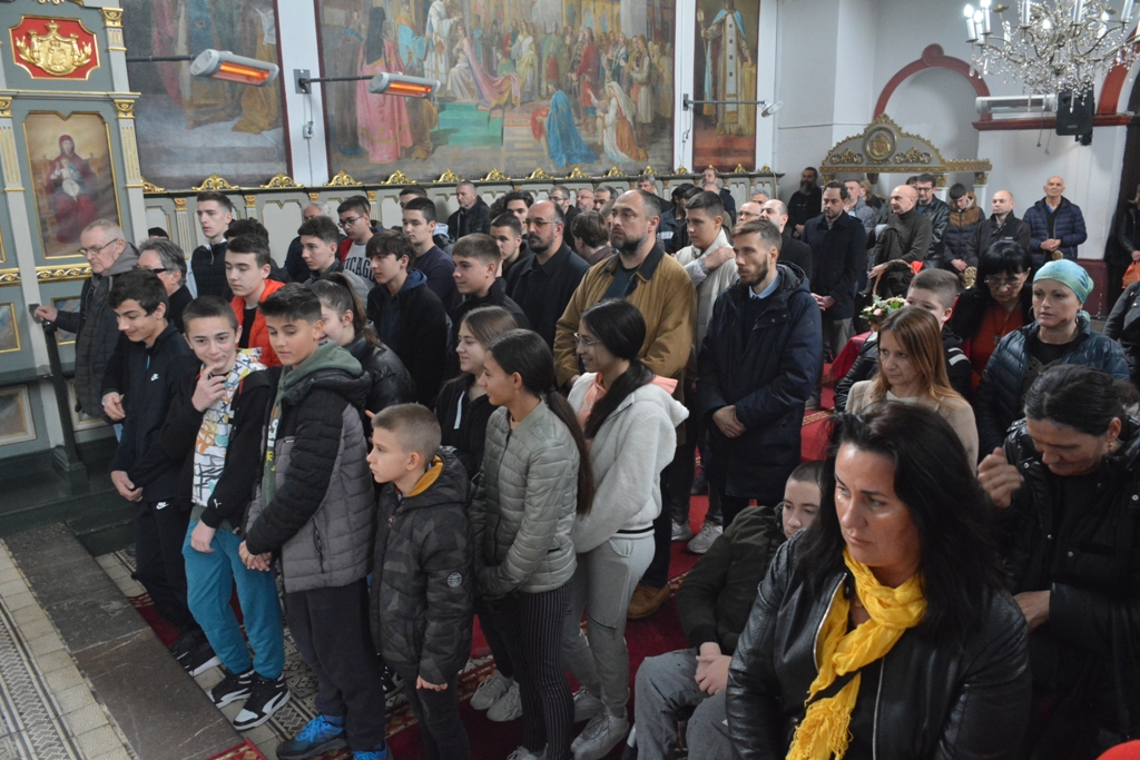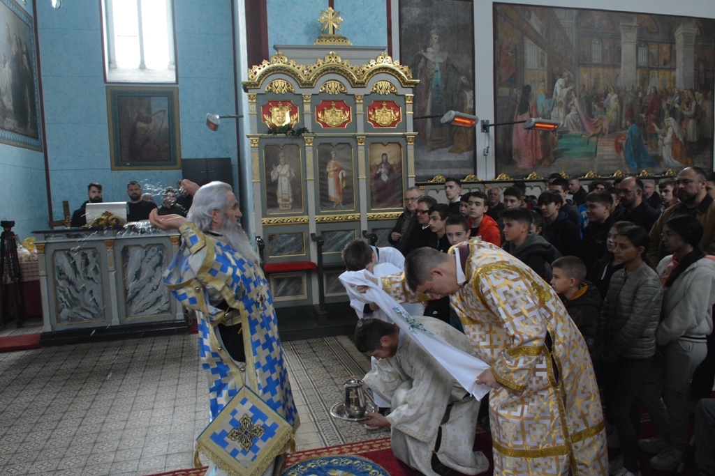 Браћо и сестре, нека је благословено ово наше данашње сабрање у овом Светом храму, где смо се сабрали да служимо Божанствену Литургију. У Литургији се молимо да нам Господ опрости грехе и да нас спасе. Литургија нам говори оно што је најважније у нашем животу, и не само овом животу овде, него и оном вечном и бесконачном, а то је браћо и сестре да нас Литургија позива да горе уздигнемо срца. Позива нас на заједништво и због тога је Литургија једна и једина молитва. Литургија нас позива да благодаримо Богу, а имамо зашта да благодаримо Богу. Онај човек који не зна да благодари, није прави човек. Јер ми браћо и сестре, када је у питању благодарност према Богу, благодаримо за сва дела која нам Бог даје у животу, и знана и незнана. Благодаримо за добром, али благодаримо и када наиђу невоље, муке, патње, искушења. Све је то благослов Божији, и треба као благослов Божији да прихватимо, јер кроз све то Господ хоће да провери нашу веру у Бога, наше поверење у Бога, и нашу веру у заједницу. Зато је, браћо и сестре, Литургија дијалог, Литургија је разговор. То значи да оно што тражимо на то и да одговоримо, и оно што нам се даје, како кажу Свети Оци да одговоримо са амин, то значи нека буде тако. Литугија је усвари наш мир. Зато ћете видети да неколико пута се у Литургији свештенослужитељ се обраћа народу и говори мир. Јер где има мира има и молитве, а где нема мира ту нема ни праве молитве. То је она молитва што би ми рекли успут или узгред, али где има тог постојаног мира онда ту има и љубави. Нама је мир потребан у свако доба, посебно нам је потребан душевни мир, од кога зависи наш спољашњи мир. Зато бих данас неку реч проговорио о том миру, позивајући се на речи апостола Павла које је он упутио филипљанима, а преко њих и свима нама хришћанима и онога и овога и будућег века, браћо и сестре. Он каже „Мир Божији који превазилази сваки ум сачуваће срца ваша и мисли ваше у Христу Исусу“, ако смо у миру са Богом онда смо у миру и са собом, ако смо у миру Богом и са собом, онда ћемо бити у миру са другима. Нама је потребан мир у свако време у свако доба, па и у овом времену у ком живимо, а живимо у времену у коме су многе вредности обезвређене,омаловажене. Живимо у времену у коме, нажалост, зло се труди да потире добро. Много се говори о пиру, много се пише о миру. Многи покушавају да дођу до мира, али смо сведоци да је све мање мира у човеку, у породици, у друштву, у држави, у Цркви, у свету браћо и сестре. Пишу се и многе књиге и давају се многе поуке како да се усели мир у нама, али понављам све је мање мира. Мира нема у нама и неће га бити ако га немамо у души својој. Да би човек имао мир у души својој, он заиста треба да живи јеванђелским животом, хришћанским животом. И заиста људи на све ово, људи често траже оправдања за оваква стања, и најчеше их траже тамо где их уствари нема. Јер мира без Бога нема и зато морамо тражити мир у себи. И зашто човек нема мира у себи и око себе? Зато што најчешће људи мисле да мир долази сам од себе, да мир треба да дође од другога, да мир треба да мени дође, а не да ја тражим мир. Треба да знамо да једини прави мир и спокојство долази од Бога и ако смо ми са Богом и ако је Бог са нама бићеи мира у нама. Тада ћемо осећати радост и када нас невоље снађу у животу. Међутим мира нема, понављам већ неколико пута, без Бога јер је сам Спаситељ рекао у Светом Јеванђељу „Мир свој дајем 